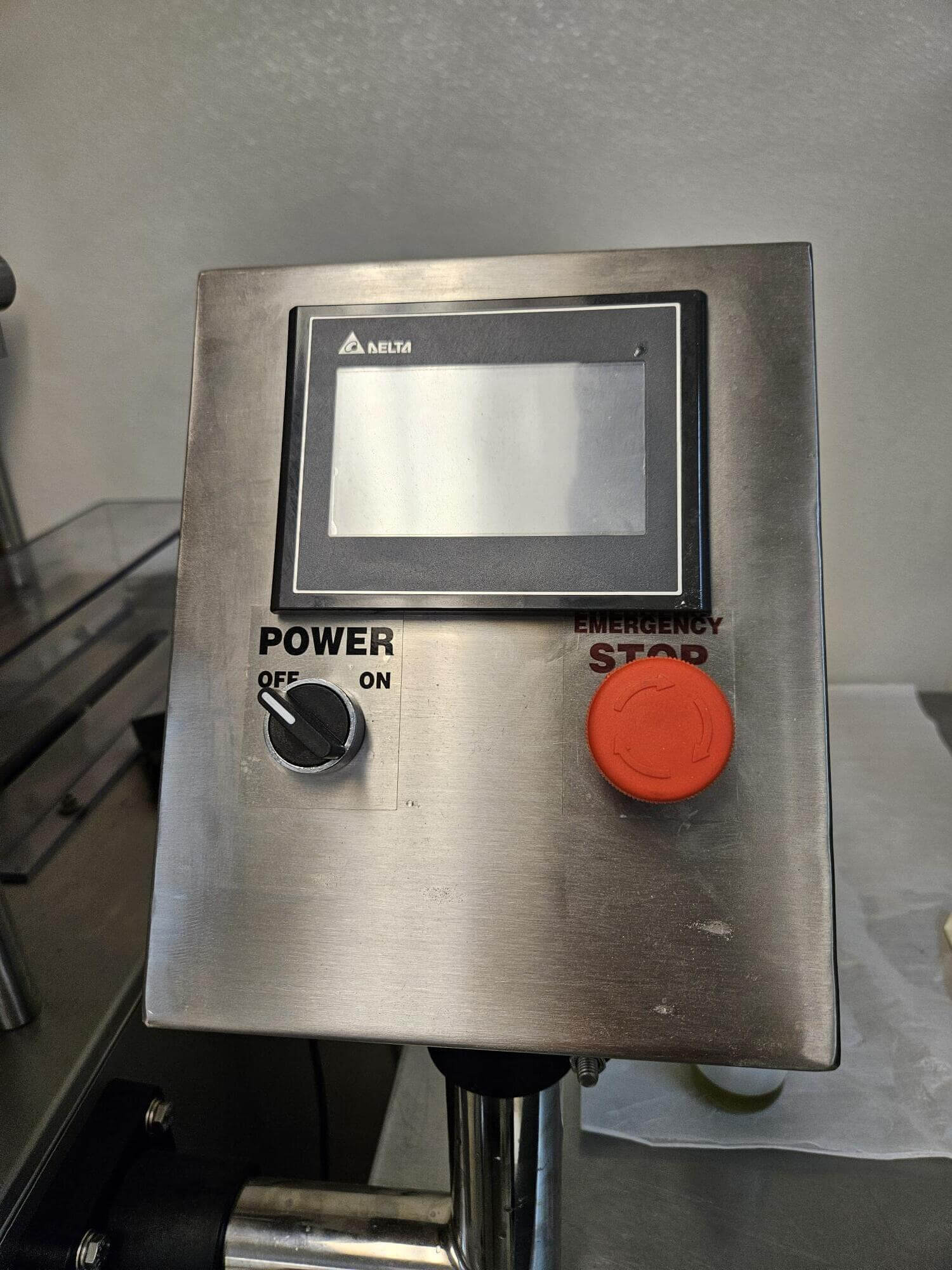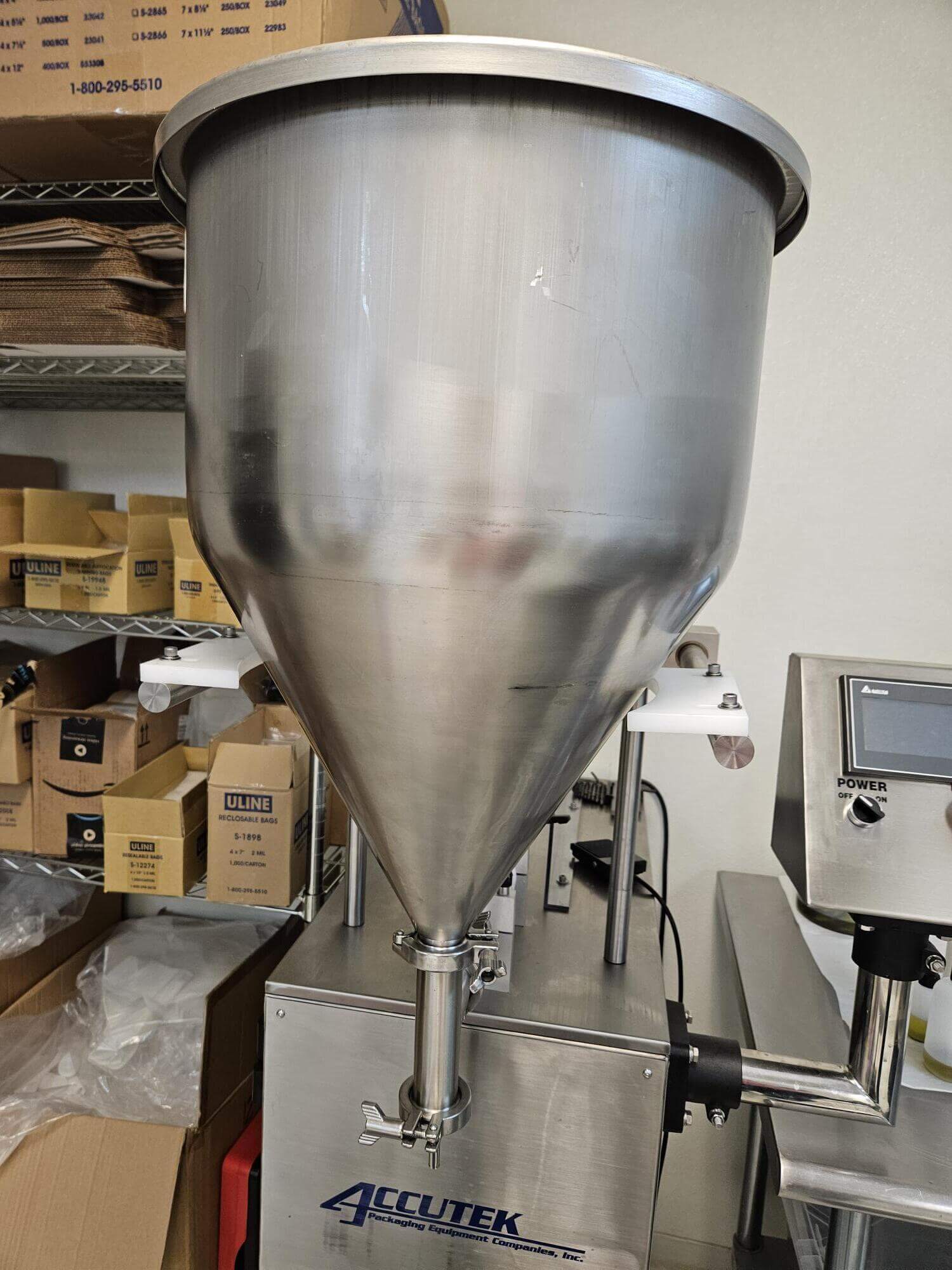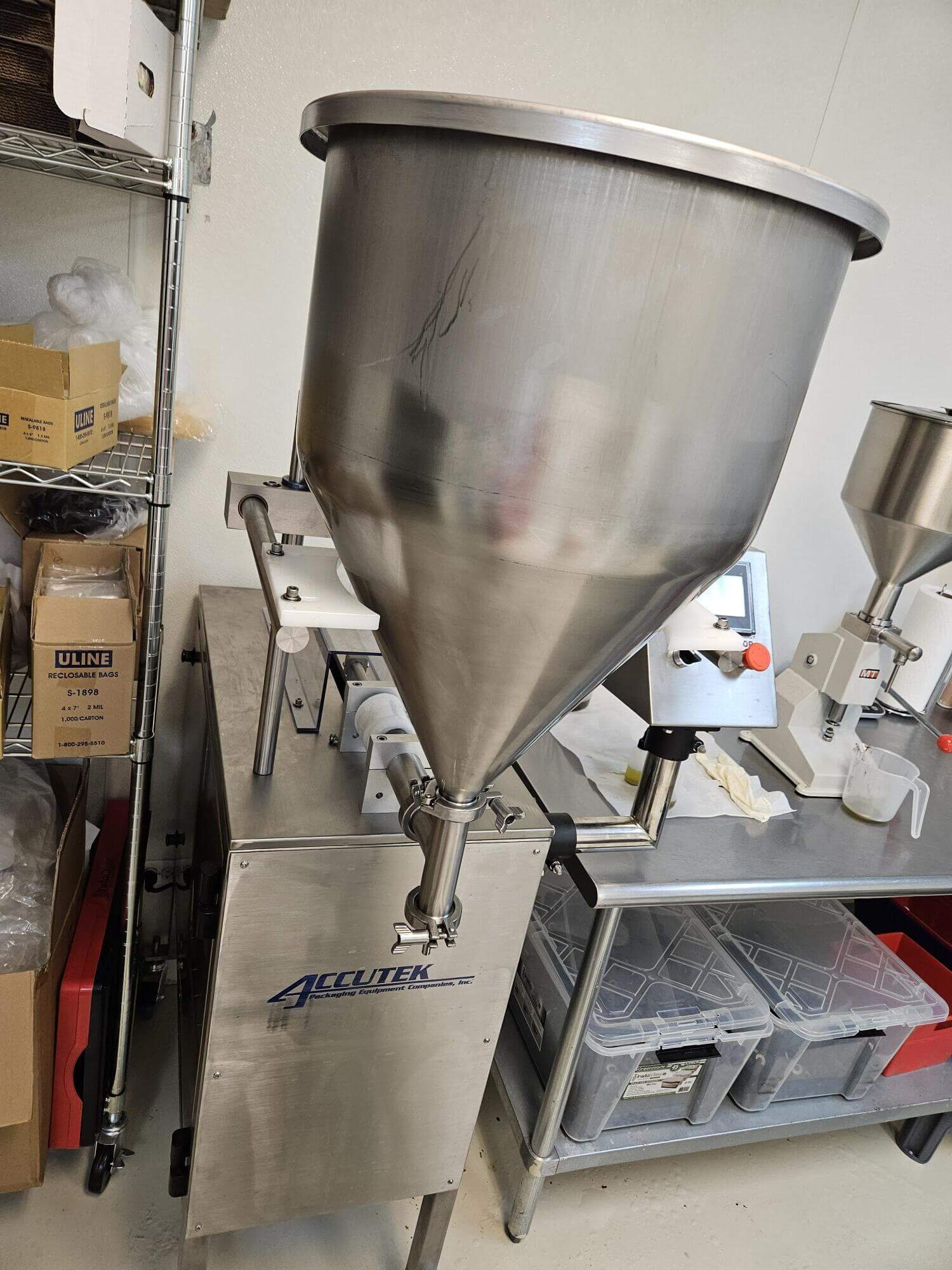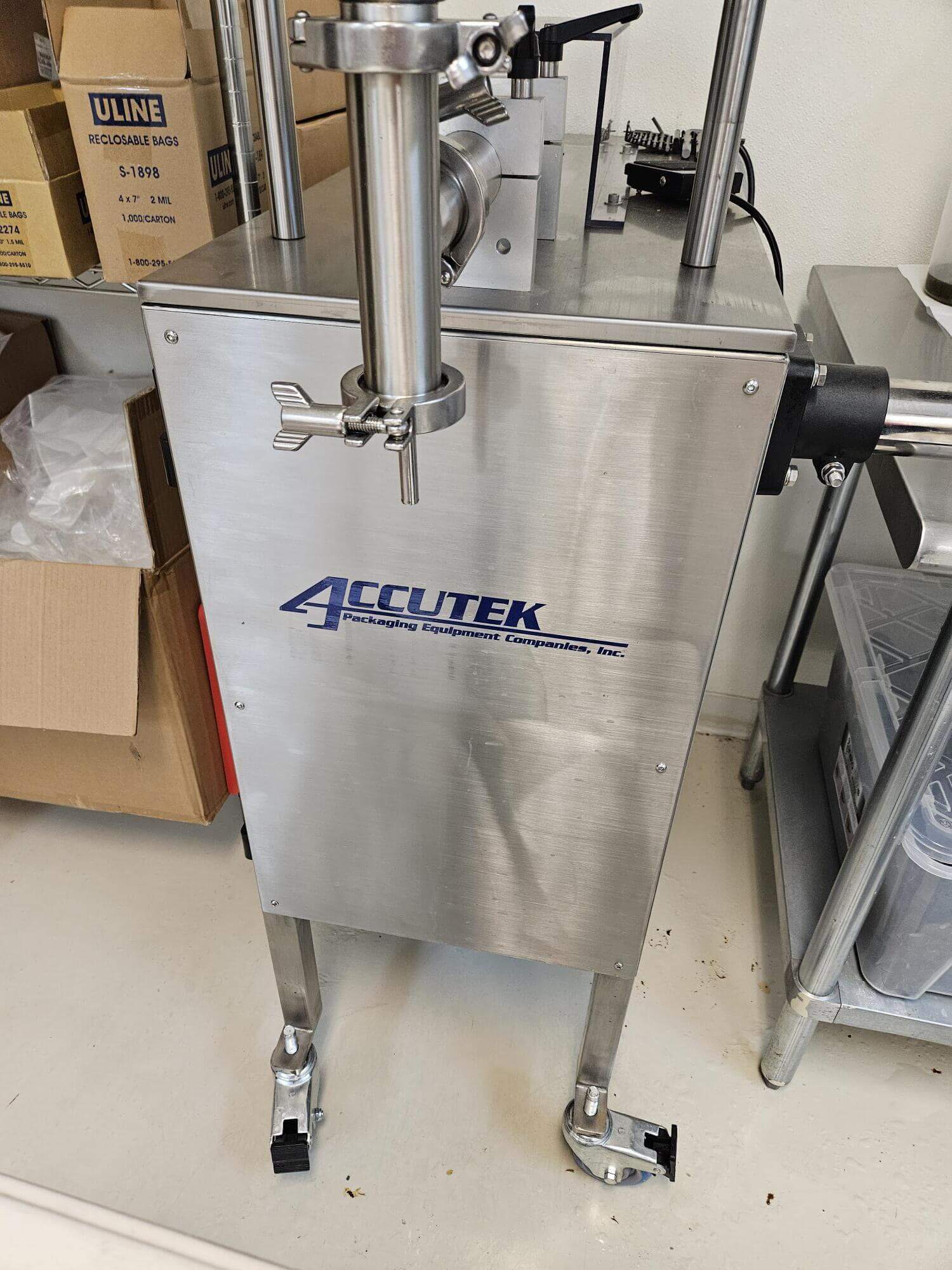 Accutek Servo Volumetric Filler. Stainless steel construction, servo-motor-driven piston filler for precise volumetric dosing with full touch-screen control of piston stroke and speed, multi-stroke dosing per container option, 110/1PH/60HZ, 5 Amps.