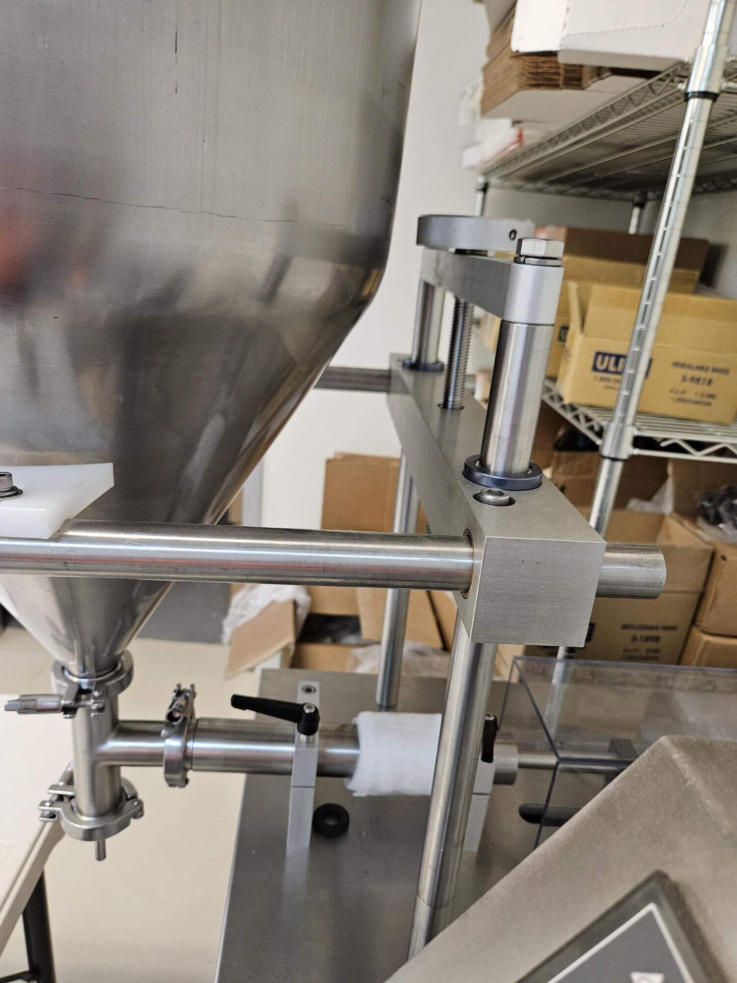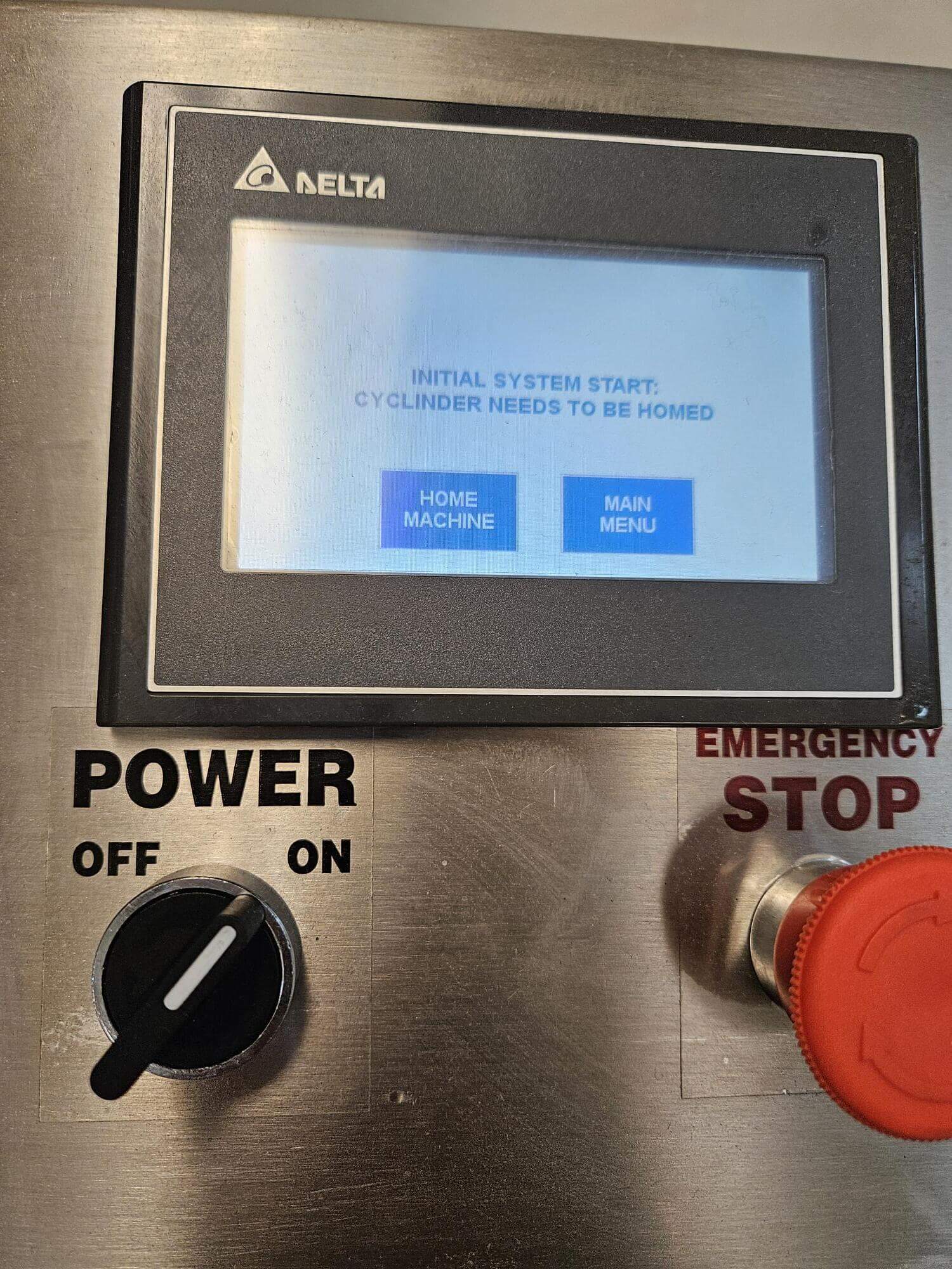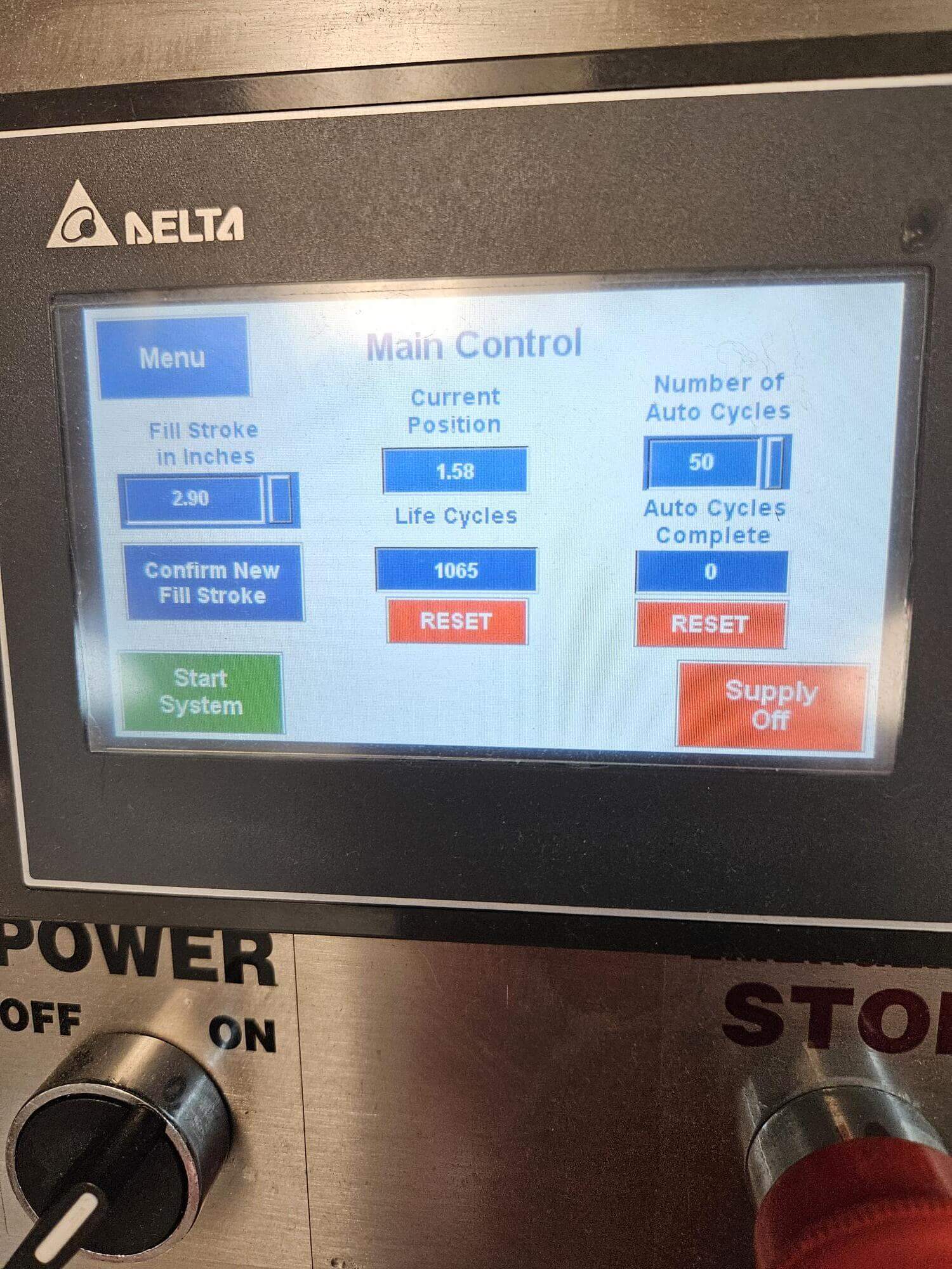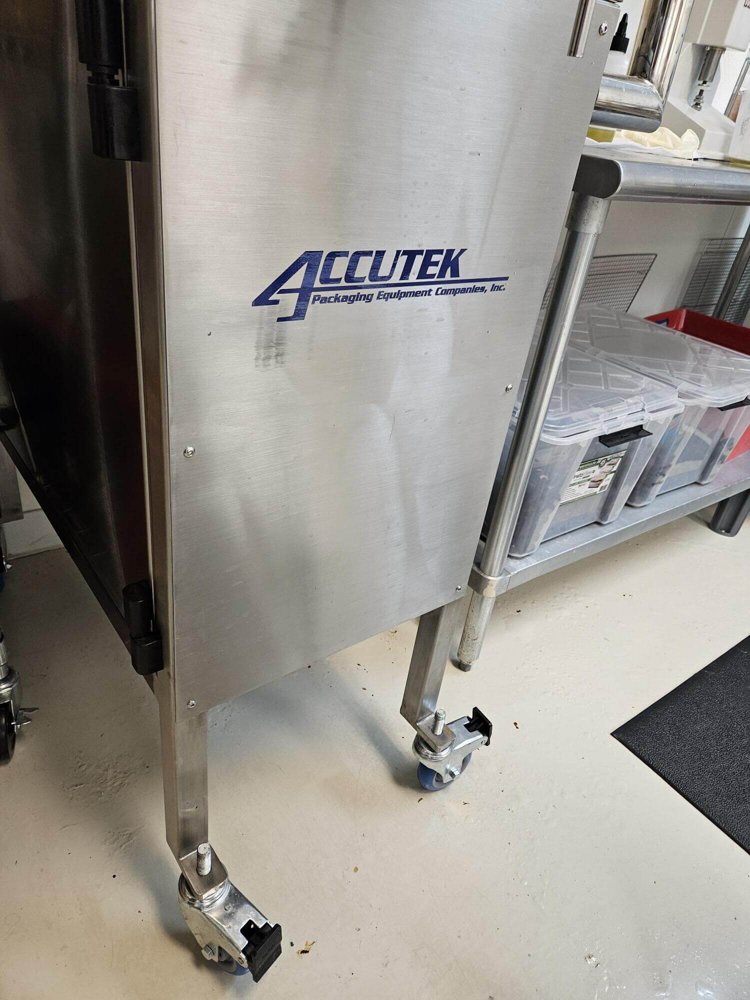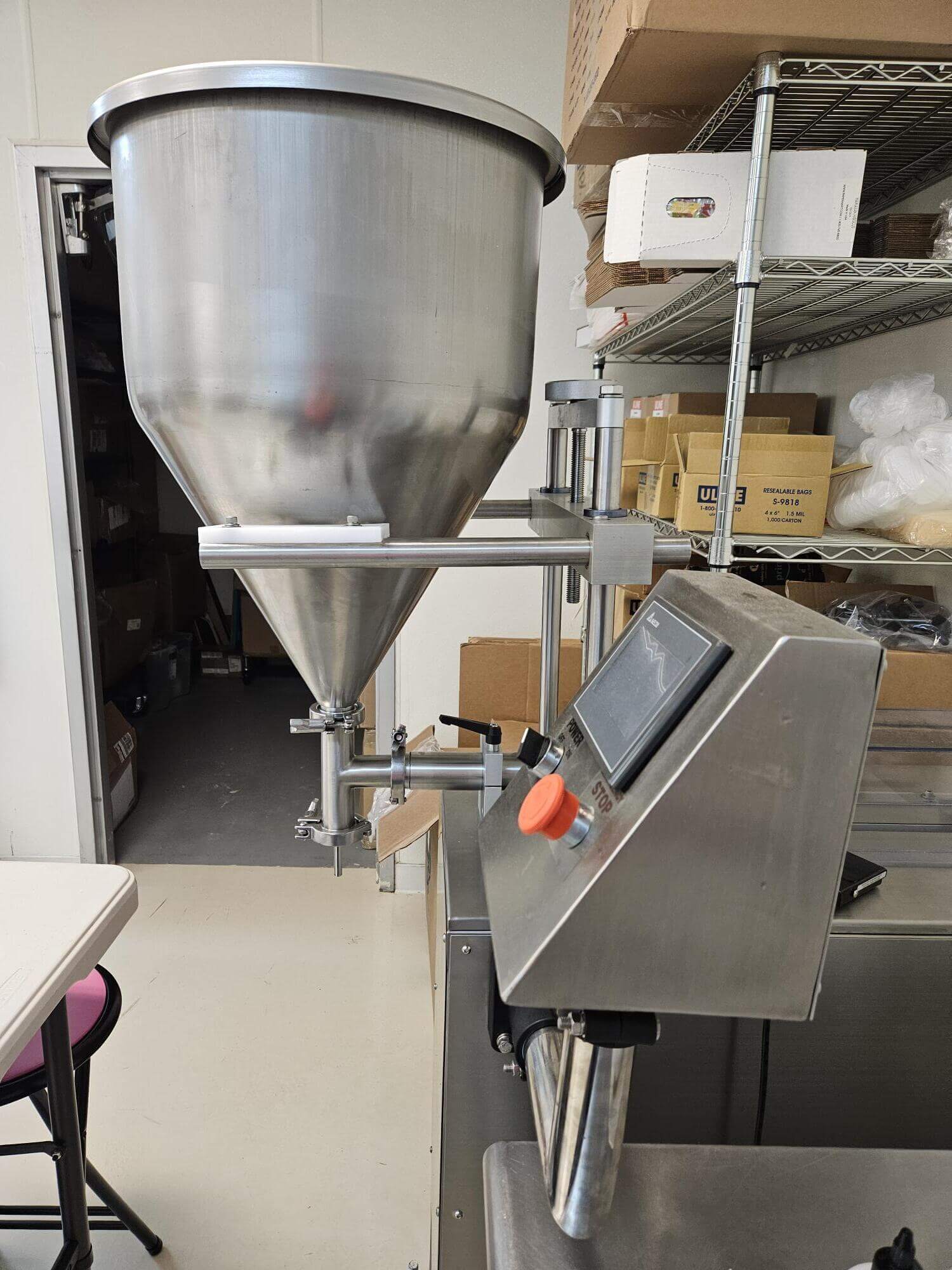 Accutek Servo Volumetric Filler. Stainless steel construction, servo-motor-driven piston filler for precise volumetric dosing with full touch-screen control of piston stroke and speed, multi-stroke dosing per container option, 110/1PH/60HZ, 5 Amps.