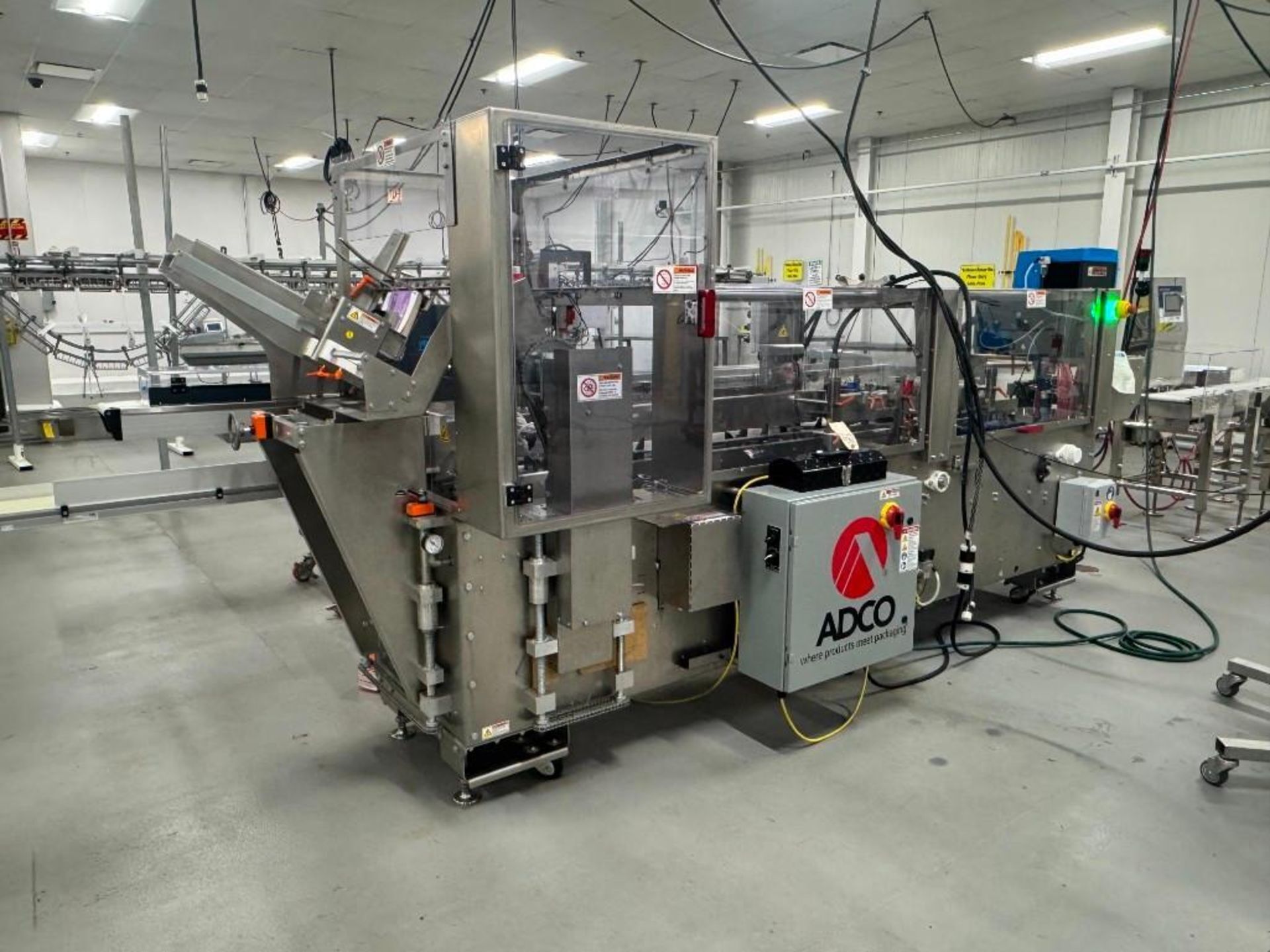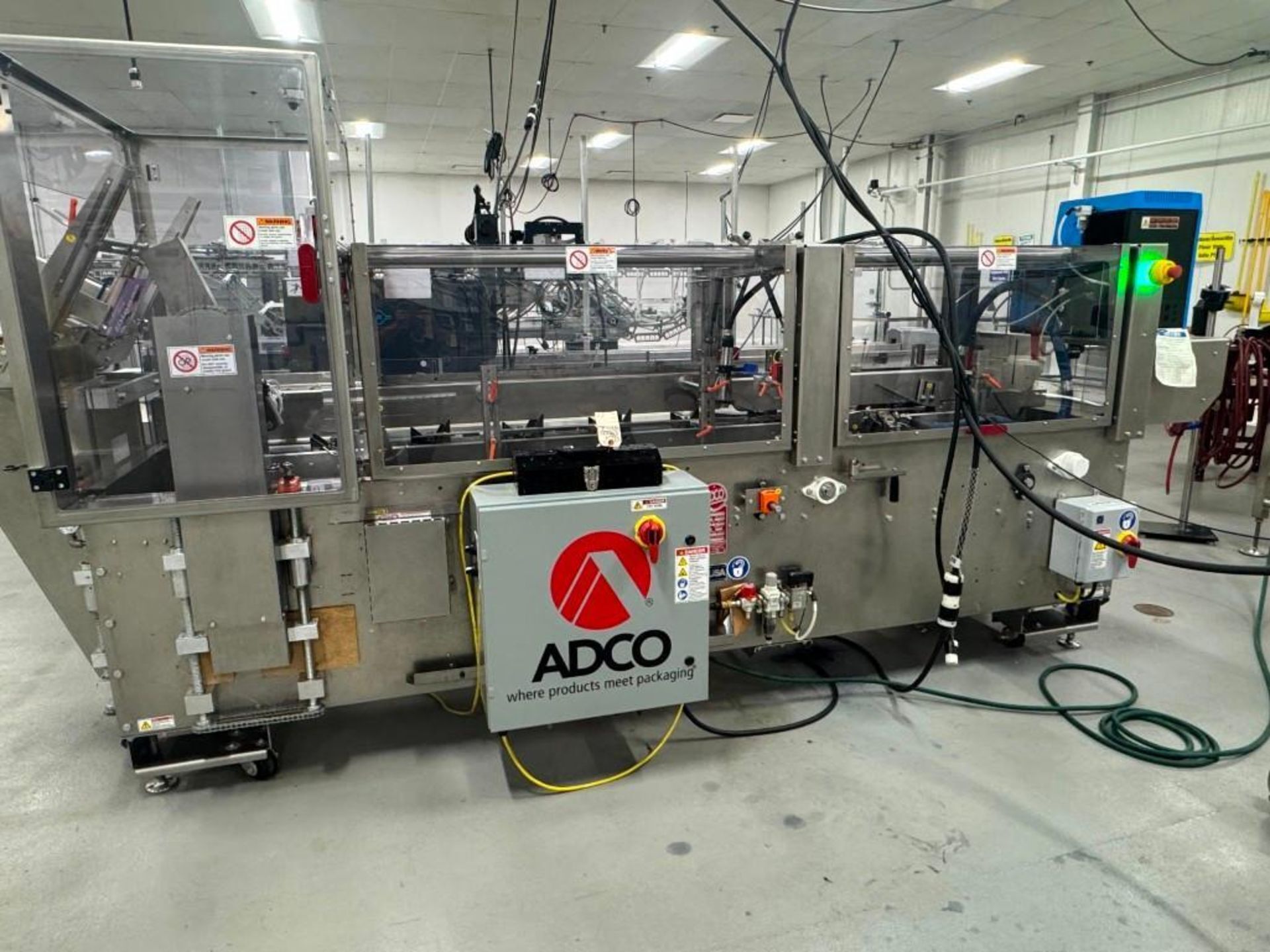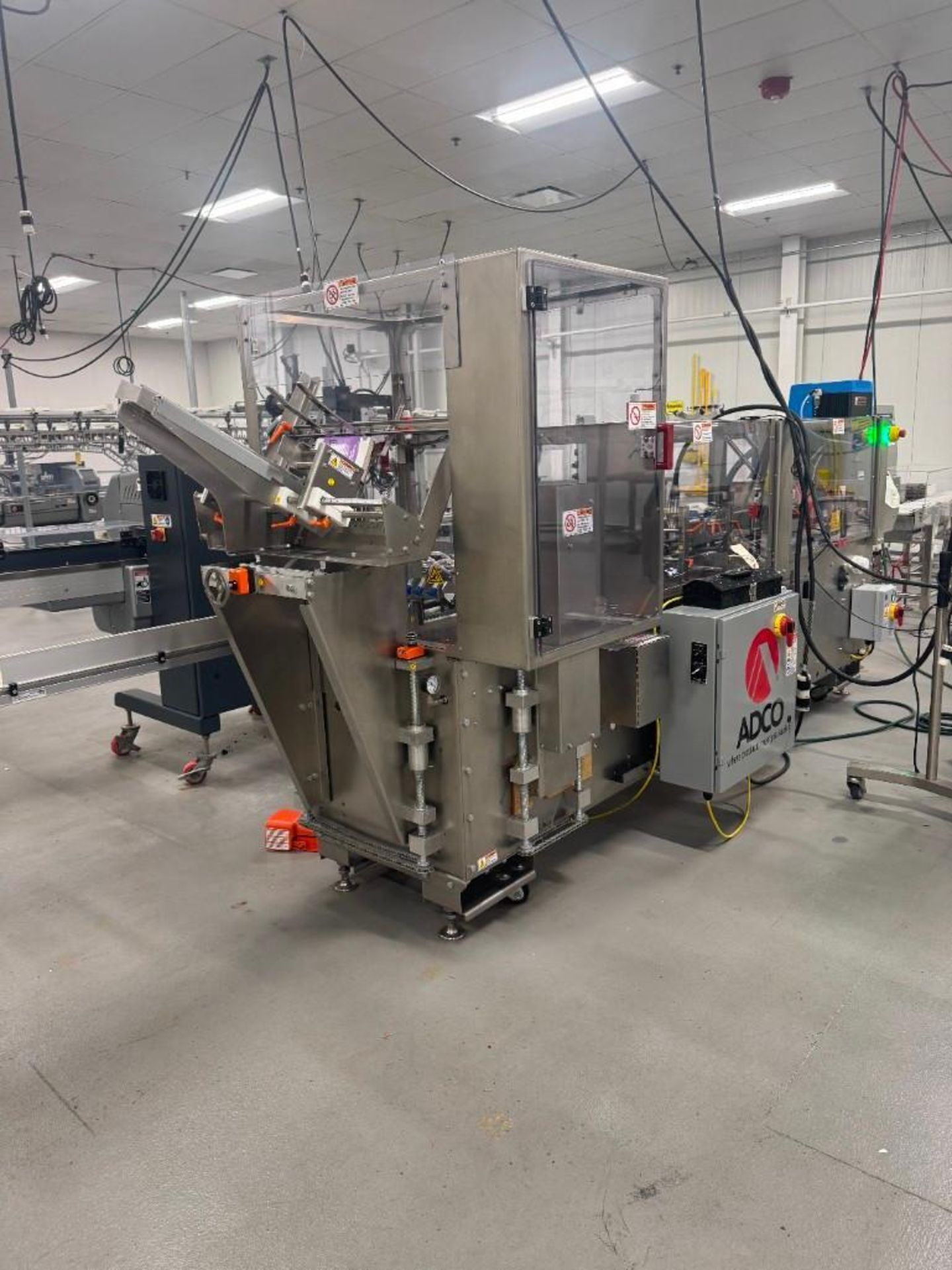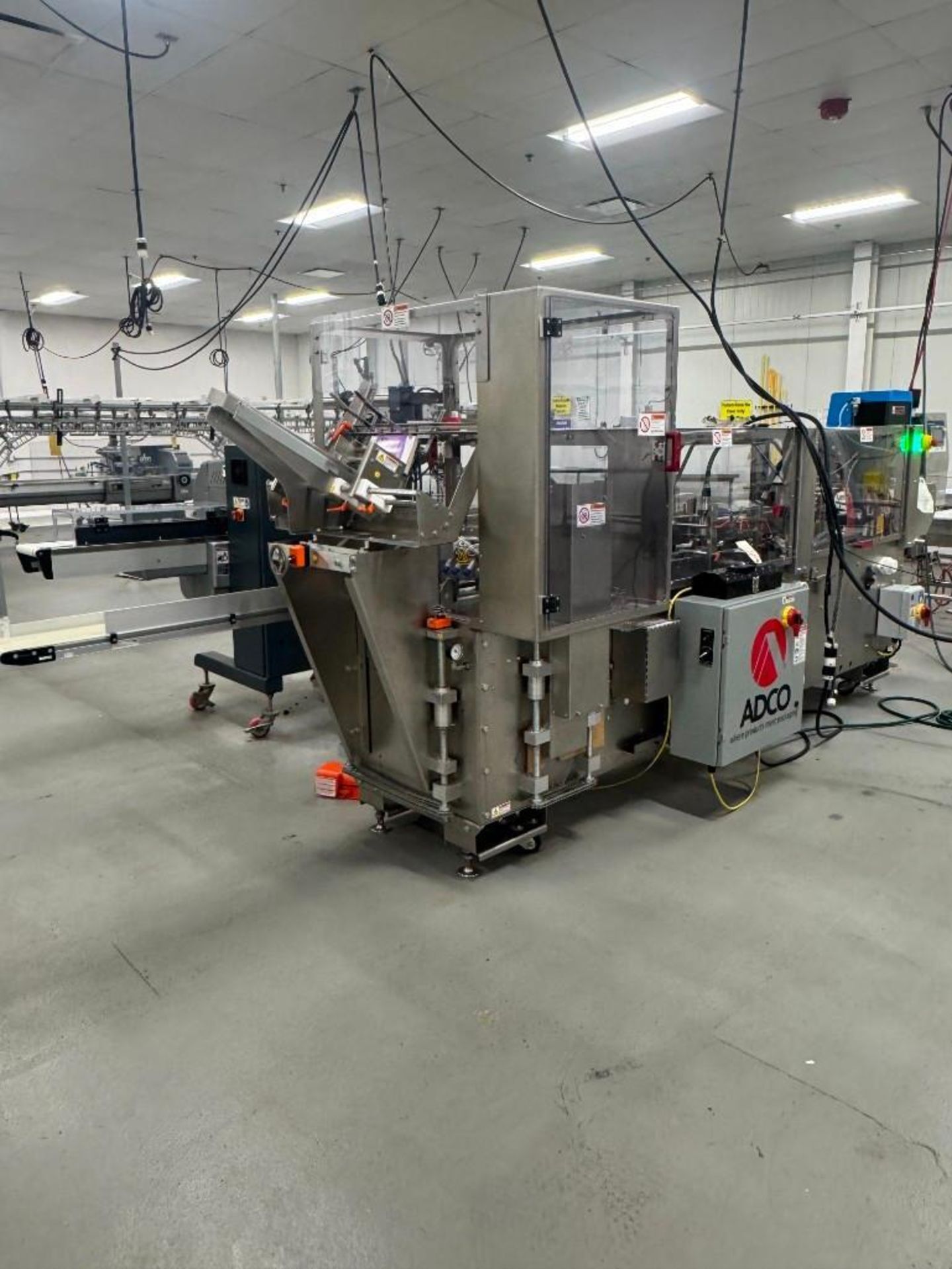 Adco 15DZ-SS Cartoner with VideoJet Ink Printer, Single-head rotary carton feeder, Nordson ProBlue FLEX hot melt glue system, Year: 2023, Simple relay logic controls, Stainless steel construction, Compact frame with leveling feet and casters, 230V/3Ph/60Hz.