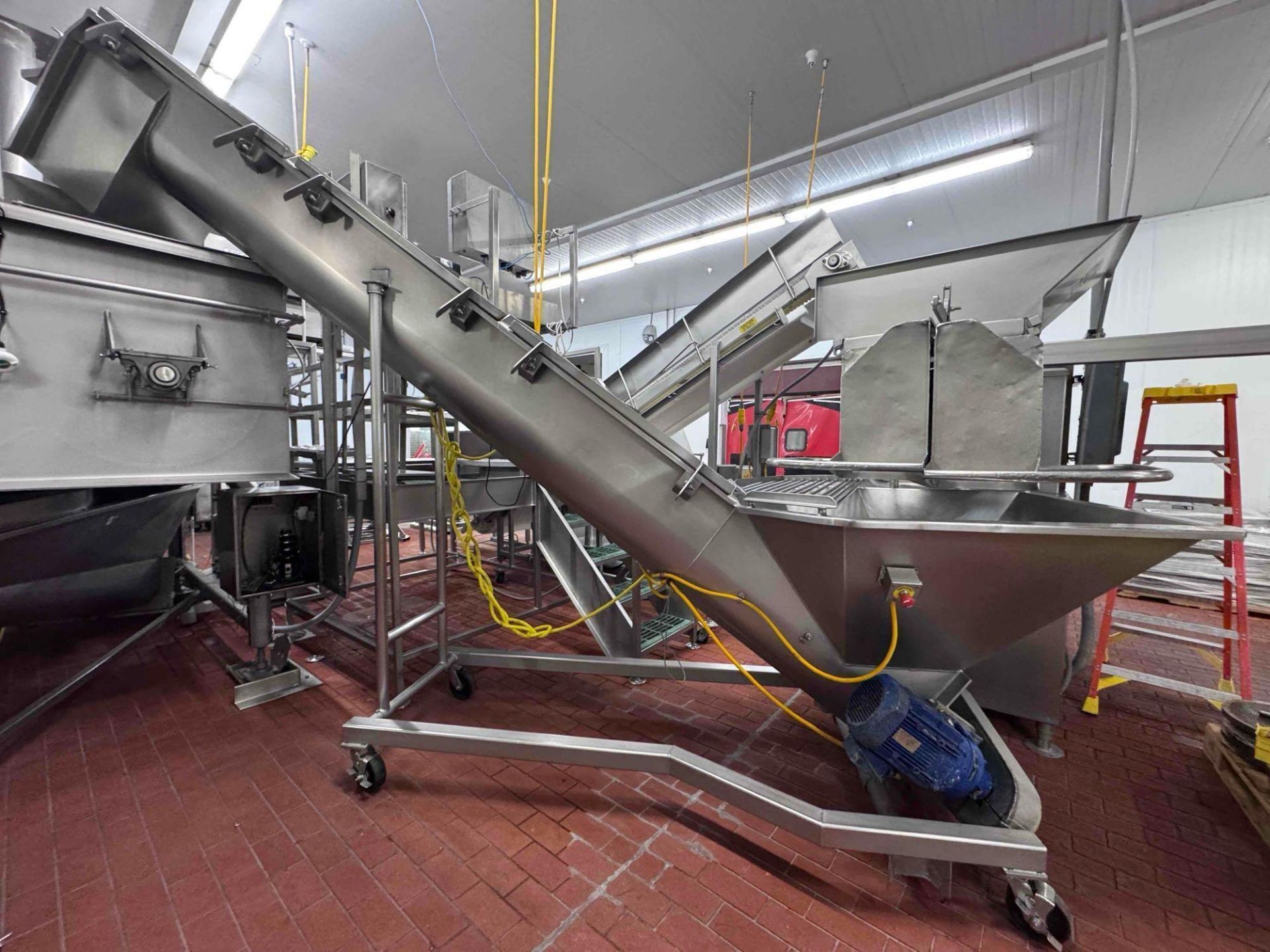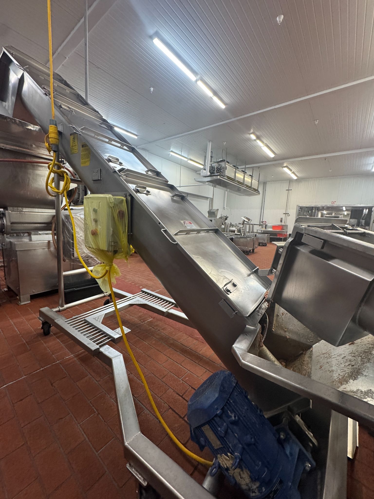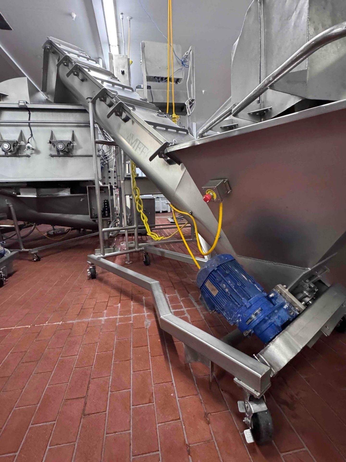 AMFEC 150 Screw Conveyor. SN: 120904, Stainless Steel Construction, 5 HP motor, 15′ Screw Length, 8′ Approximate Discharge Height from Floor, 18.5″ Discharge Chute Width, “53 x 58” Hopper dimensions, on Casters, 440V/3Ph/60Hz.