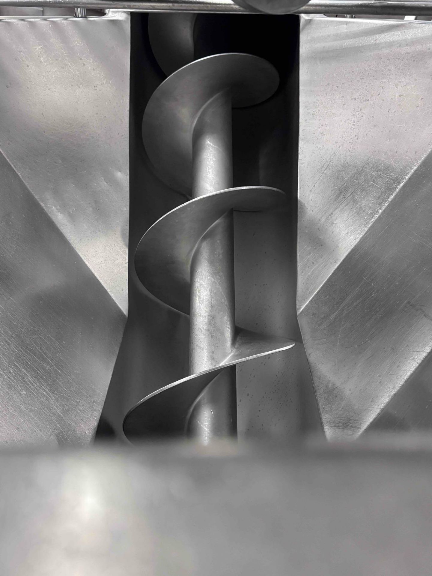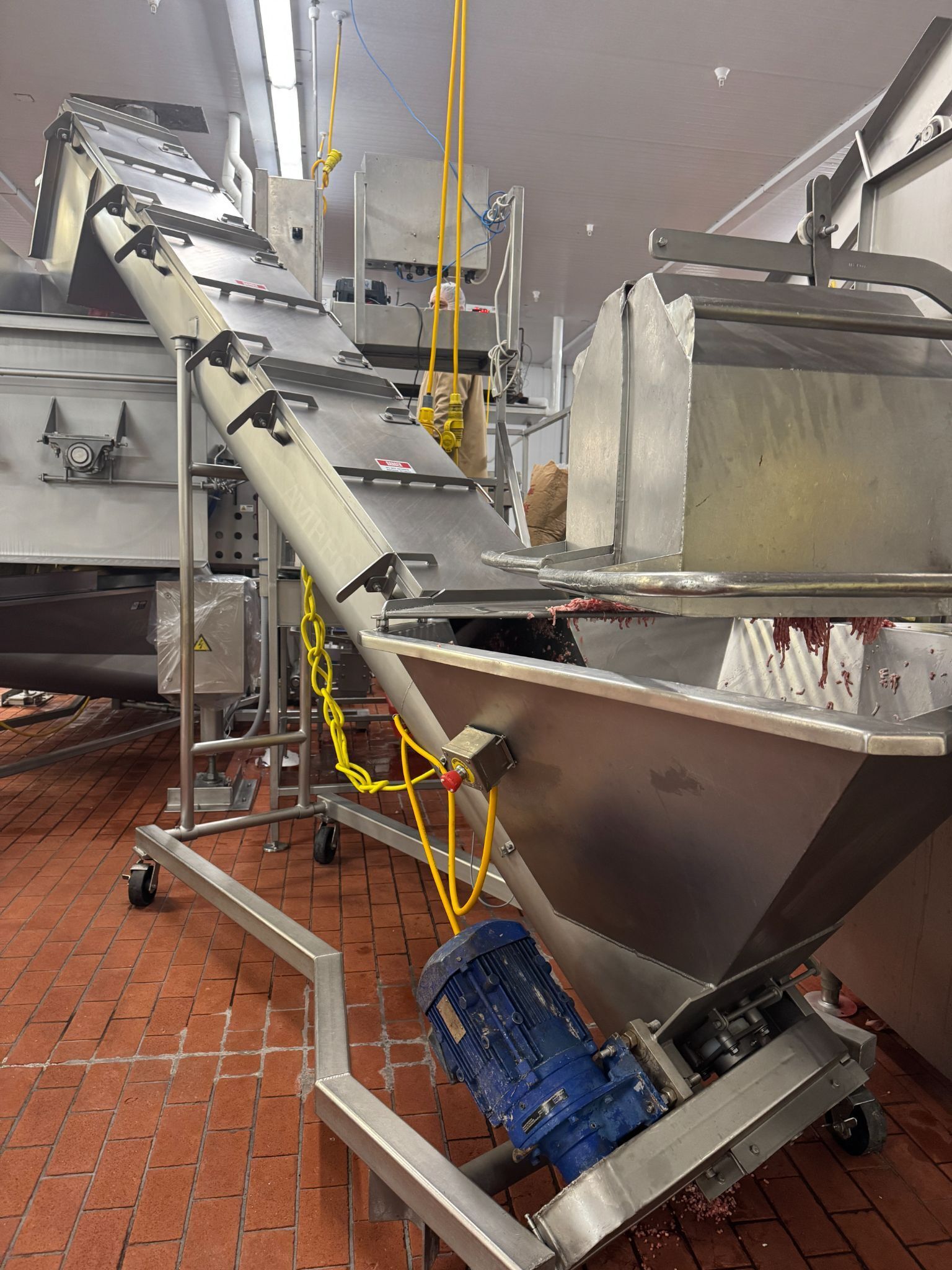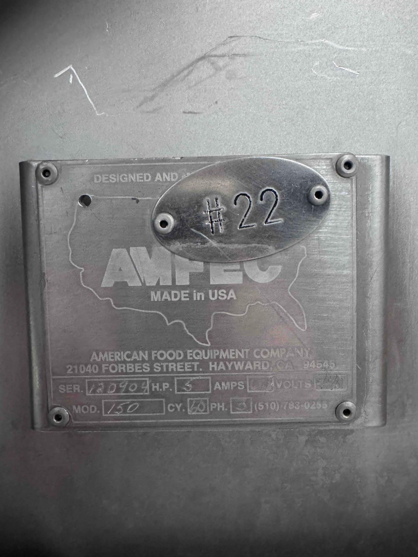 AMFEC 150 Screw Conveyor. SN: 120904, Stainless Steel Construction, 5 HP motor, 15′ Screw Length, 8′ Approximate Discharge Height from Floor, 18.5″ Discharge Chute Width, “53 x 58” Hopper dimensions, on Casters, 440V/3Ph/60Hz.