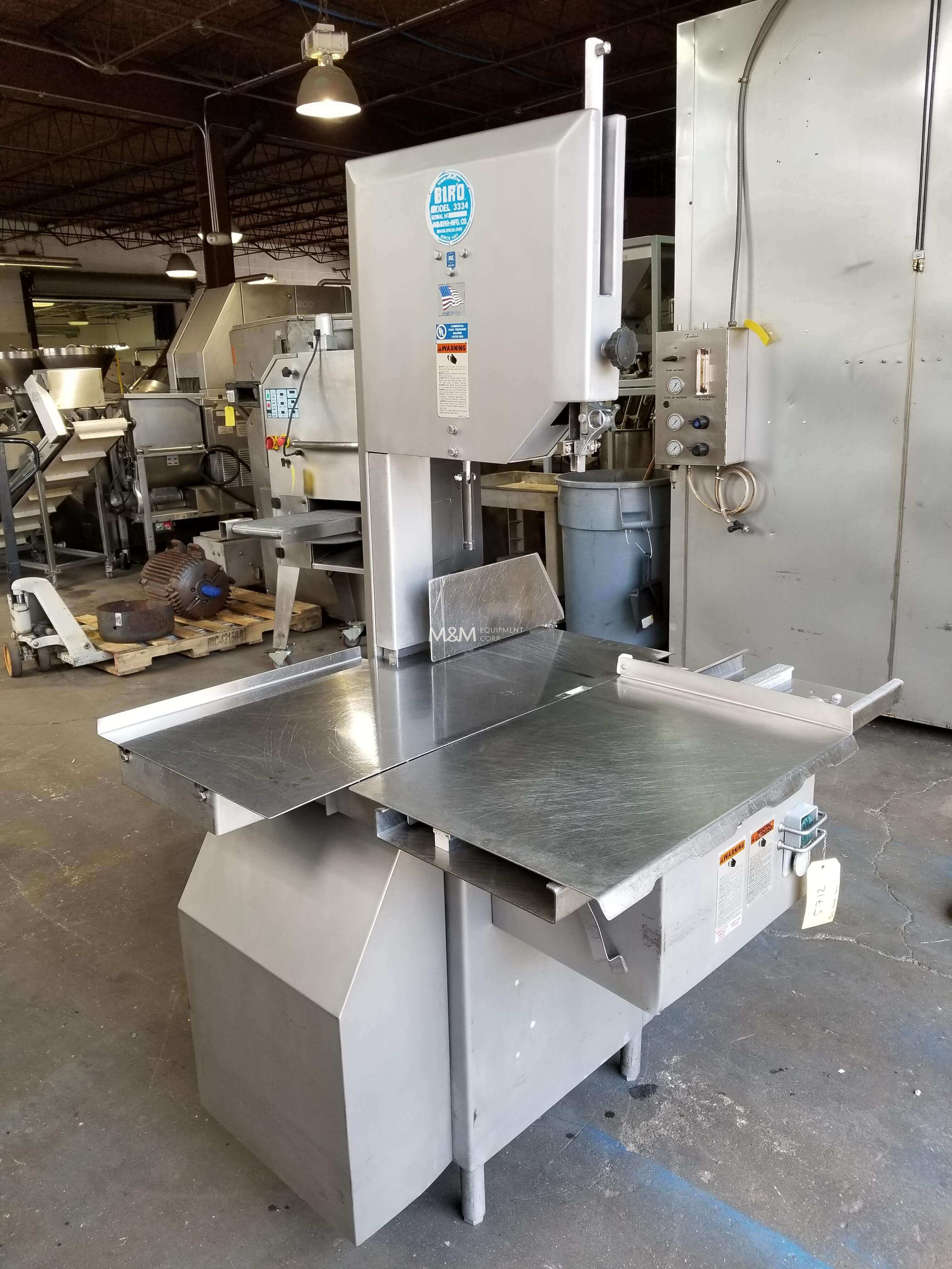 Biro 3334-4003FH Band Saw. All stainless steel construction, 3 HP TEFC motor, non-slip V-belt drive, 124″ X 5/8″ X .02 Blade, 4,000’/min., 16″ diameter blade wheels, roller product carriage 18″ X 25″, 220V/3PH/60Hz.