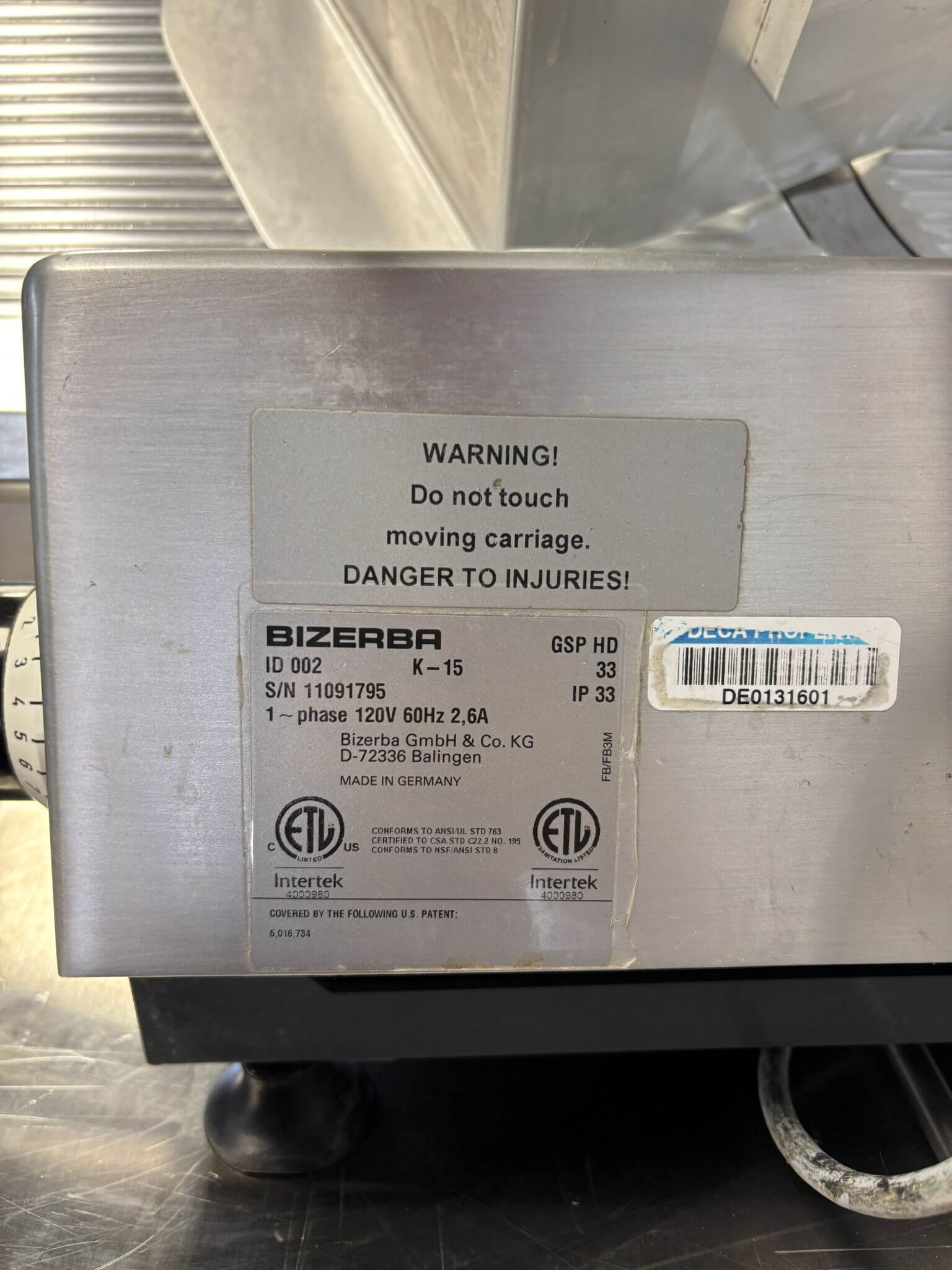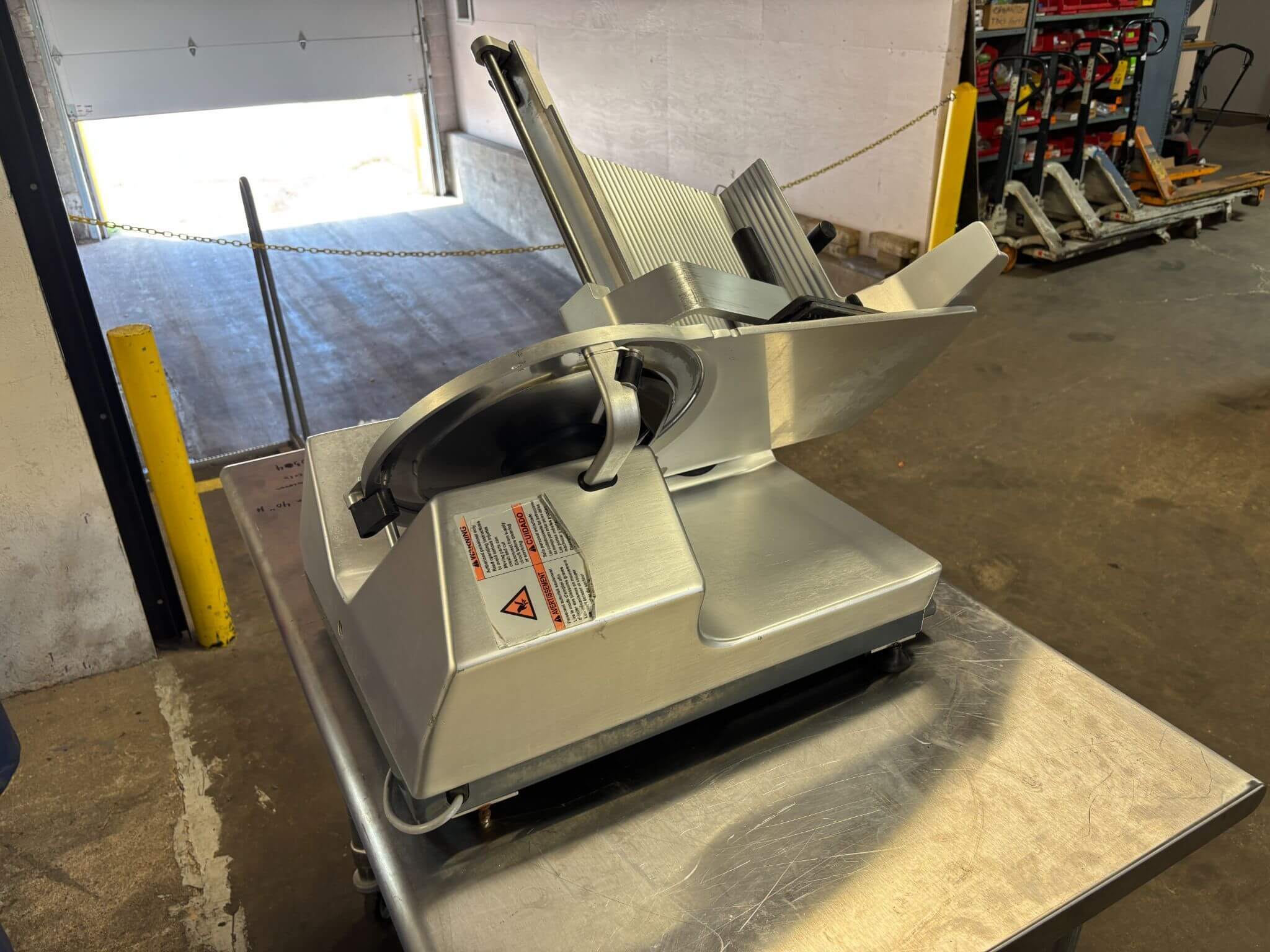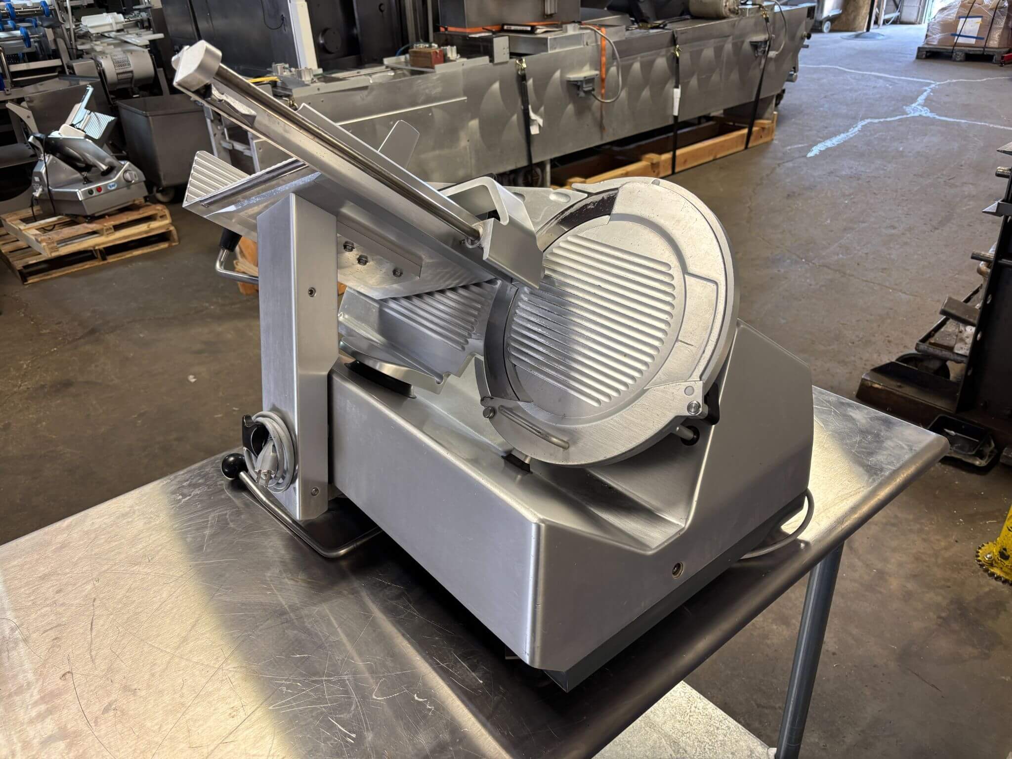 Bizerba GSP HD Gravity Slicer. Anodized aluminum housing, 13″ diameter slice blade, 35 to 90 slices per minute, 40 degree blade angle, slice thickness 0-.09″, 110V/1PH/60HZ, 2.6 Amp.