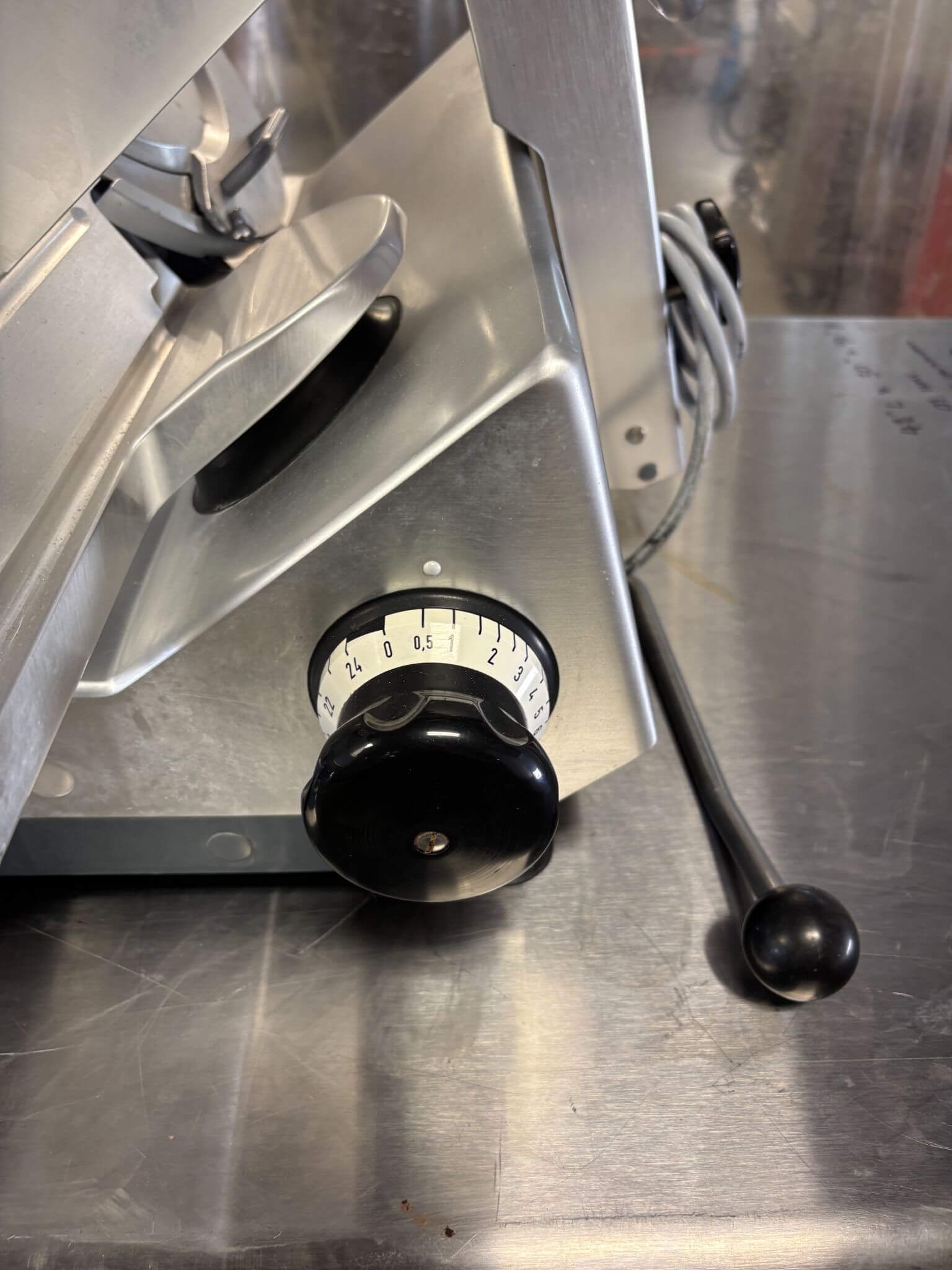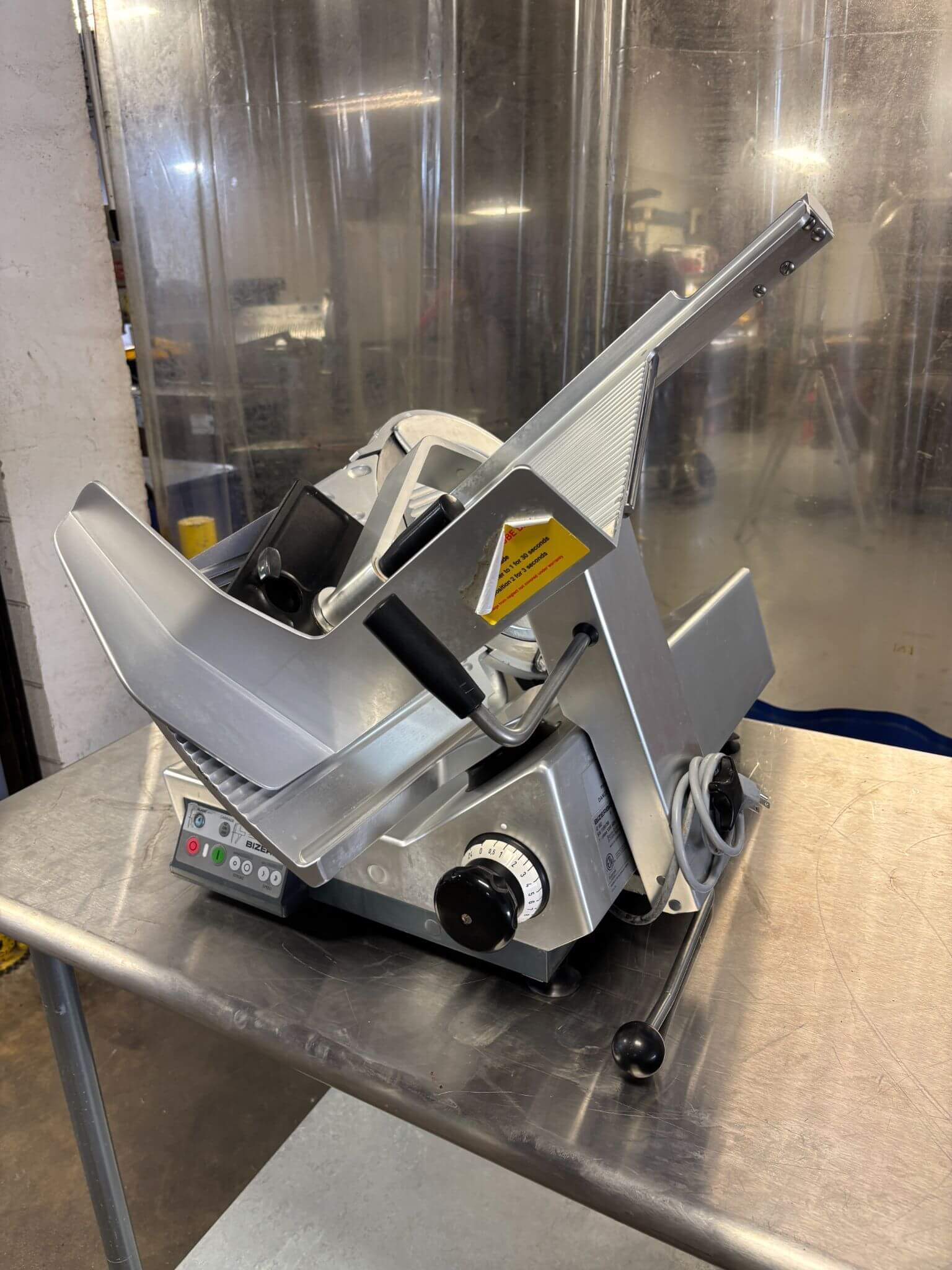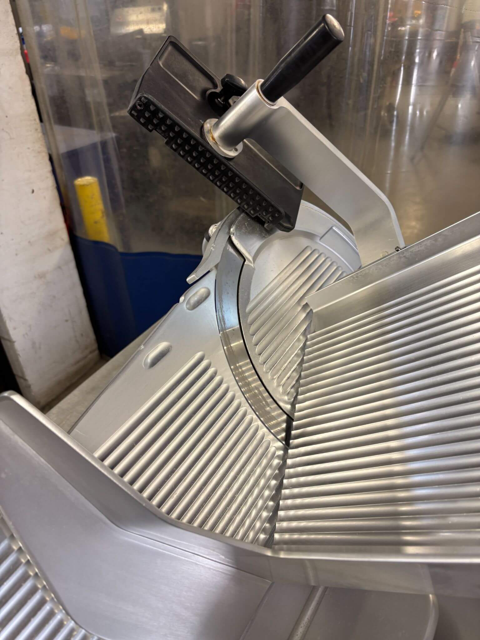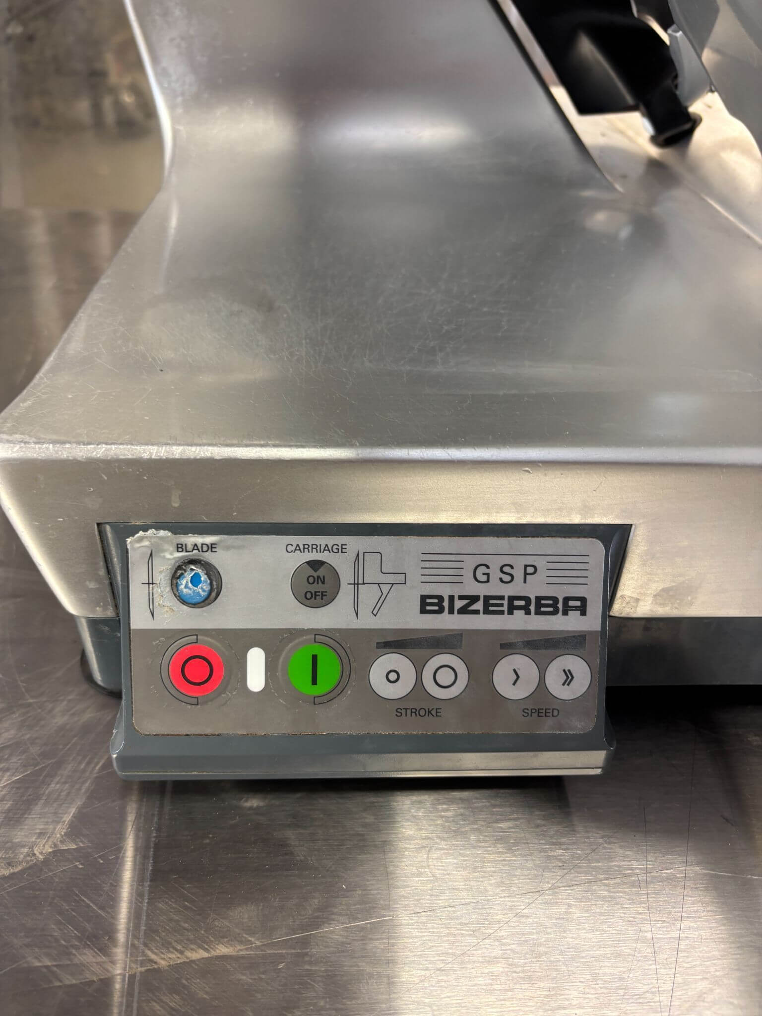 Bizerba GSP HD Gravity Slicer. Anodized aluminum housing, 13″ diameter slice blade, 35 to 90 slices per minute, 40 degree blade angle, slice thickness 0-.09″, 110V/1PH/60HZ, 2.6 Amp.