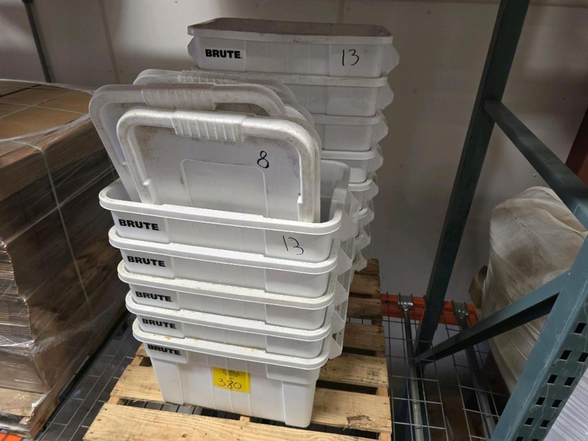(13) BRUTE POLY STORAGE BINS WITH (8) LIDS.