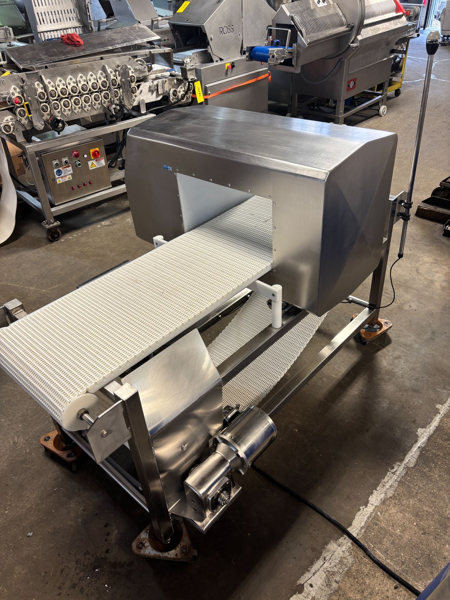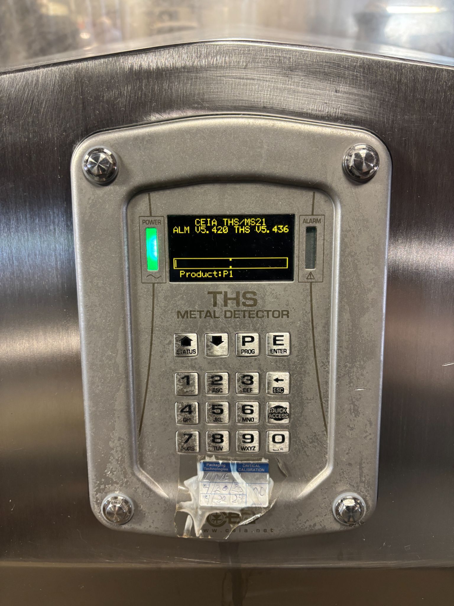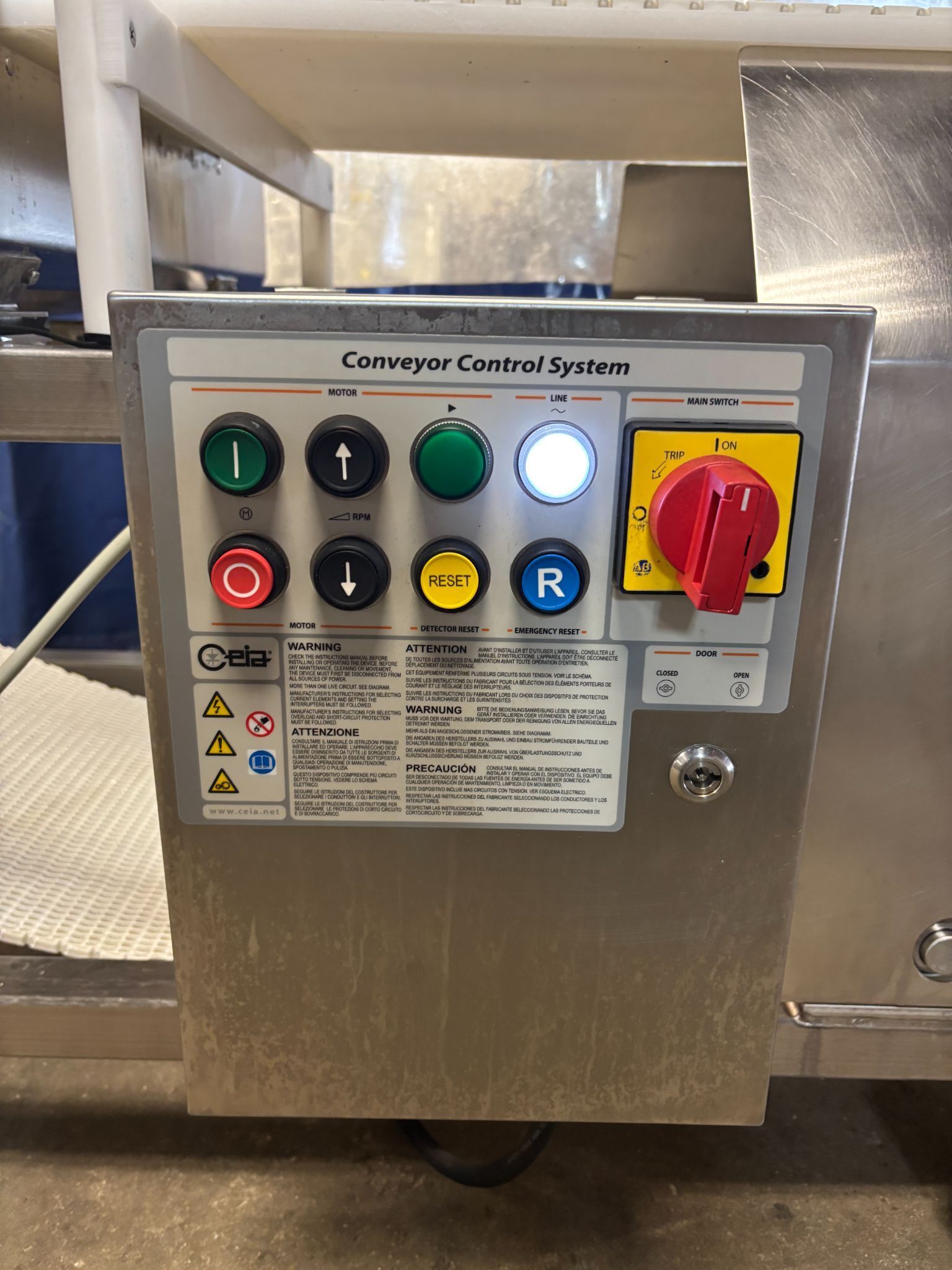 CEIA THS/MS21 METAL DETECTOR. 500mm x 300mm aperture, 18″ wide intralox style conveyor belt, stop on detect with indicator, mounted on casters, 115V/1PH/60HZ.