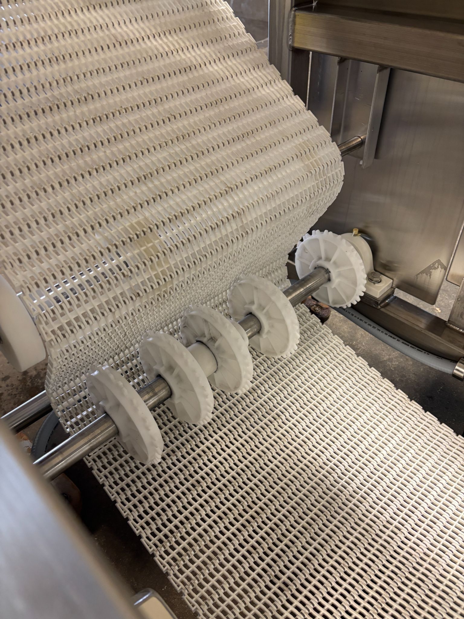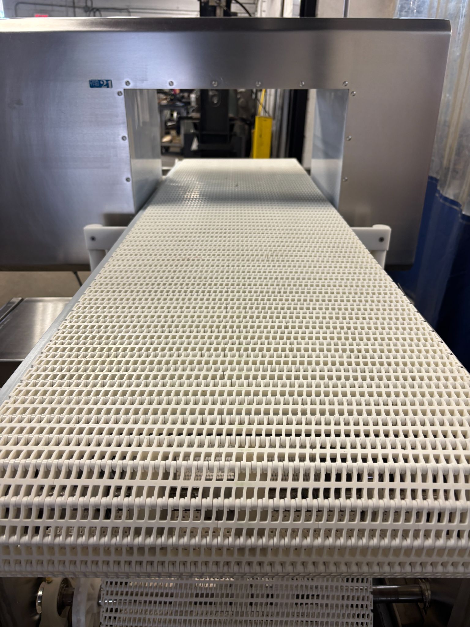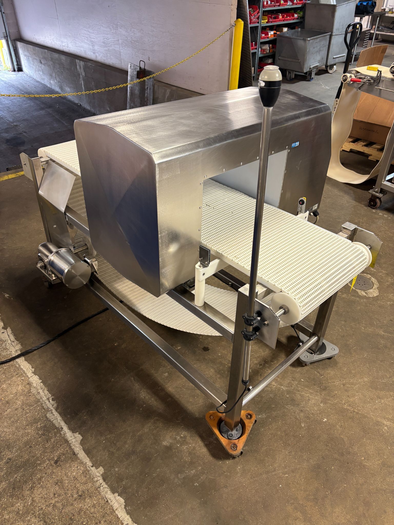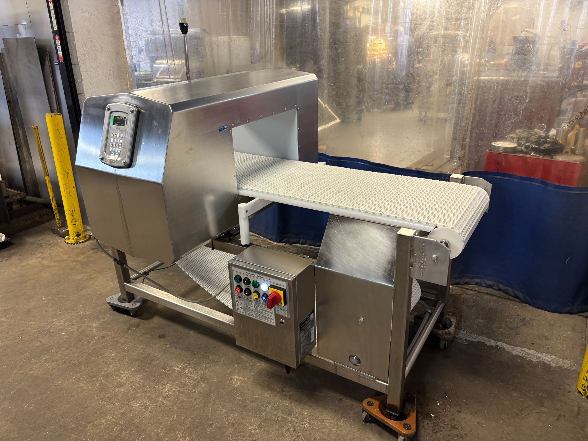 CEIA THS/MS21 METAL DETECTOR. 500mm x 300mm aperture, 18″ wide intralox style conveyor belt, stop on detect with indicator, mounted on casters, 115V/1PH/60HZ.