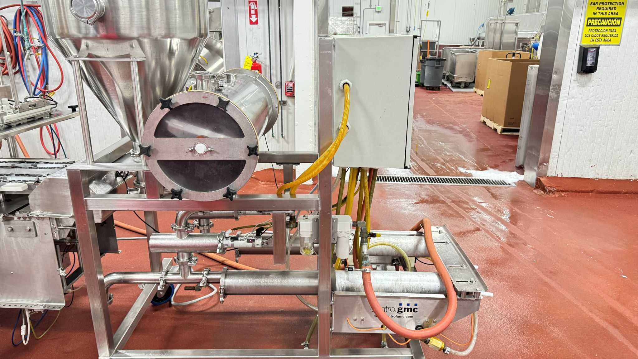 DVM2000 Piston Filler, all stainless steel construction, Maximum speed for 1lb tubs: Up to 40 containers per minute, Filling quantity span: 4oz to 5.2lb with digital indicator, Accuracy: ± 2 hundredths of a pound, Hoppers capacity: 200 lbs, Dosing chamber: 4″ diameter, Dispensing valve: 2″ diameter, Compressed air: Up to 6 CFM @ 100 PSI.