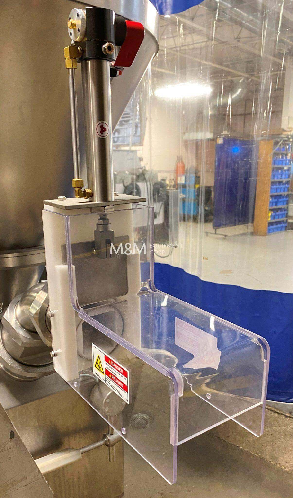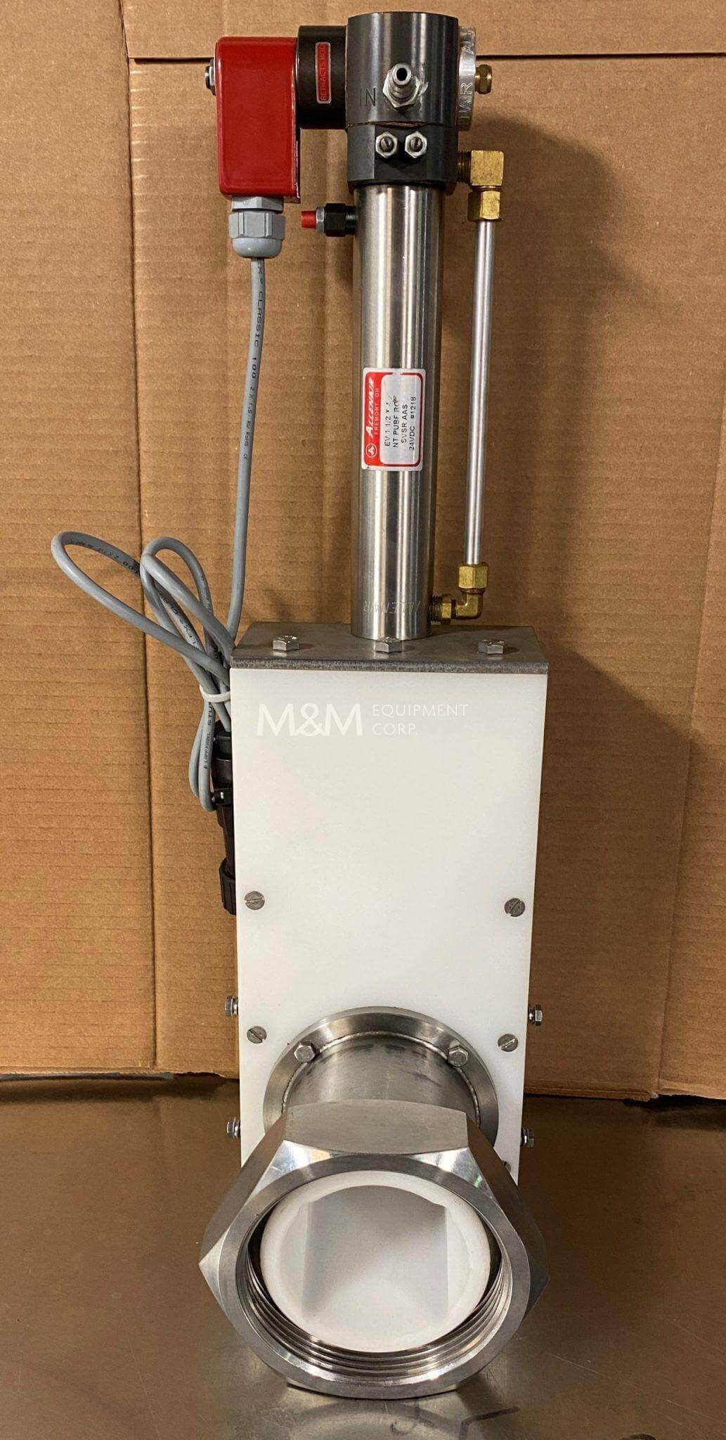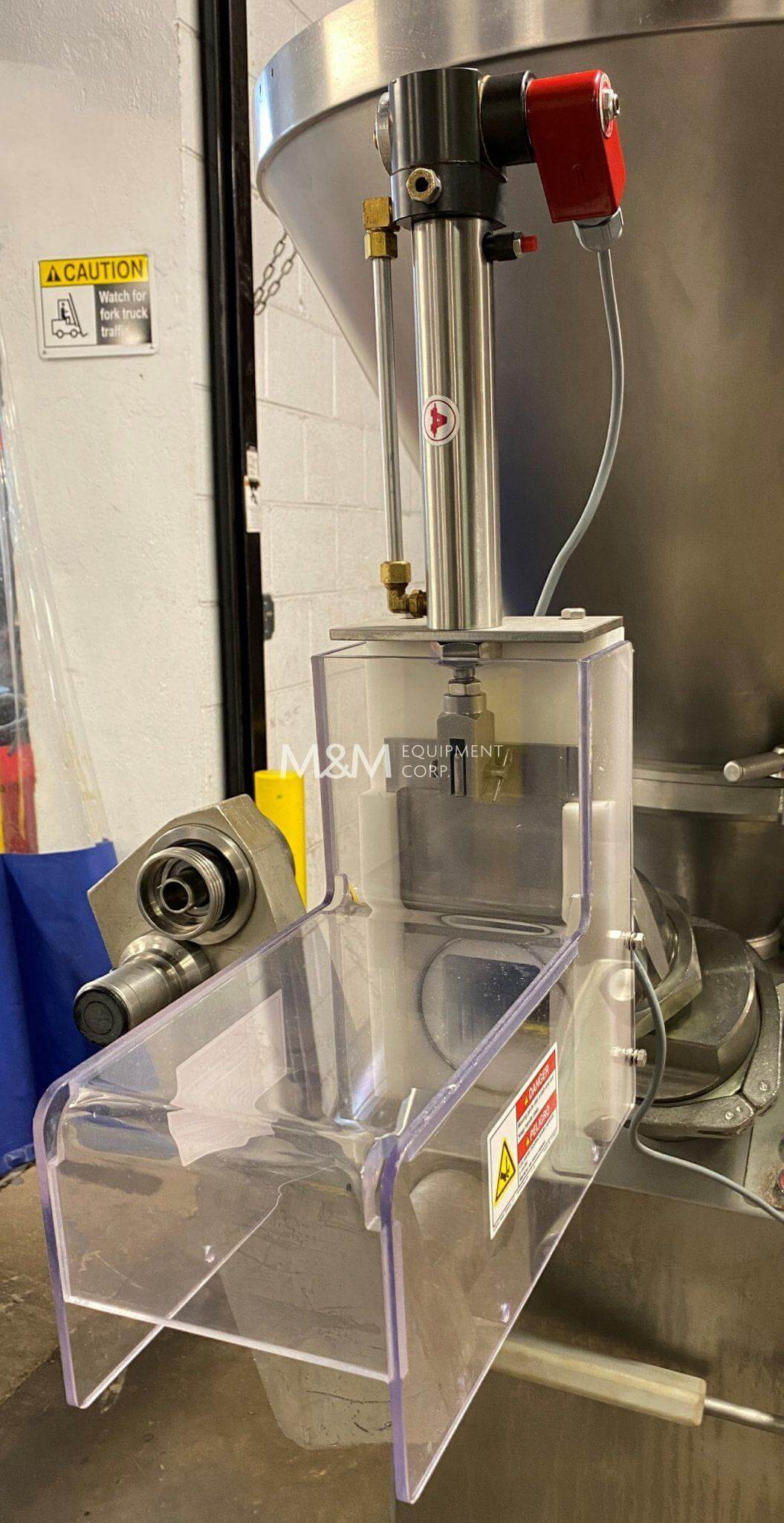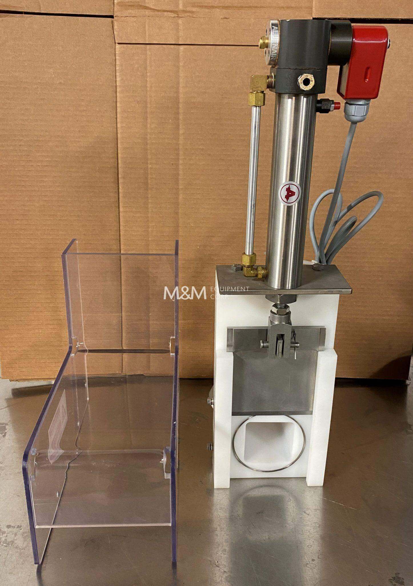 M&M EQUIPMENT CORP. CUSTOM GUILLOTINE EXTRUDER. DESIGNED TO OPERATE WITH A VACUUM STUFFER EQUIPPED WITH PORTION CONTROL. EXTRUDES & PORTIONS MANY PRODUCTS SUCH AS CHEESE, BAKERY AND COOKIE DOUGH, EGG ROLLS AND MEAT ITEMS. STAINLESS STEEL ½” PLATE CONSTRUCTION. HARDENED KNIFE BLADE. AVAILABLE IN 3” & 4” DISCHARGE PIPES. AVAILABLE IN A VARIETY OF EXTRUDER SHAPES. HEAVY DUTY STAINLESS STEEL TIE ROD PNEUMATIC CYLINDER. 25 PSI @ 60CFM. REQUIRES A 24 VOLT CONNECTION TO VACUUM STUFFER.