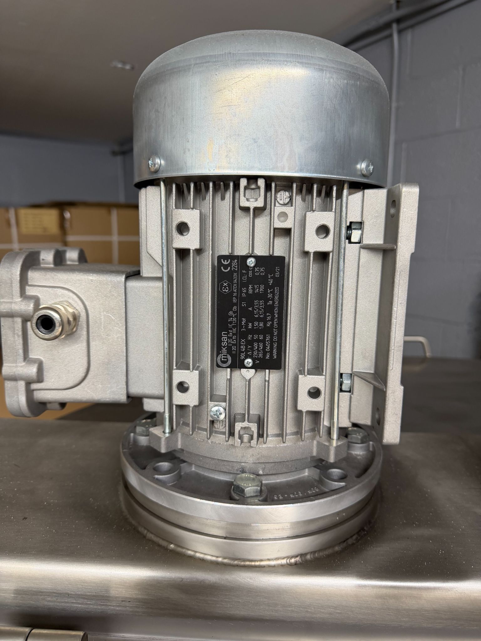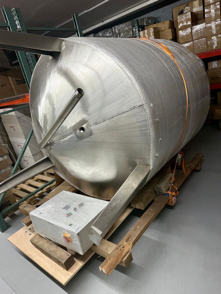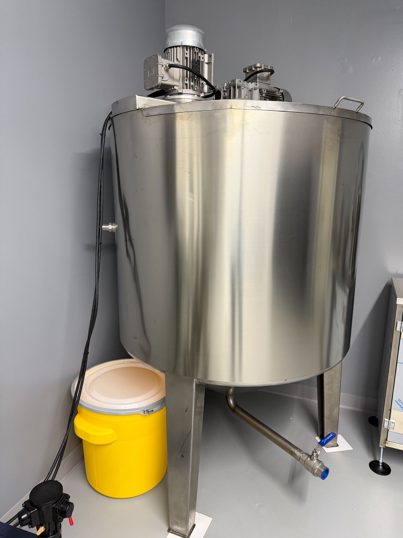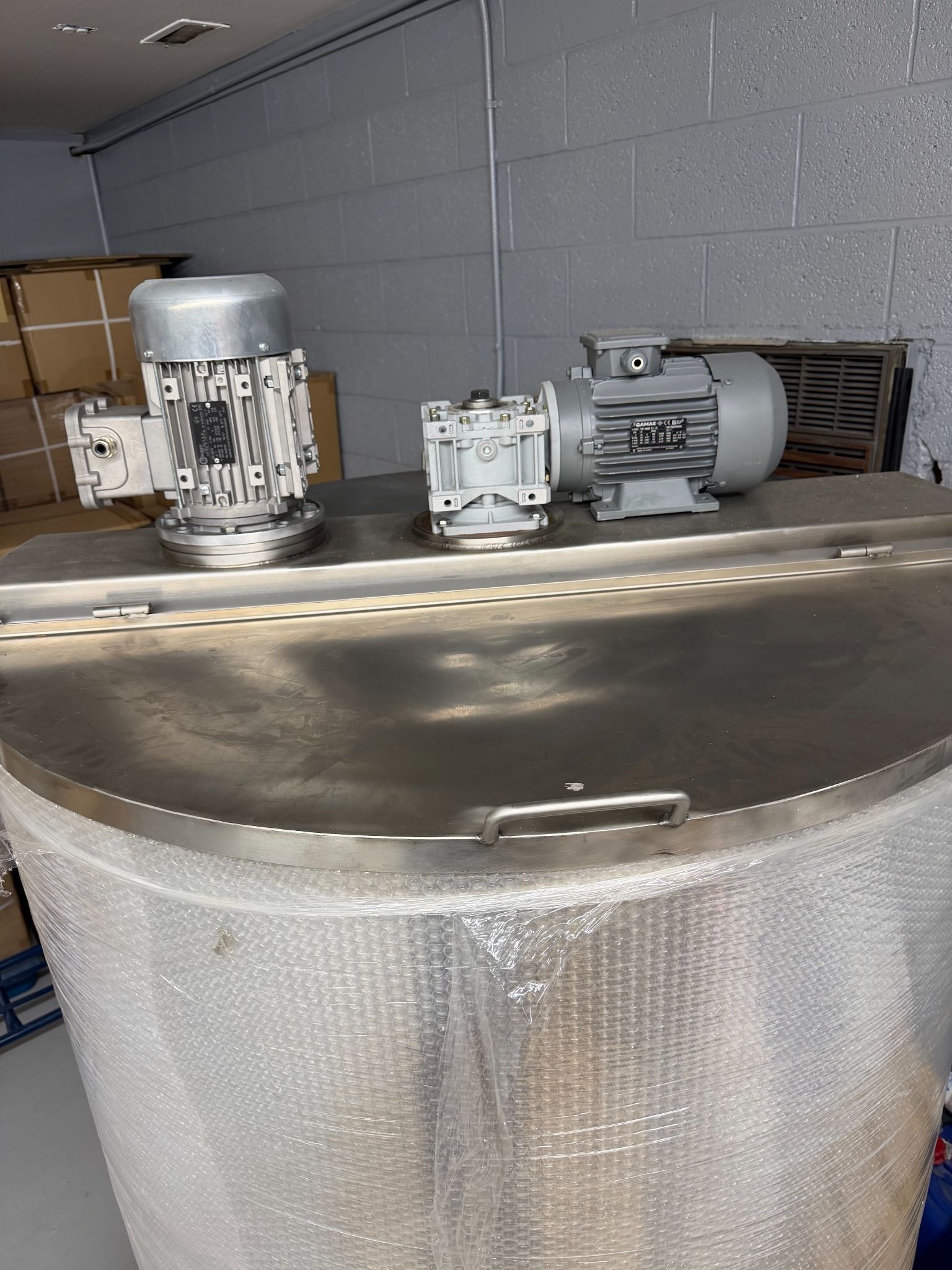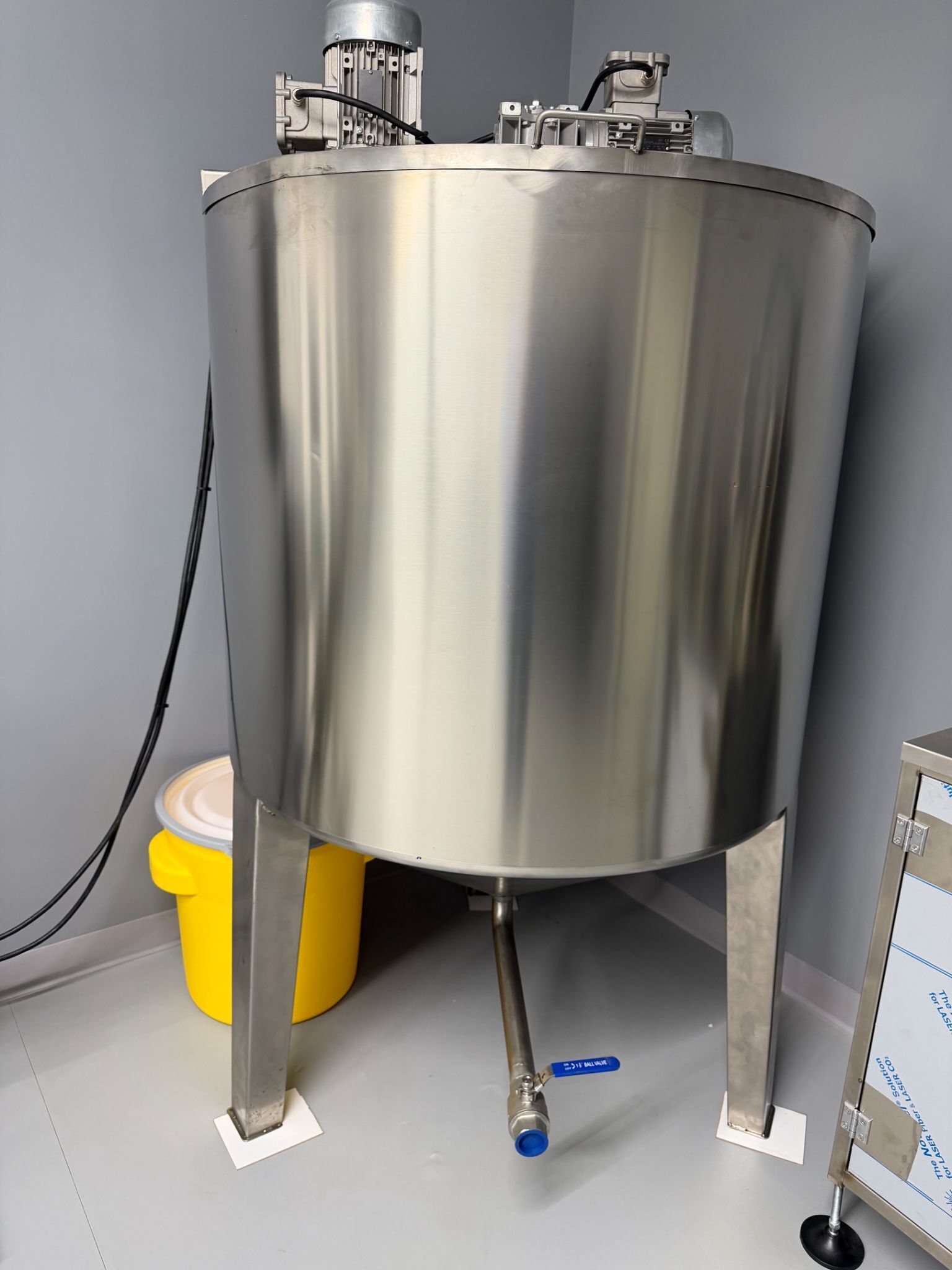 CUSTOM STAINLESS 3,000 LITERS AND 1,000 LITERS DOUBLE-LAYER PRODUCTION TANKS. Both have Heating & Cooling Features with an internal mixer and homogenizer, all stainless steel construction, Includes: Internal mixer and homogenizer, Viscosity: 1,000 – 5,000 cP, Heating & Cooling: Coil-wrapped body with heating and cooling capability, Main Propeller Group: Low-speed, adjustable speed, Teflon scraper, 7.5 kW power, Disintegration System: Inline turbo-type disintegrator, 7.5 kW power, Cleaning System: Integrated cleaning ball for internal washing, 240V/3PH/60HZ.