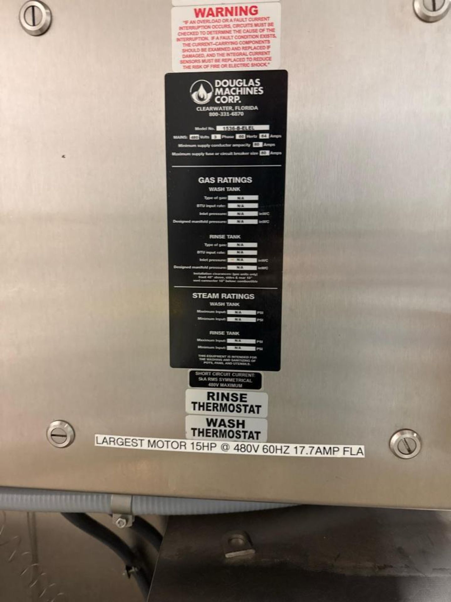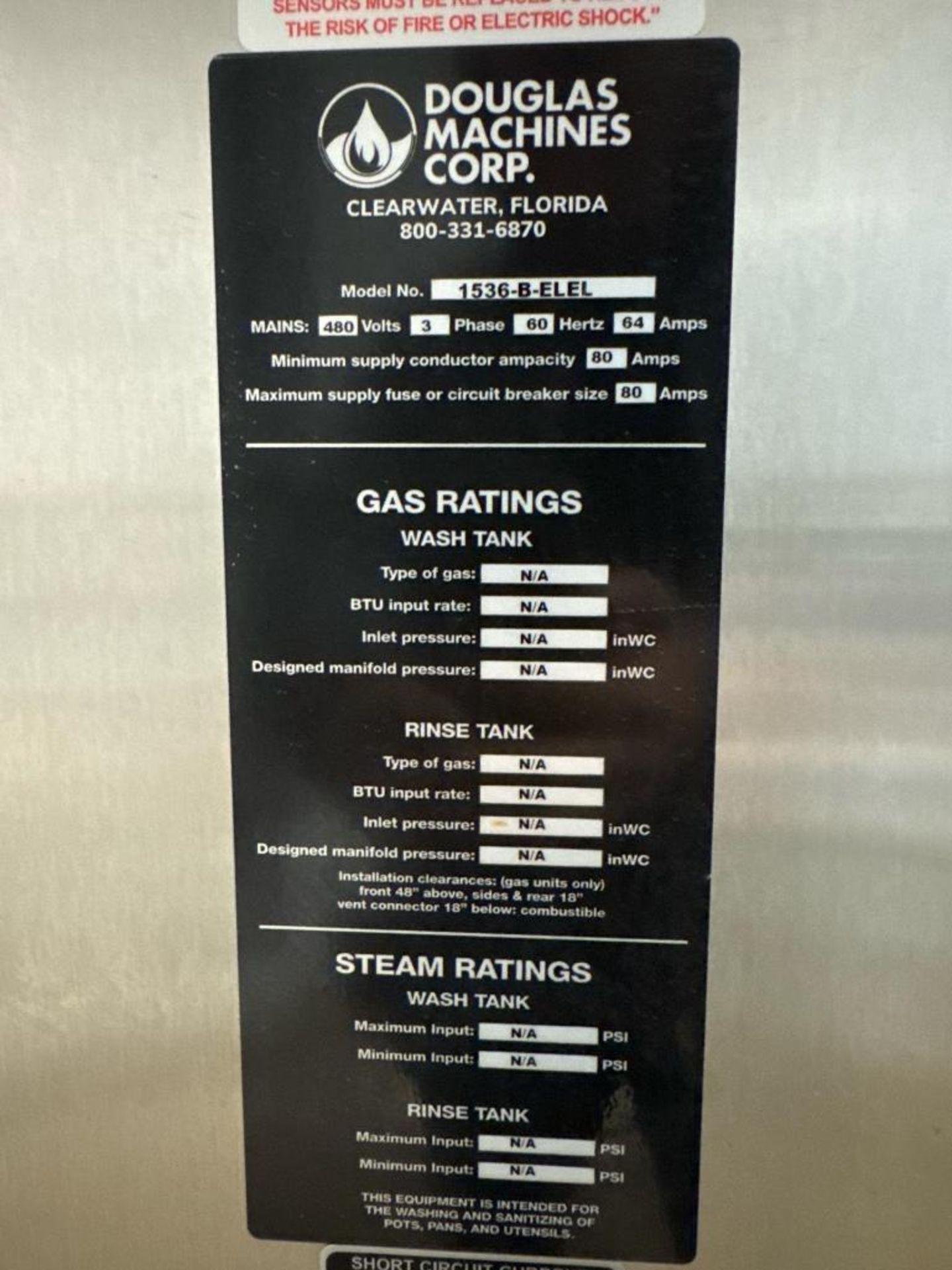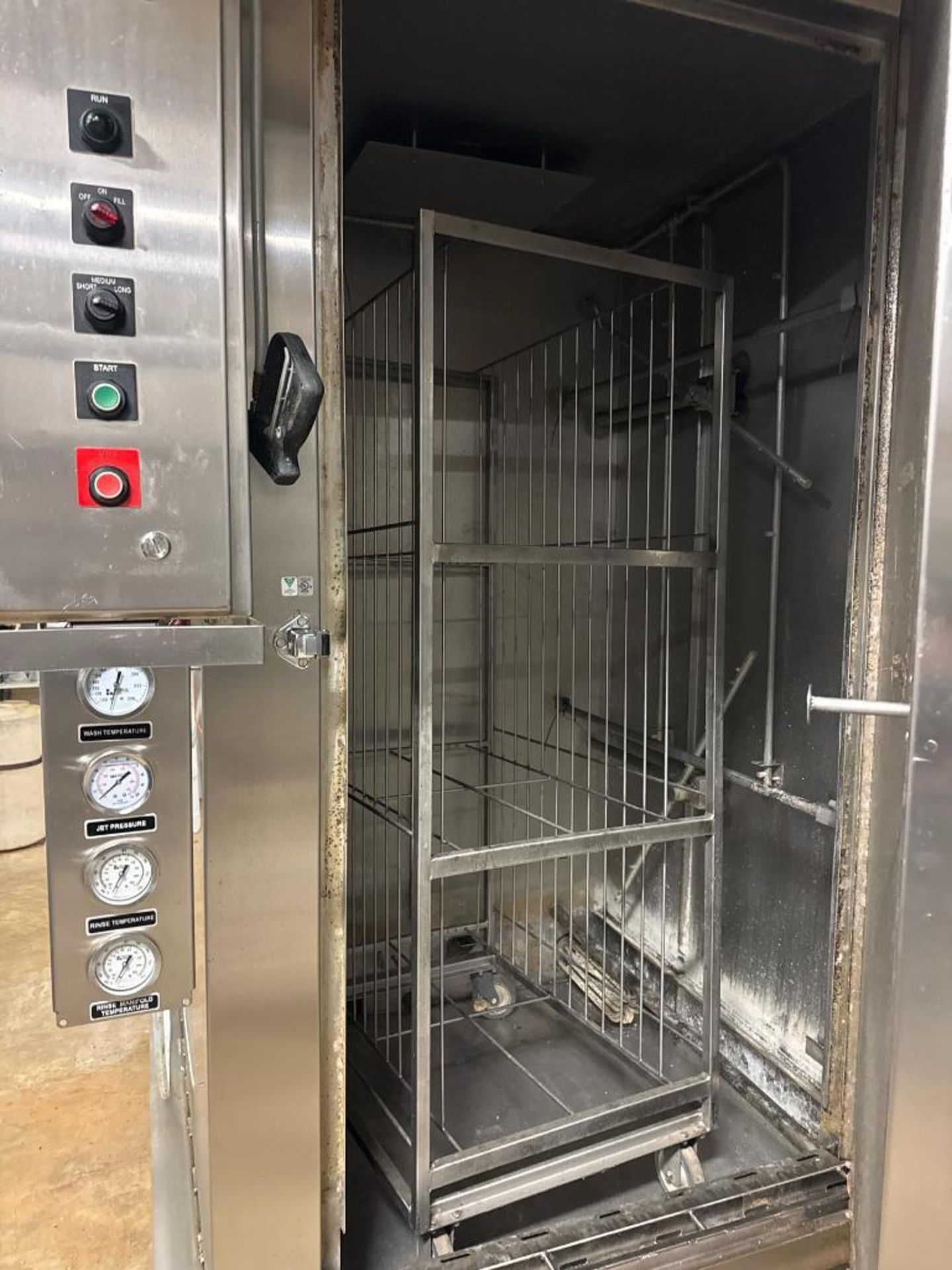 DOUGLAS 1536-B-ELEL TRUCK WASHER. 480V/3PH/60HZ. Includes ramp and (2) carts for sheet trays. OD: 80″ x 66″ x 95″.
