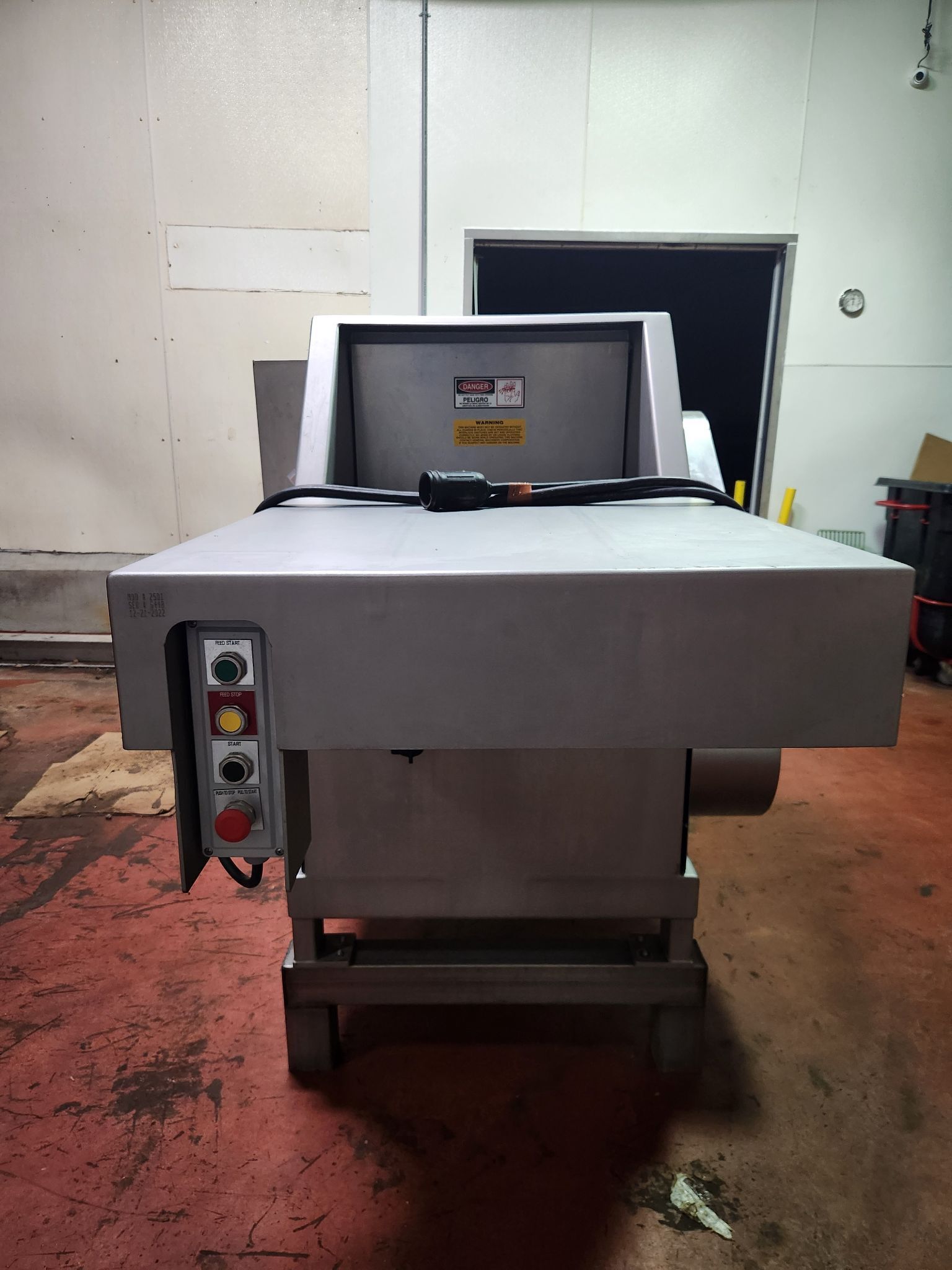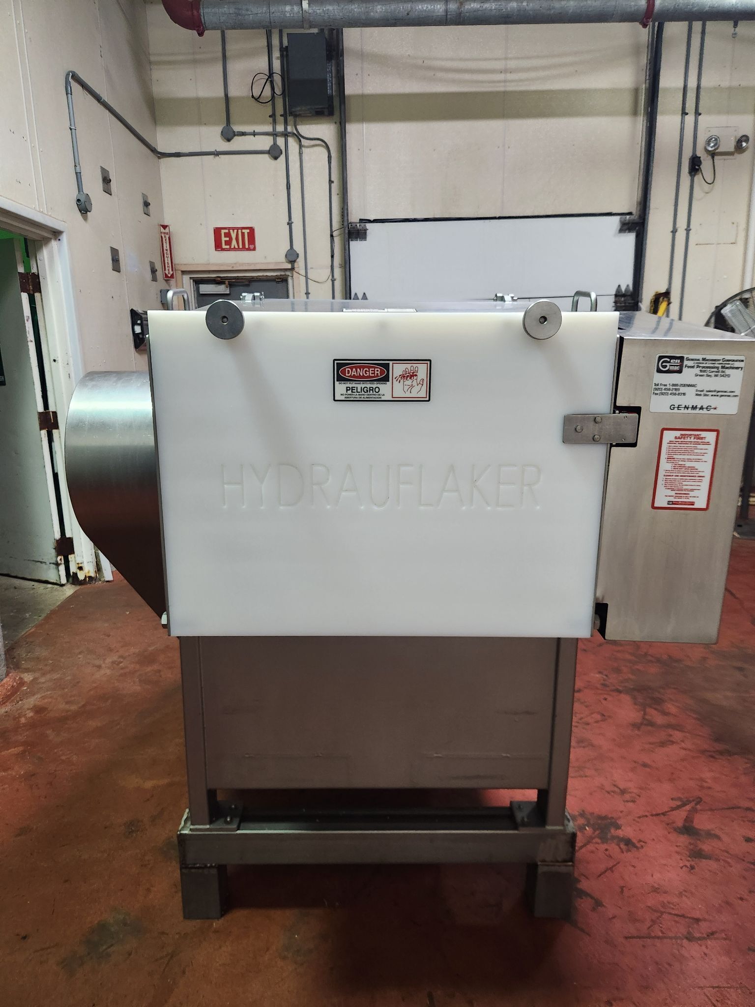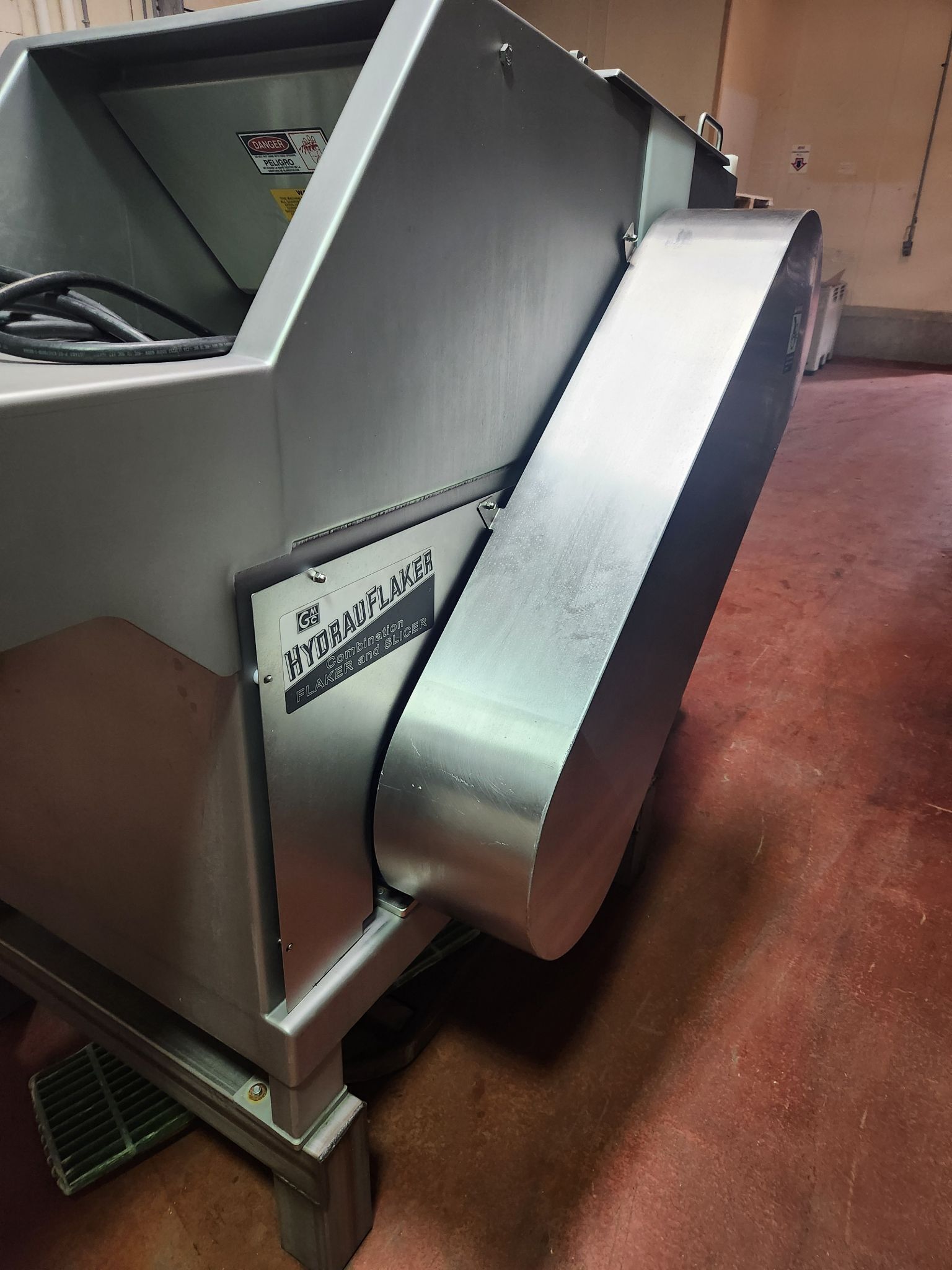 GMC 2501 Hydrauflaker. Frozen meat block flaker, Stainless steel construction, 10″ x 24″ x 24″ Block capacity, Automatic adjustable pneumatic ram (80 PSI), 10 Cycle Slice blades on 12-1/2″ stainless steel flow-through drum (540 RPM), 10 HP TEFC motor and controls, Safety-guarded drum enclosure with automatic brake, 460V/3PH/60HZ.