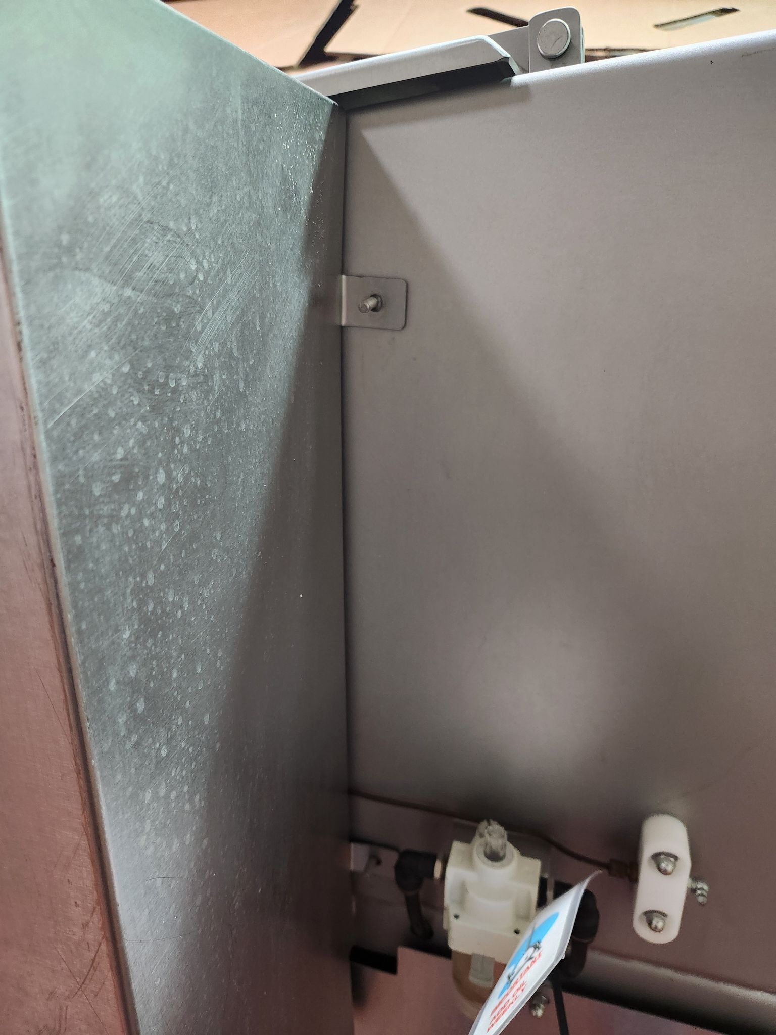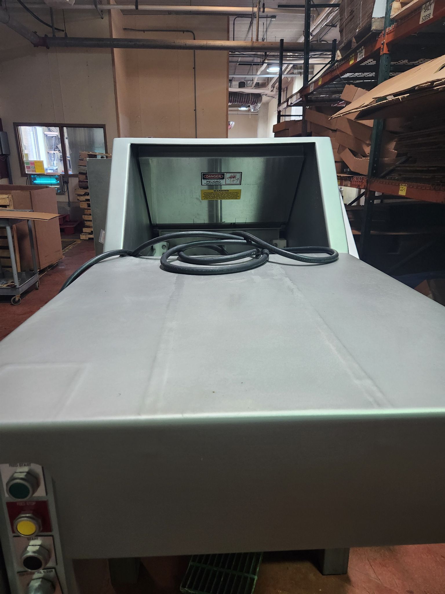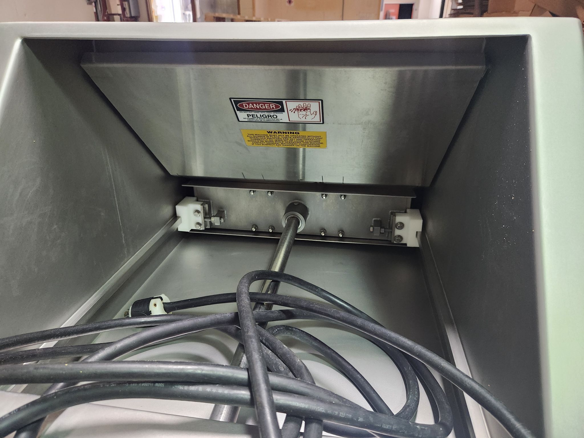 GMC 2501 Hydrauflaker. Frozen meat block flaker, Stainless steel construction, 10″ x 24″ x 24″ Block capacity, Automatic adjustable pneumatic ram (80 PSI), 10 Cycle Slice blades on 12-1/2″ stainless steel flow-through drum (540 RPM), 10 HP TEFC motor and controls, Safety-guarded drum enclosure with automatic brake, 460V/3PH/60HZ.