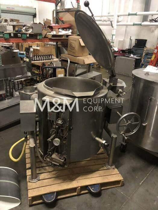 GROEN INA/2-100 Steam Jacketed Kettle. All stainless steel construction, Capacity: 100 gallon, Includes tilting mechanism, INA/2 agitator, Pressure rating: for steam pressures up to 50 PSI or 90 PSI, National Board Registered: 121534, Max W.P. 100 P.S.I. at 338°F.