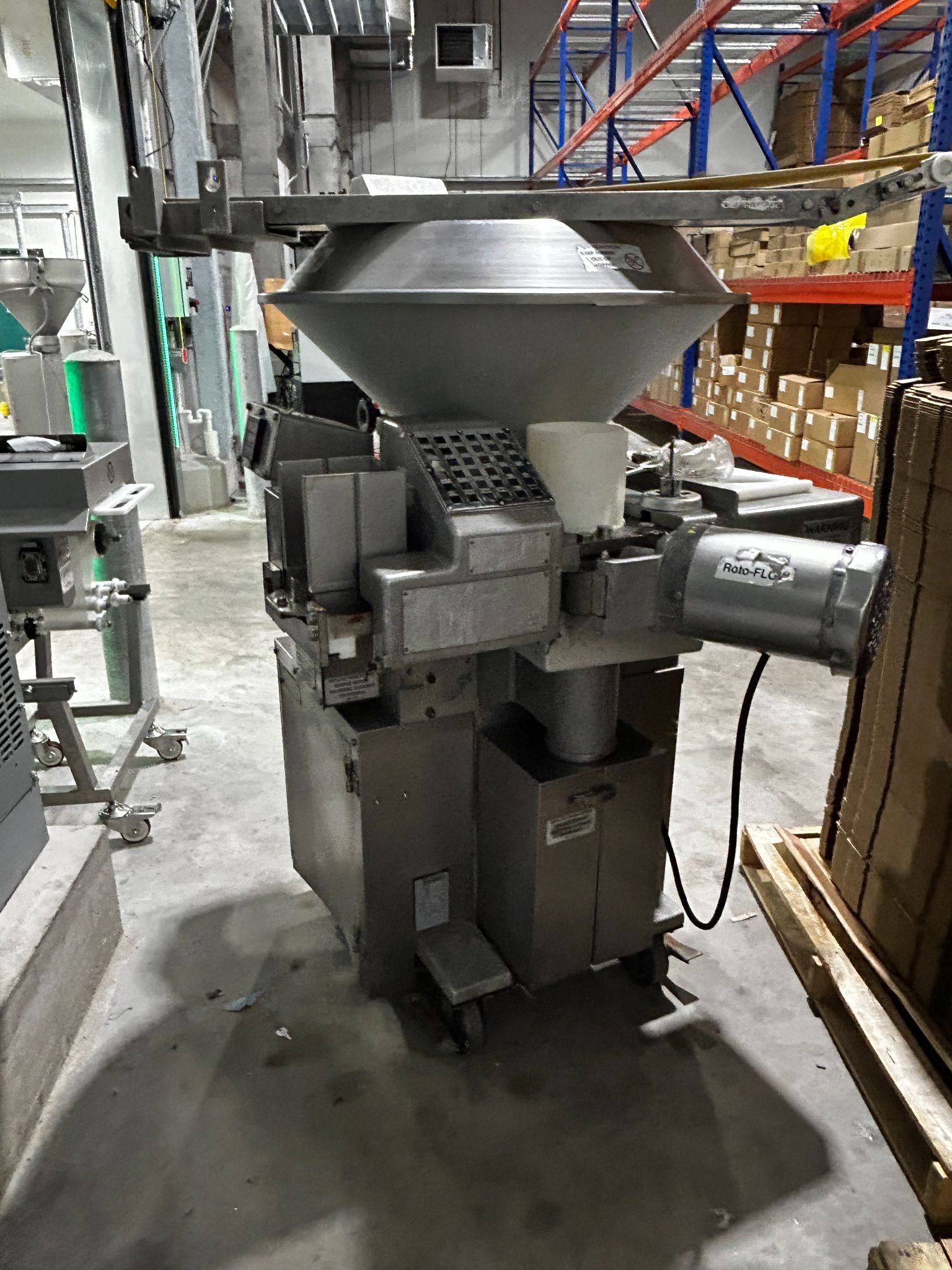 HOLLYMATIC 8/65 PATTY MACHINE. All stainless steel construction, paper feed hopper, produces up to 3,900 portions/hour, 60 cycles/minute, 2 HP drive motor, 220V/3PH/60HZ, 6.8 Amps.