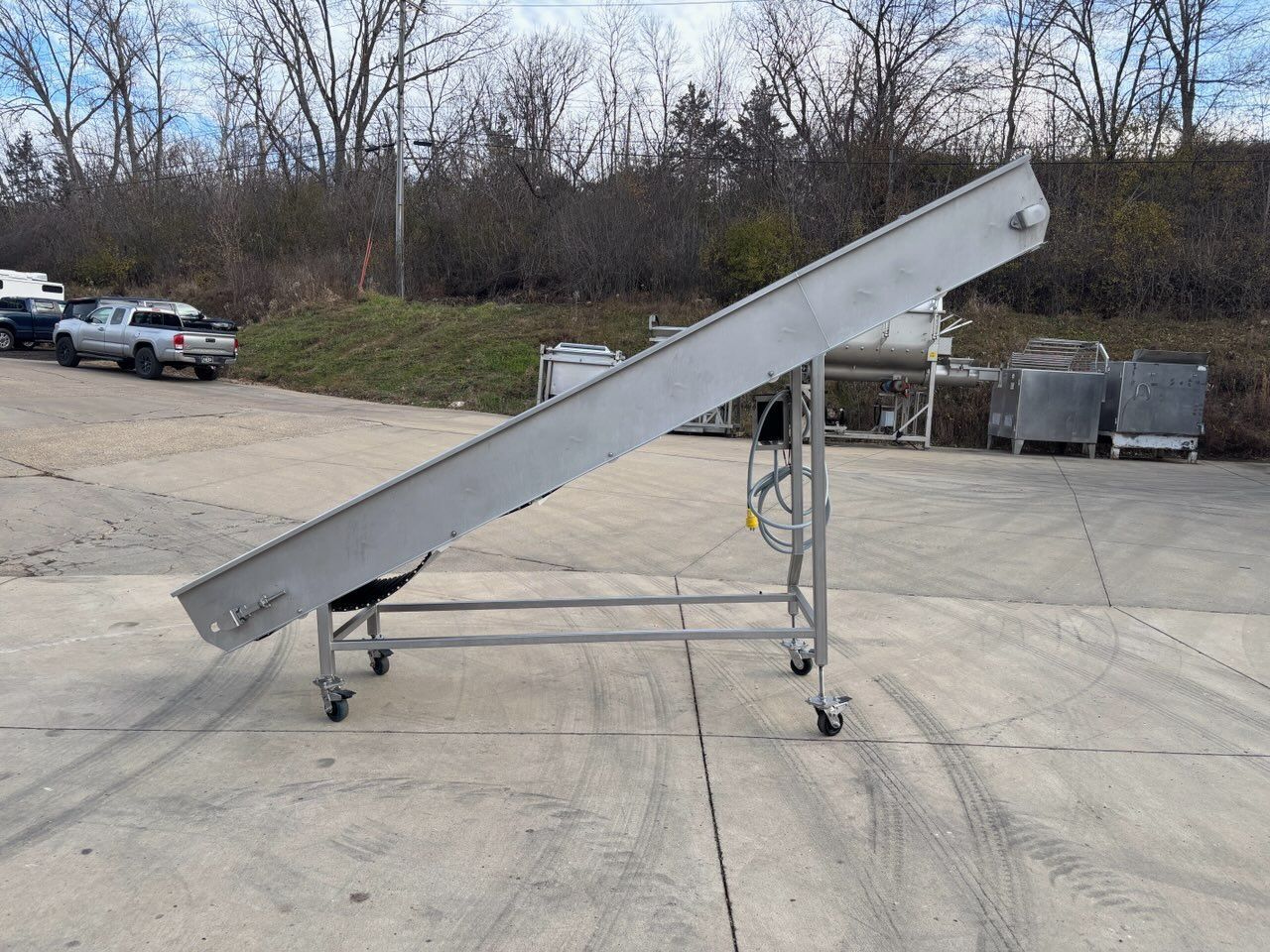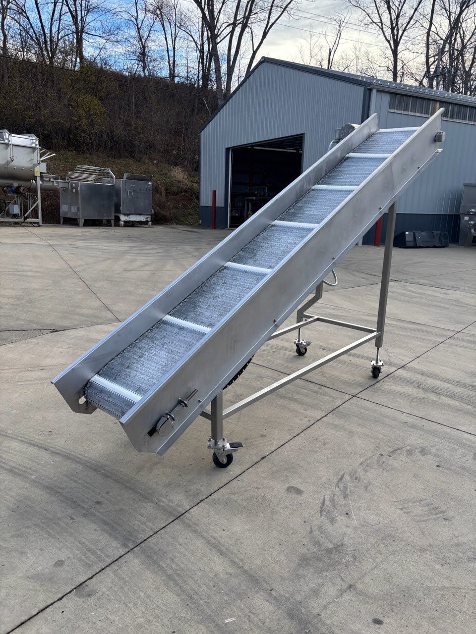 ICF PC-3 FROZEN BLOCK CONVEYOR. All stainless steel construction, Includes new Interlox belt with 2″ tall cleats, 24″ In feed, 82″ Discharge, Belt: 12′ long, 3′ overhang from front legs, Motor: 3/4 HP, stainless steel casters with locks on wheels.