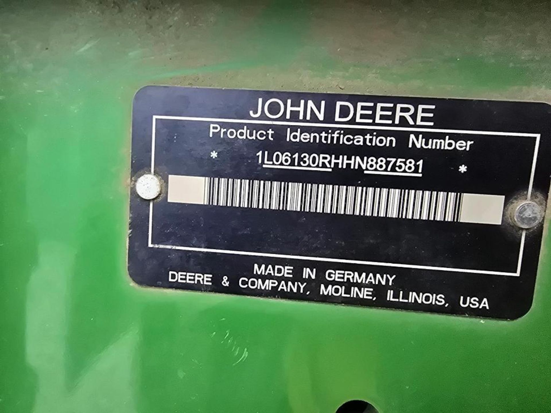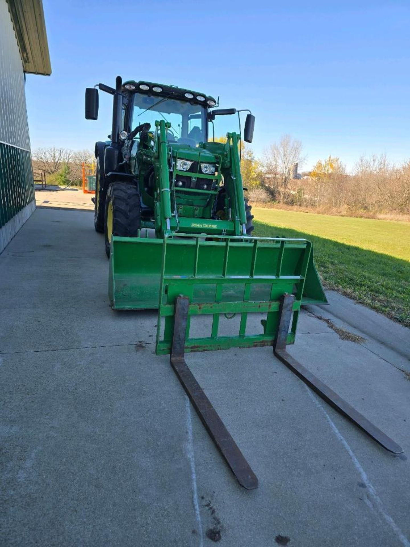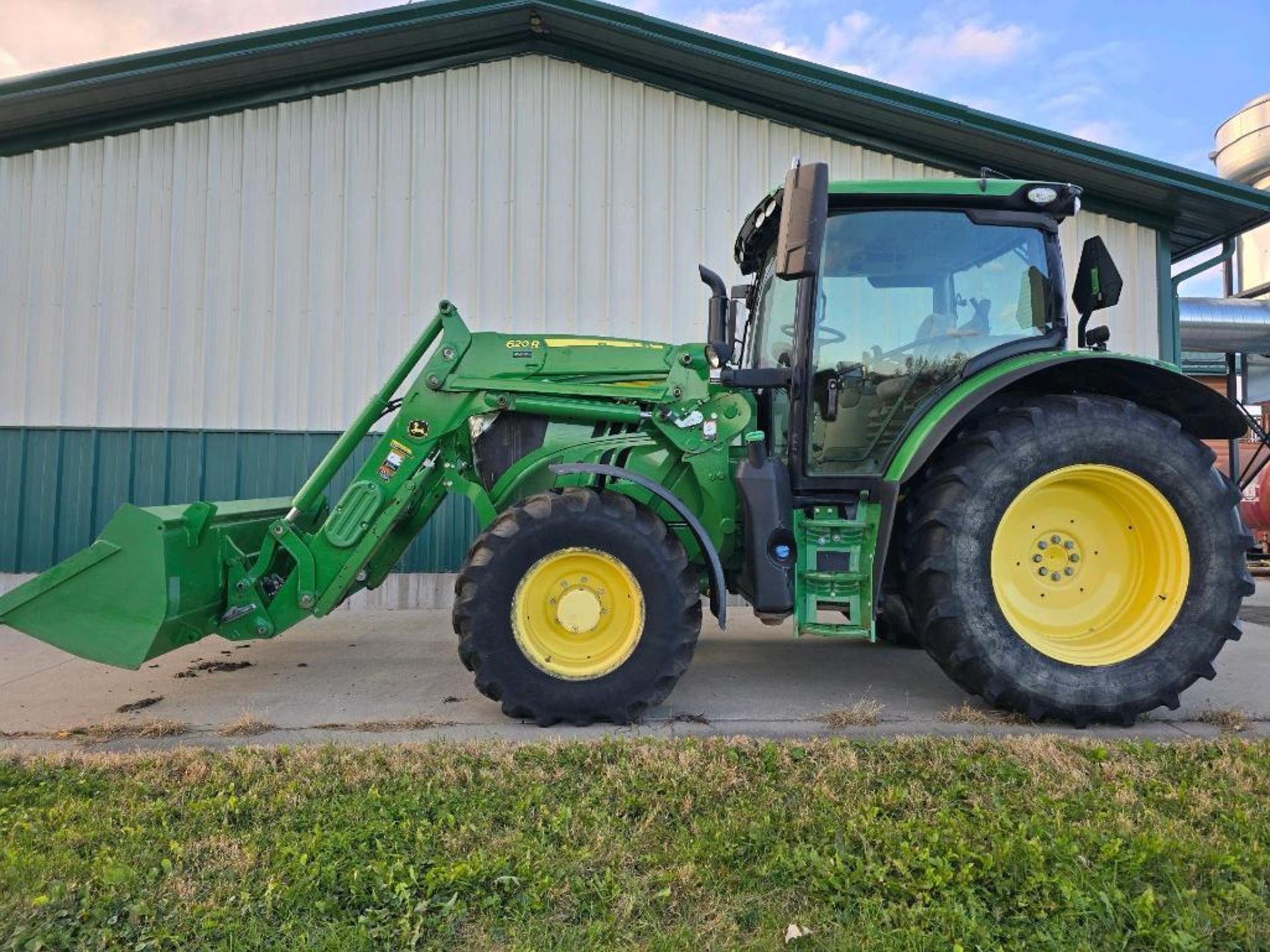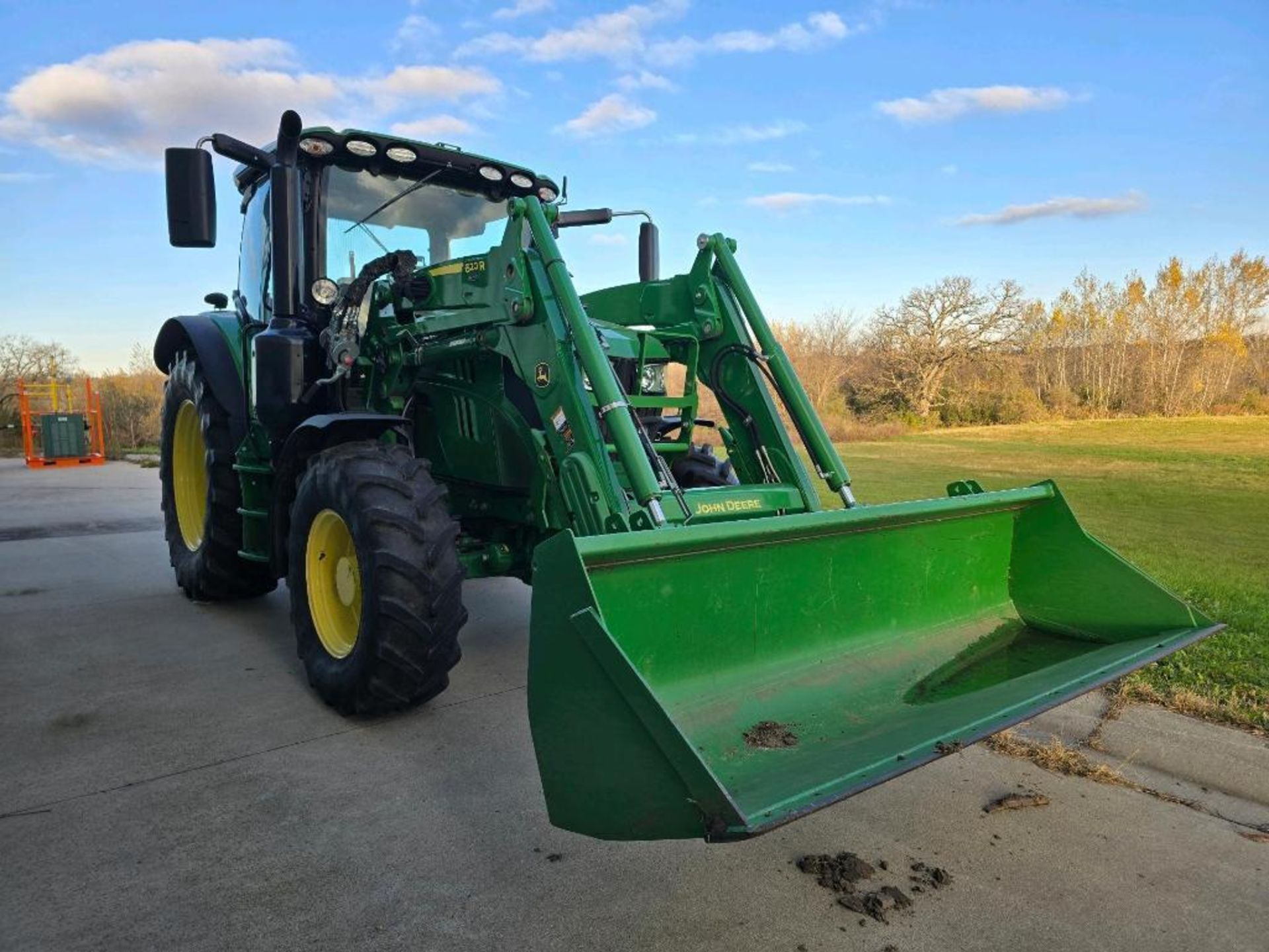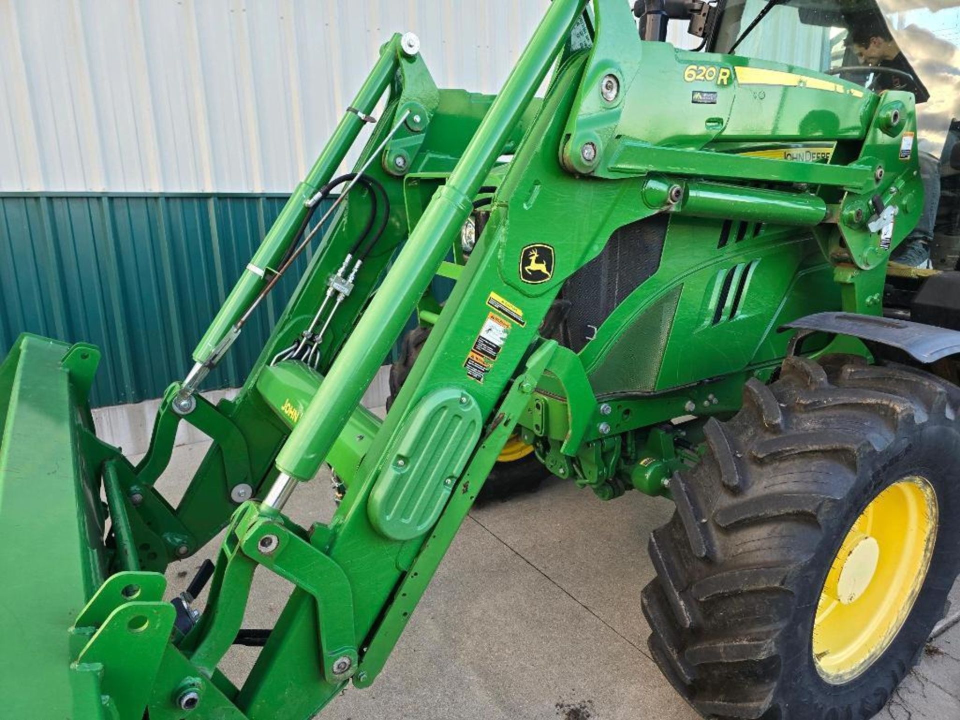 JOHN DEERE 6130R TRACTOR. Product ID: 1L06130RHHN887581. Includes 620R loader bucket and forklift attachment, approximately 1527 hrs.