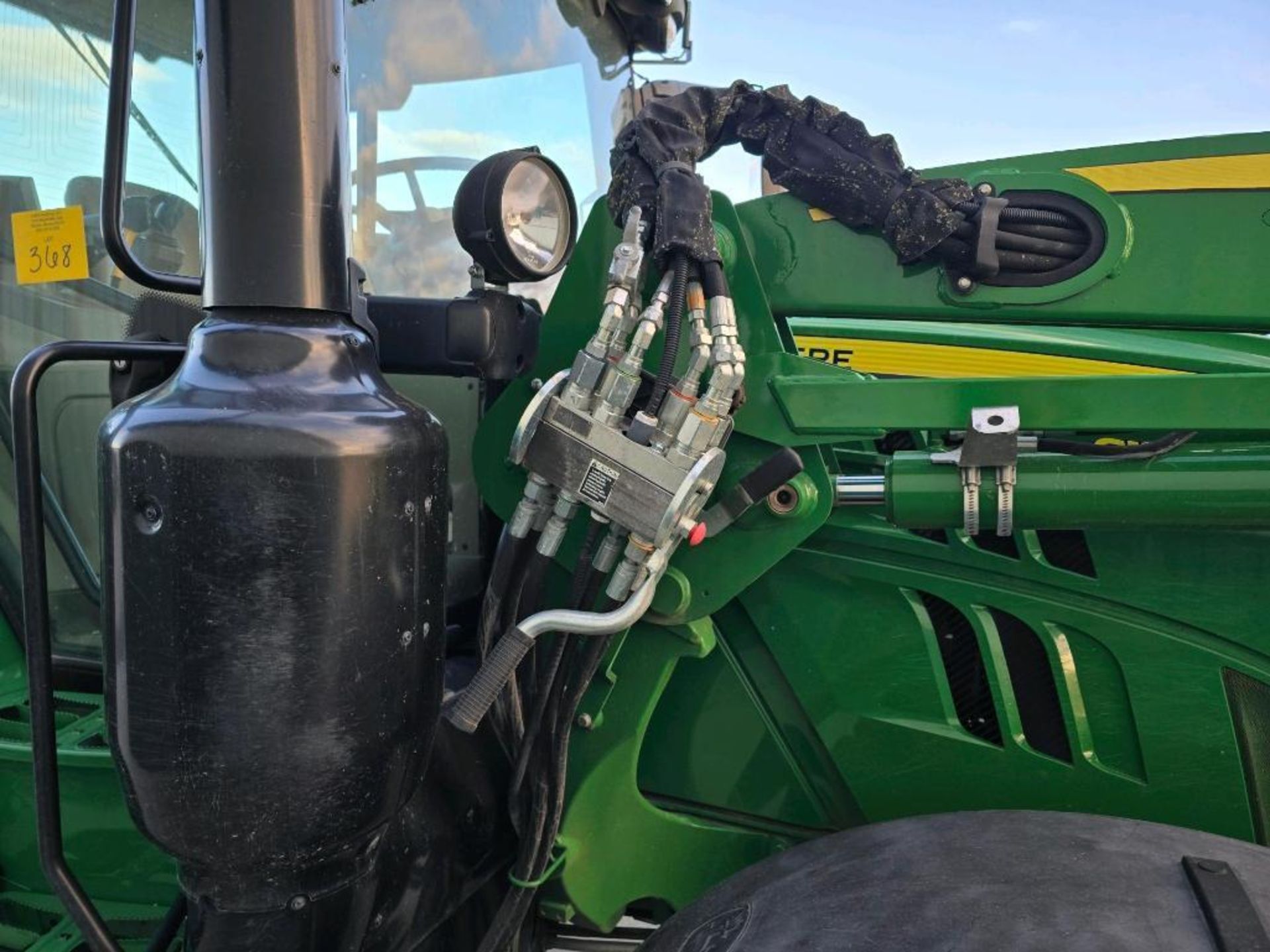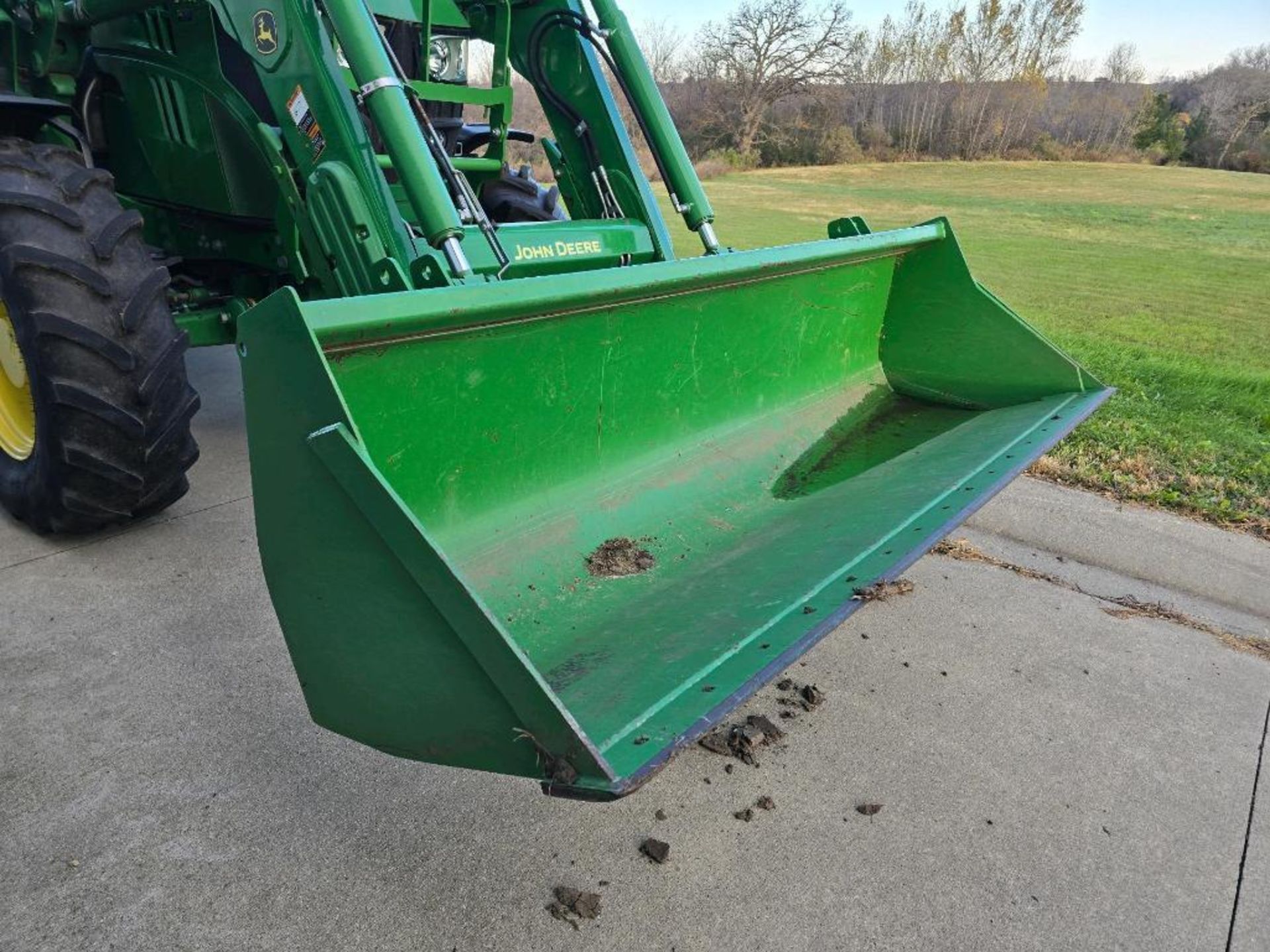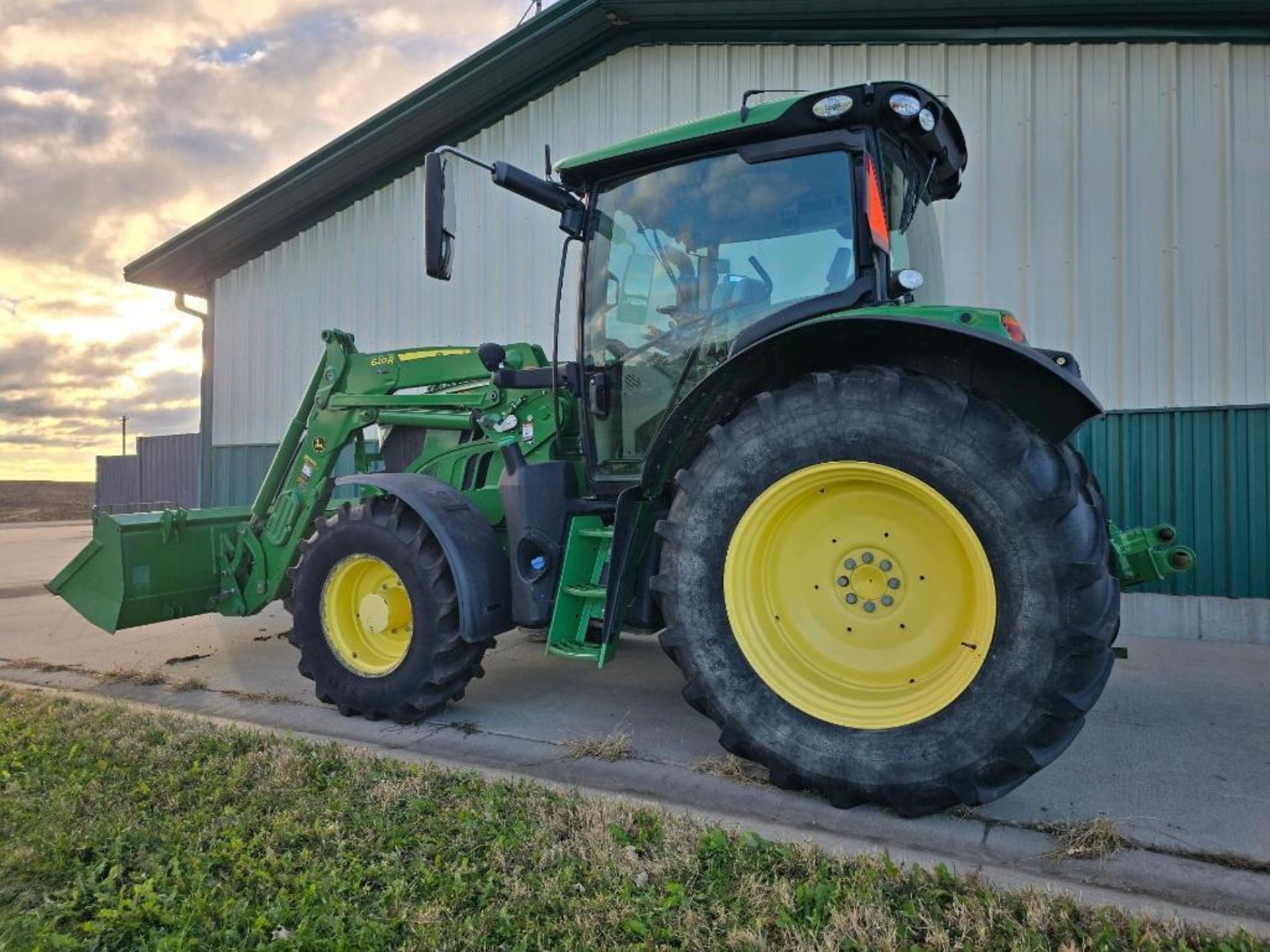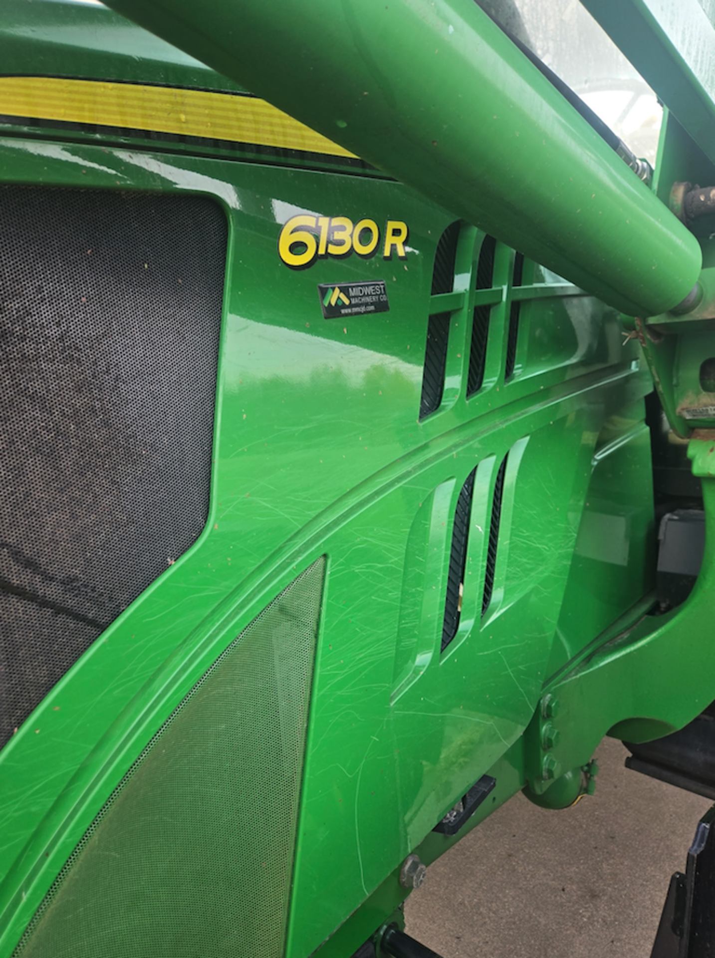 JOHN DEERE 6130R TRACTOR. Product ID: 1L06130RHHN887581. Includes 620R loader bucket and forklift attachment, approximately 1527 hrs.
