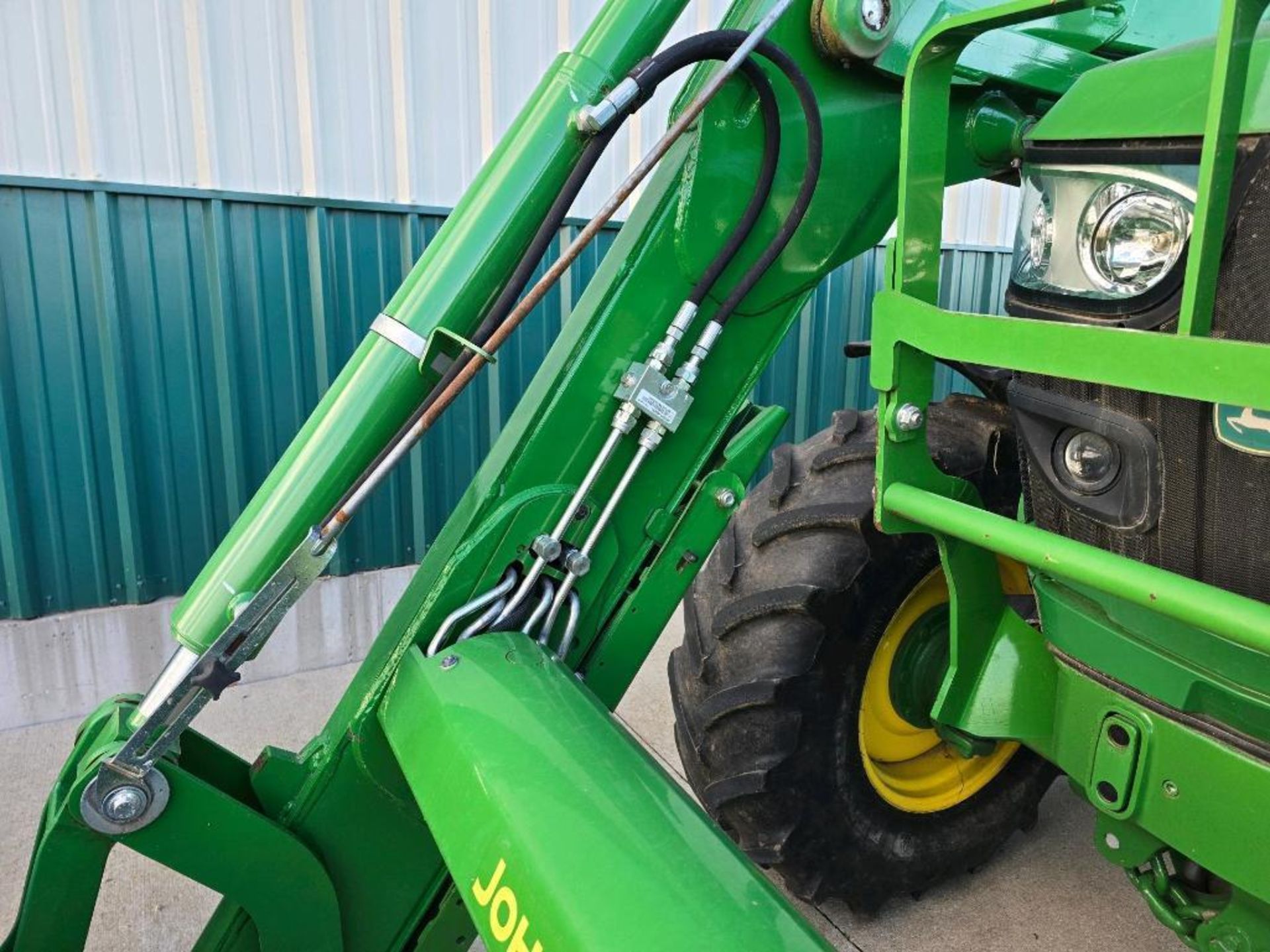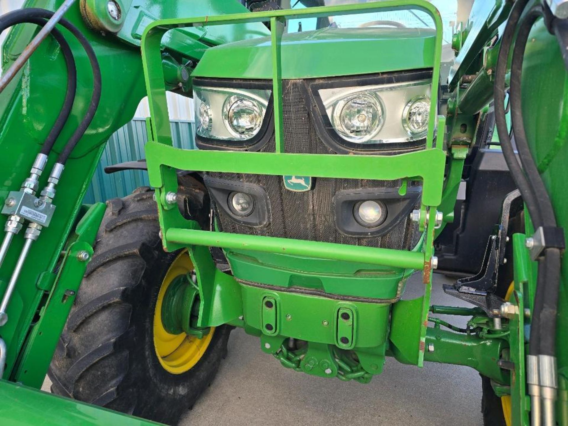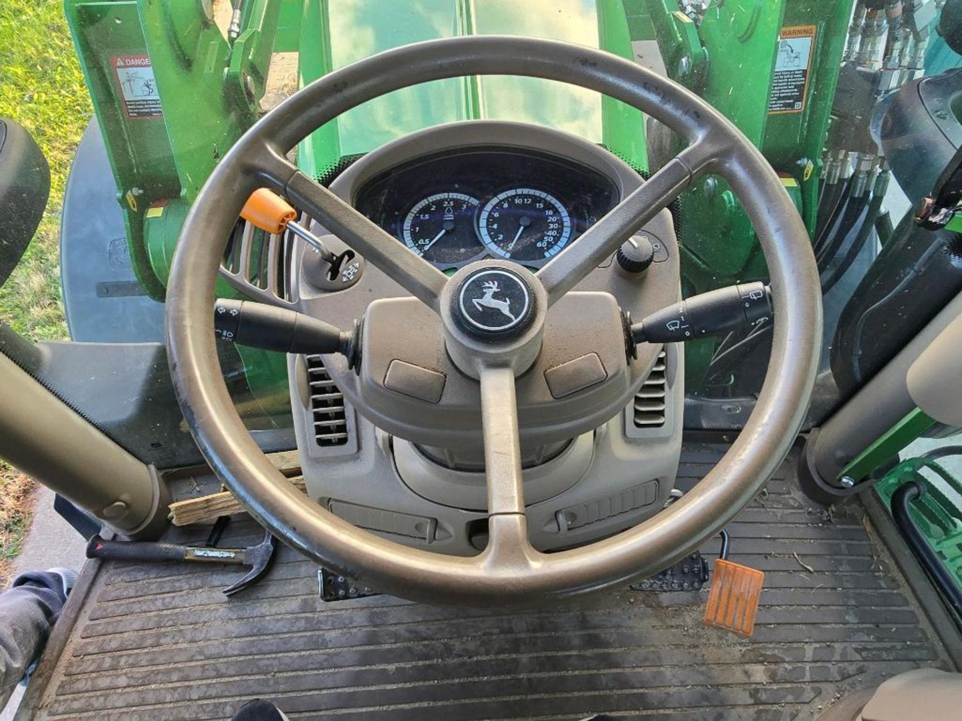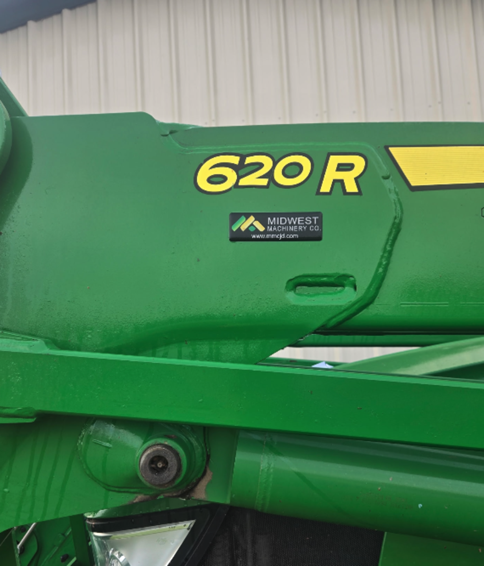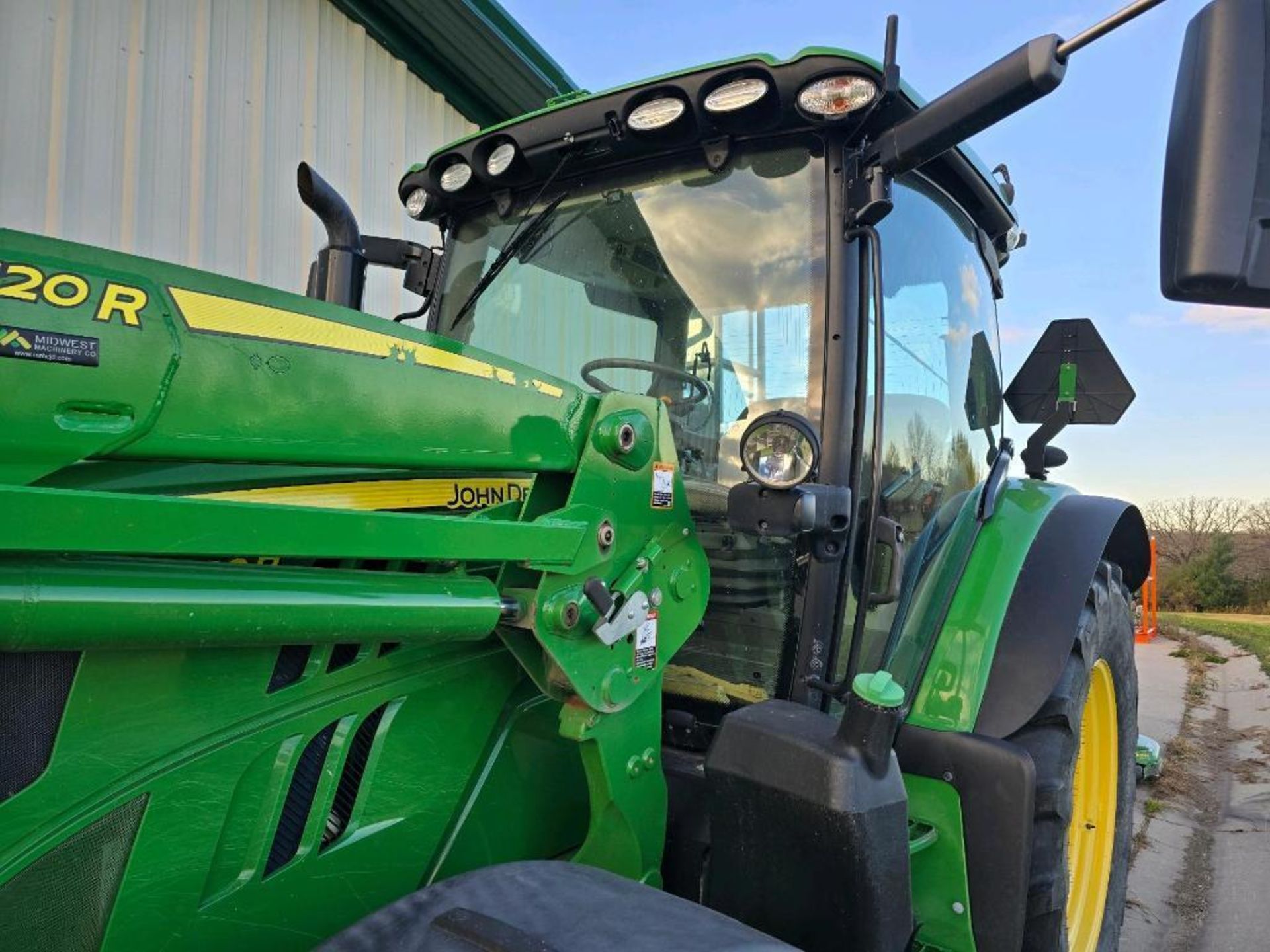 JOHN DEERE 6130R TRACTOR. Product ID: 1L06130RHHN887581. Includes 620R loader bucket and forklift attachment, approximately 1527 hrs.