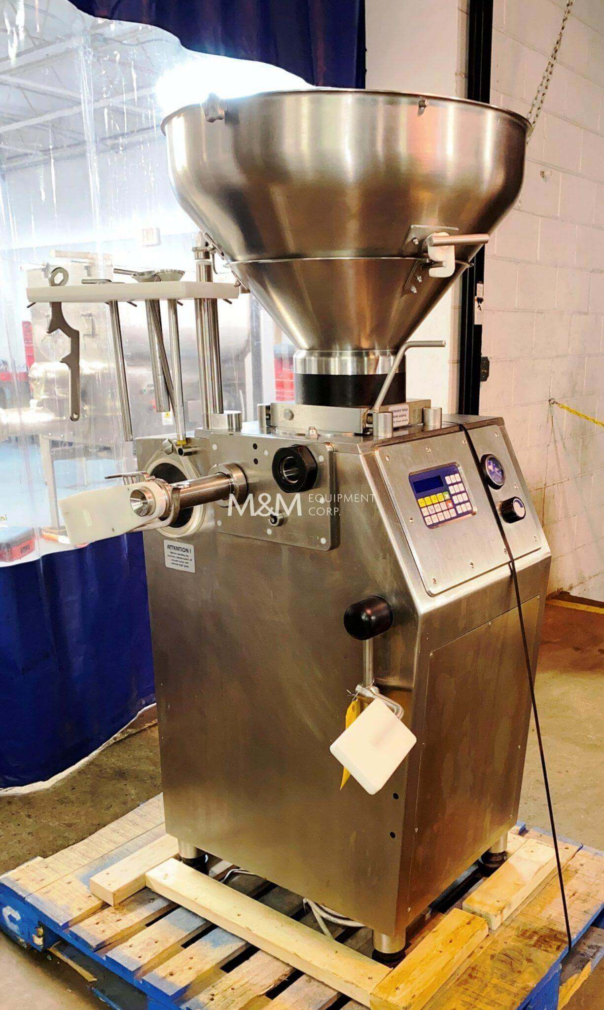Marlen Opti 100 Vacuum Stuffer. All stainless steel construction, Maximum Capacity: 10,000 lbs/hr, Product outlet: 4″, Current interrupt capacity: 10 kA, FLA: 10 A, dB(A): 87, kW: 12, 110V/1PH/60HZ.