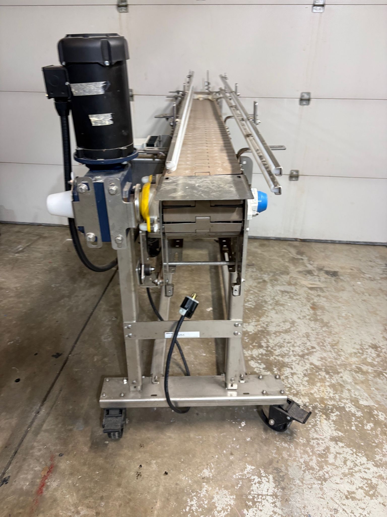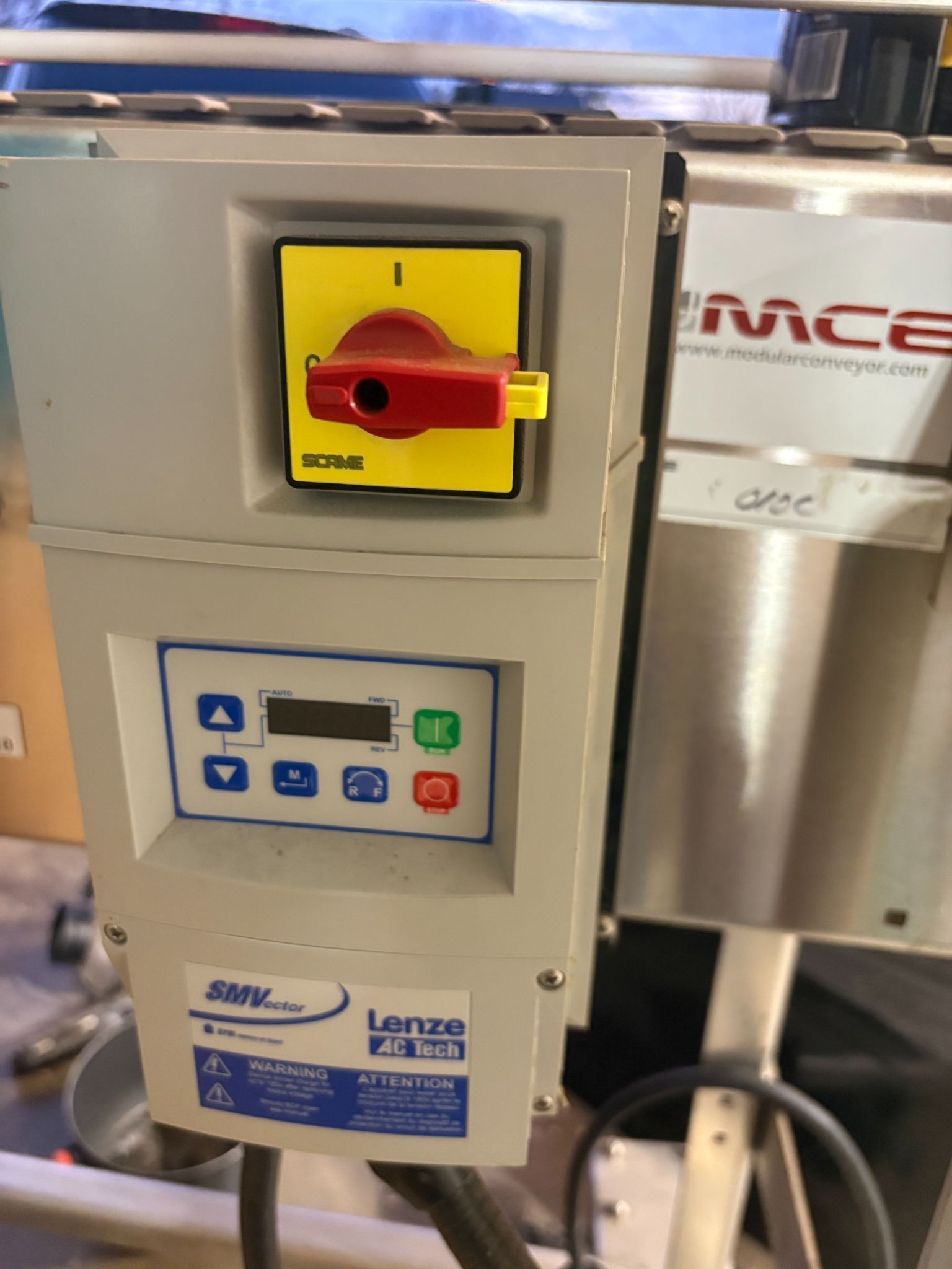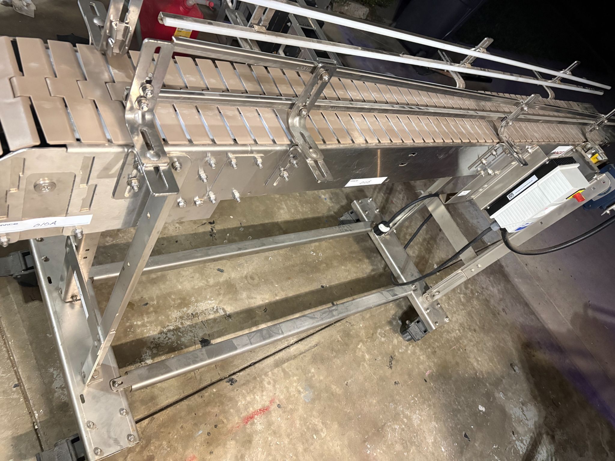 MCE 618 TECHMASTER CONVEYOR. Stainless steel construction, Includes: control panel and motor, Motor: 1 HP, 7 ft long, Belt width: 7 1/2″, Discharge and In-feed: 45 1/2″, 240V/1PH/60HZ. 5 Amps.