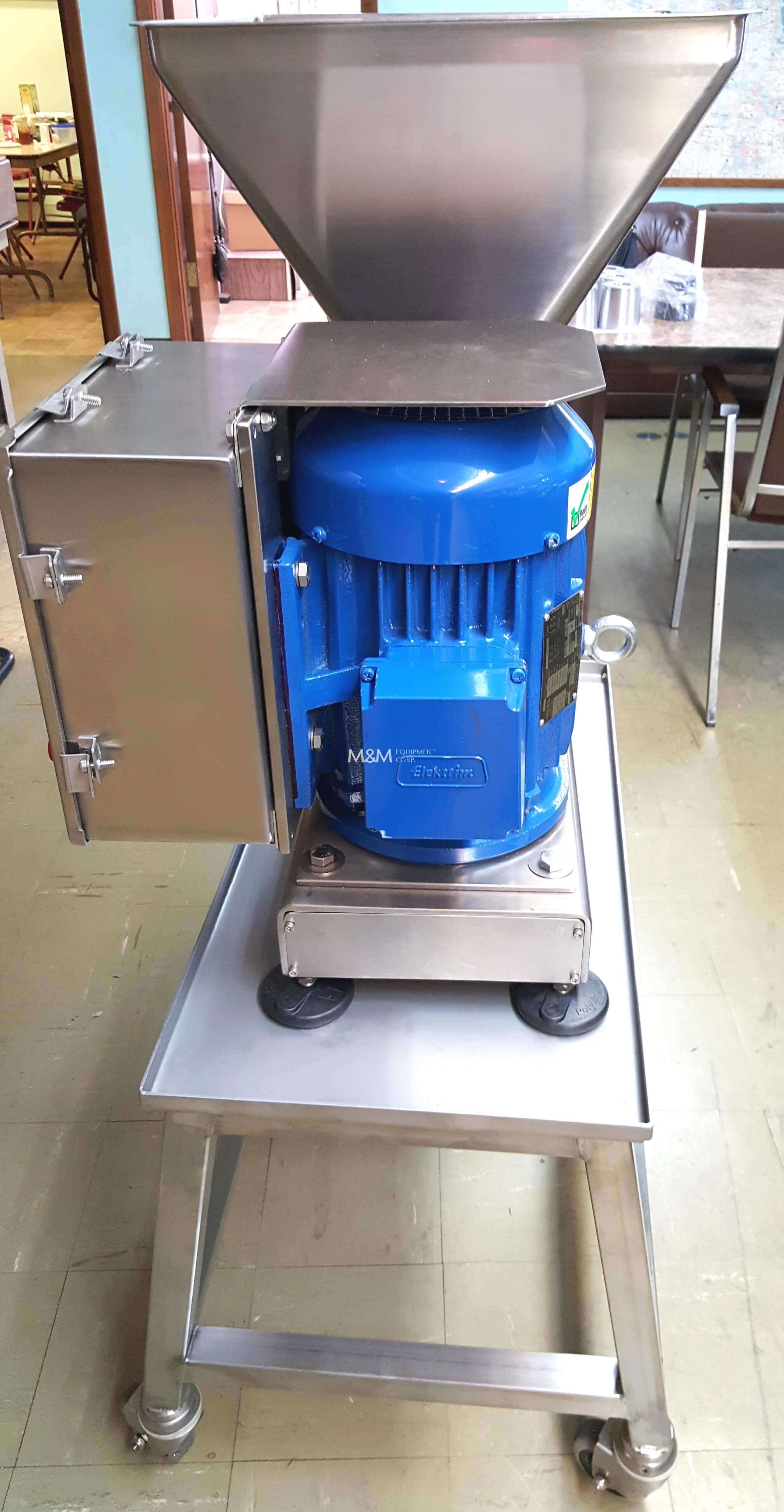 Mince Master Emulsifier. 5hp motor. 3600 RPM motor. 220V/3PH/60HZ. 86mm diameter single plate. Hole sizes range 1.4mm to 4.0mm. Output of 30-45 pounds/min.of emulsion. 50 pound capacity hopper. Includes plate, knife, manual and tools.