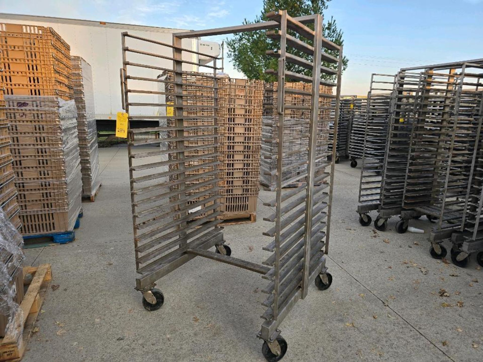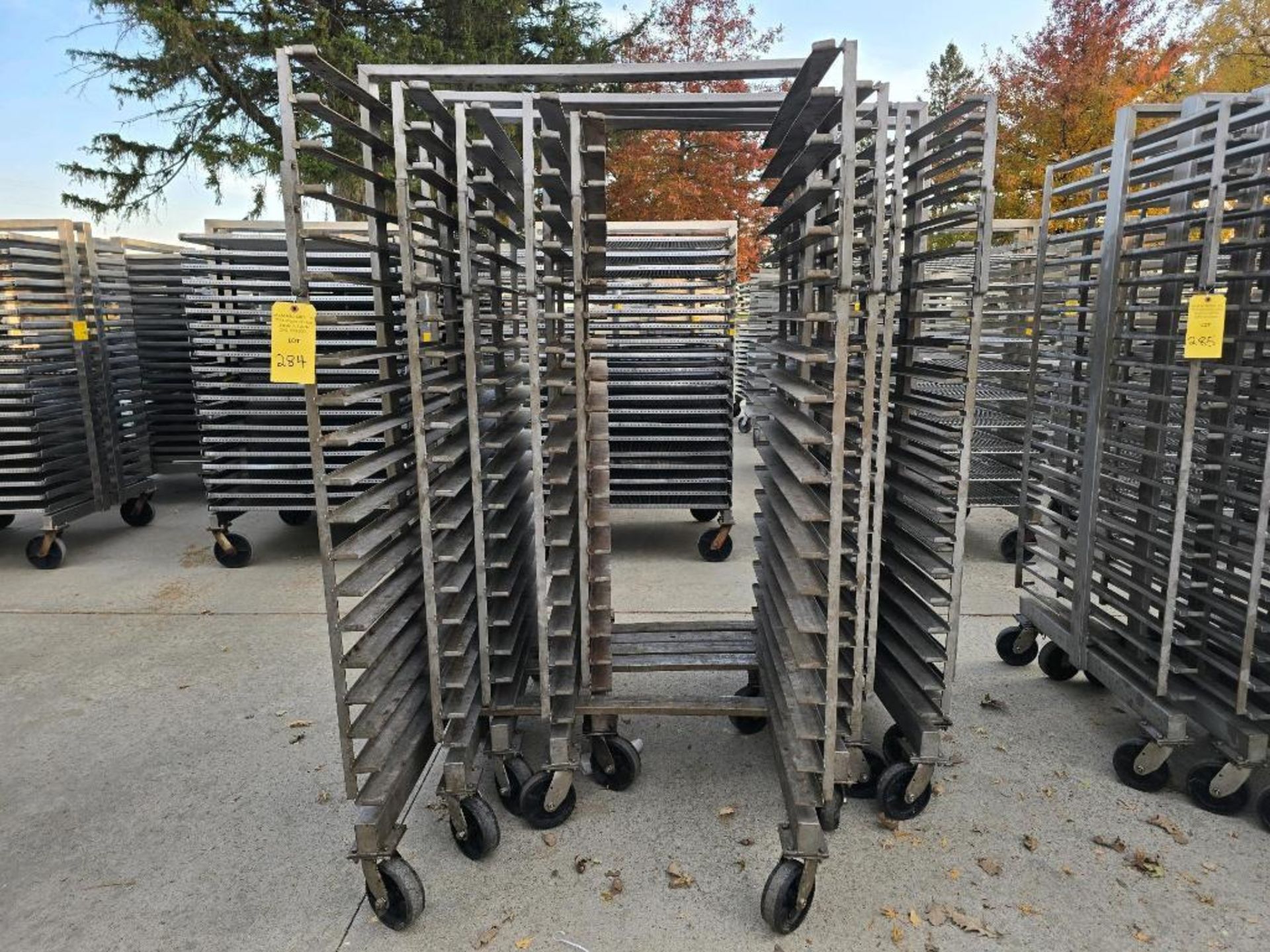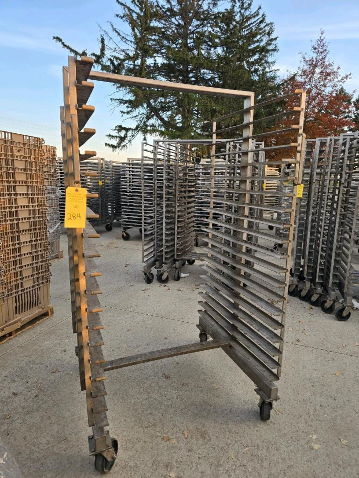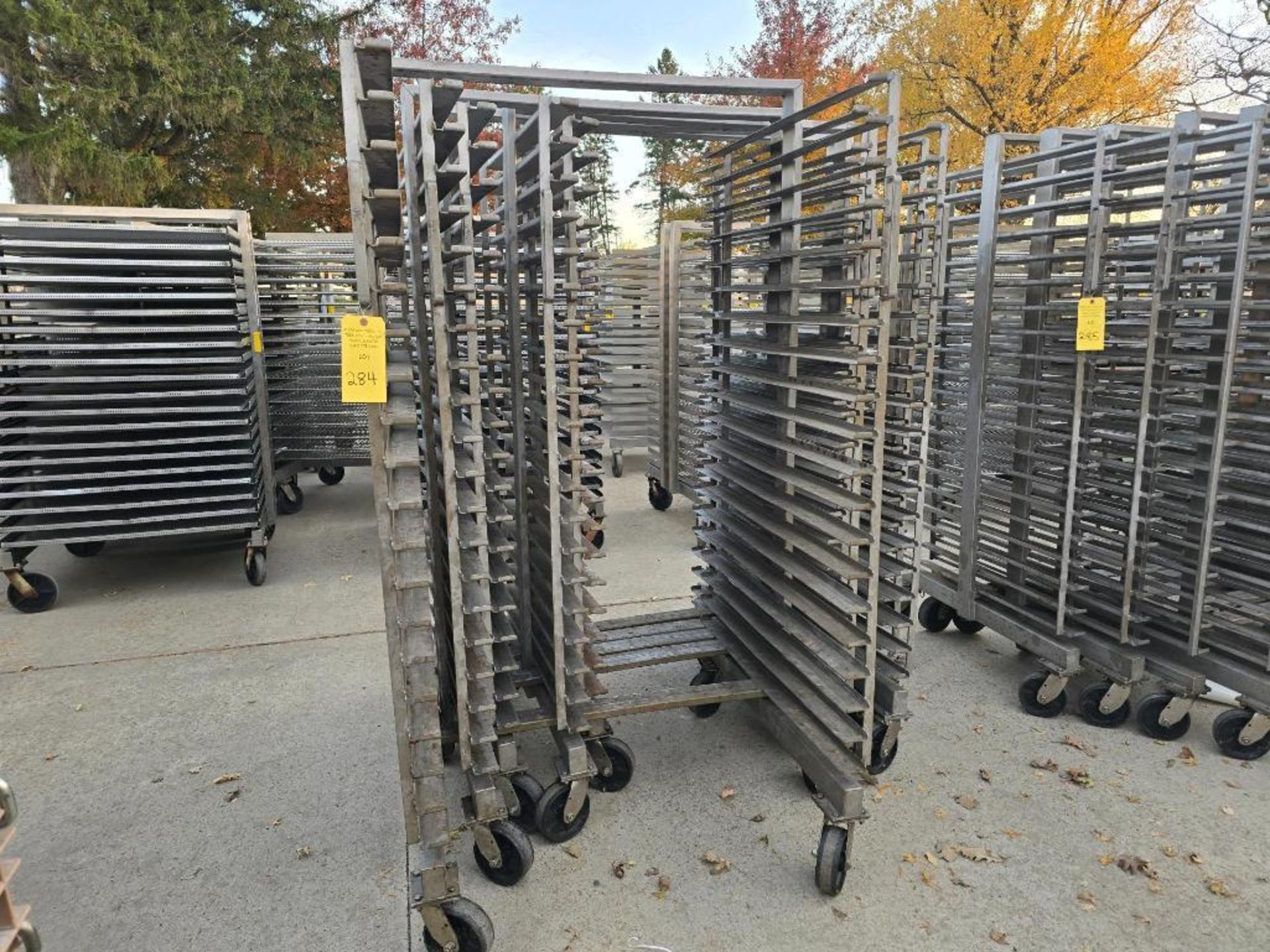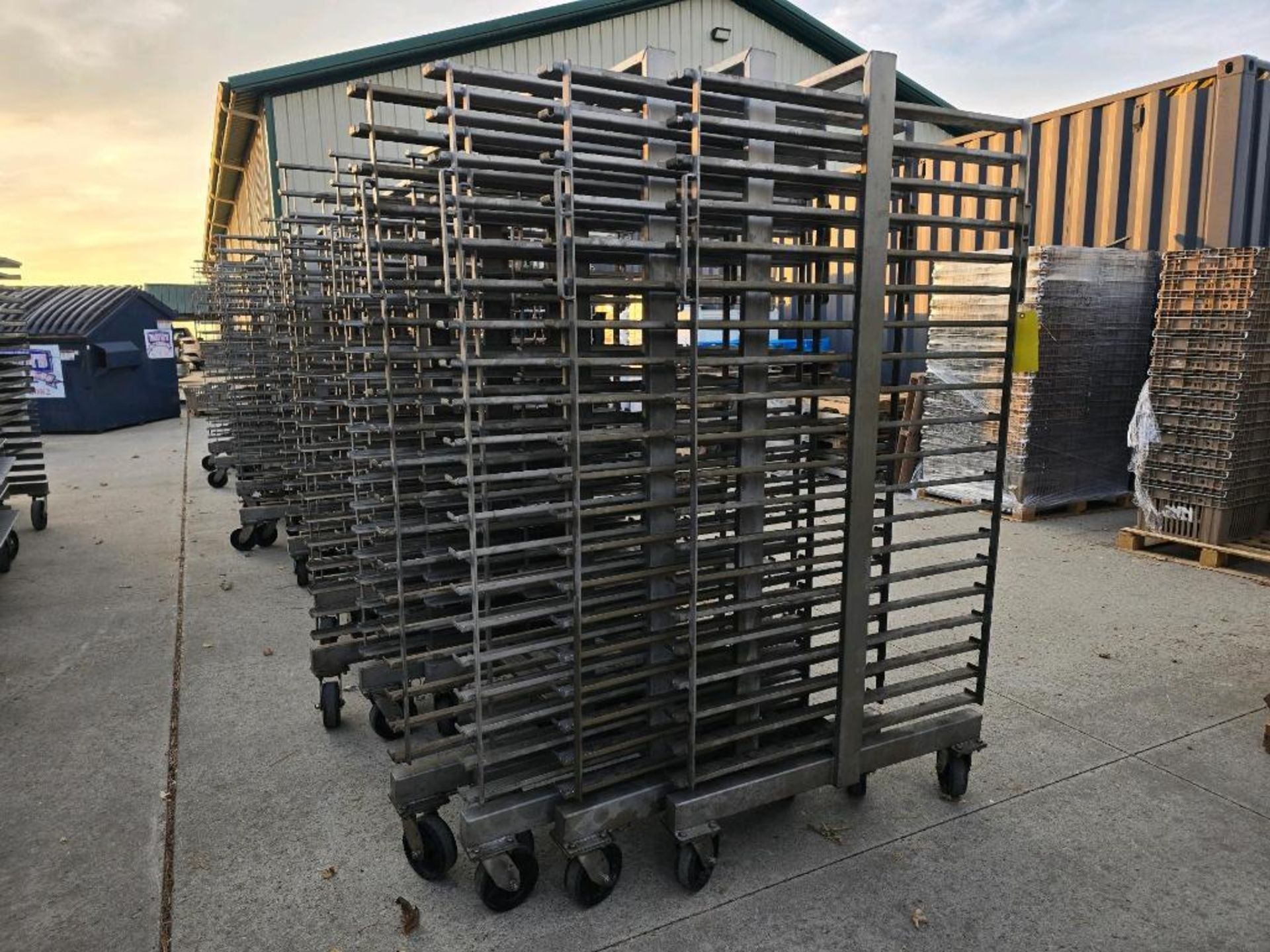 NESTING SMOKEHOUSE TRUCKS, OD: 40.5″ x 44″ x 78″ with 20 shelves spaced 3.25″ apart. Set up for 41.5″ x 40″ smokehouse screen.