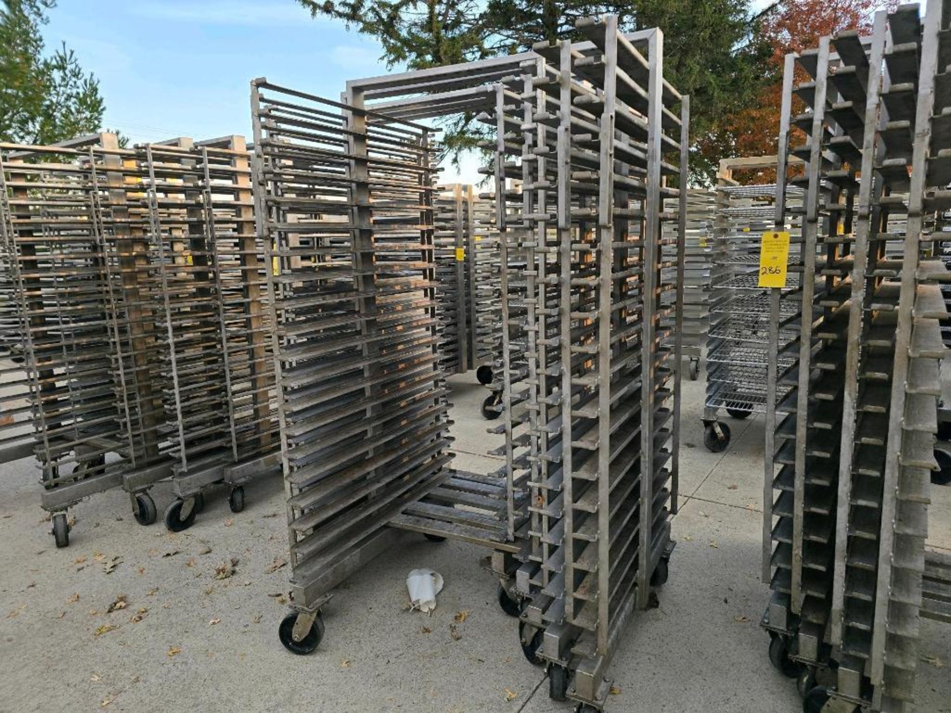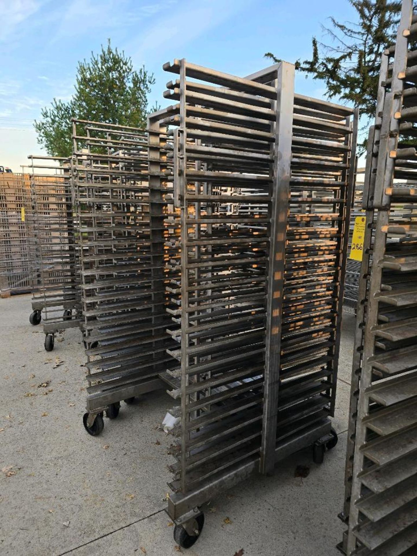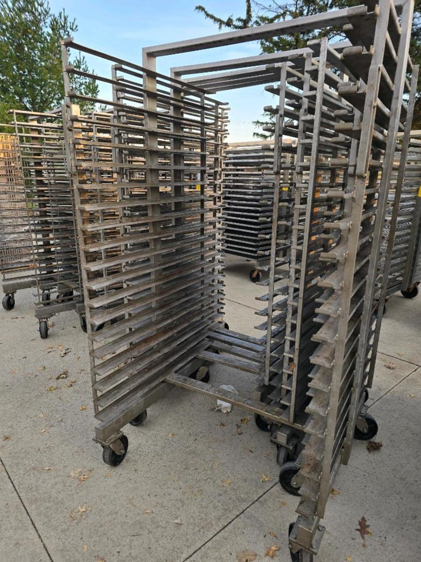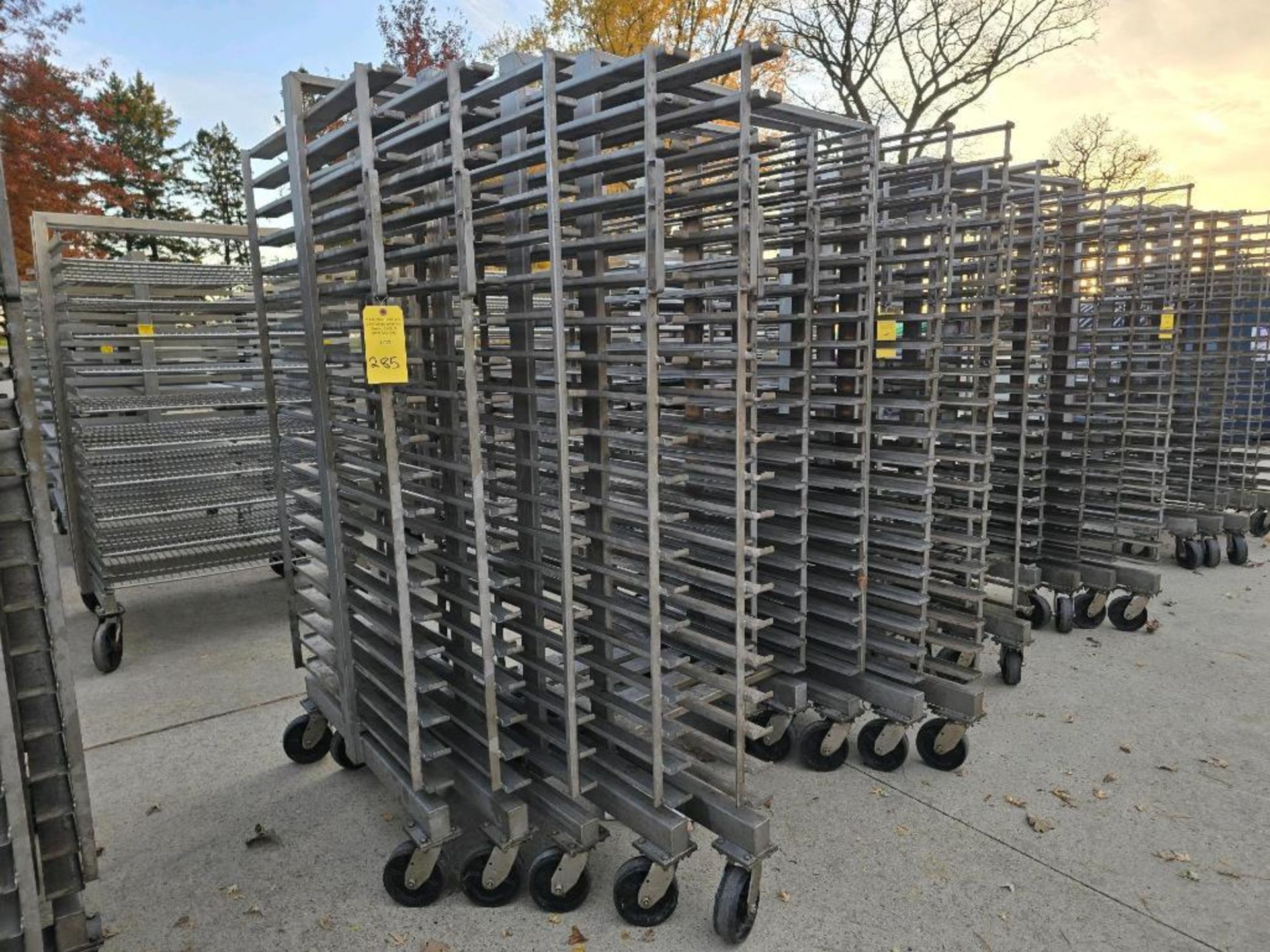 NESTING SMOKEHOUSE TRUCKS. OD: 40.5″ x 44″ x 78″ with 20 shelves spaced 3.25″ apart. Set up for 41.5″ x 40″ smokehouse screen.