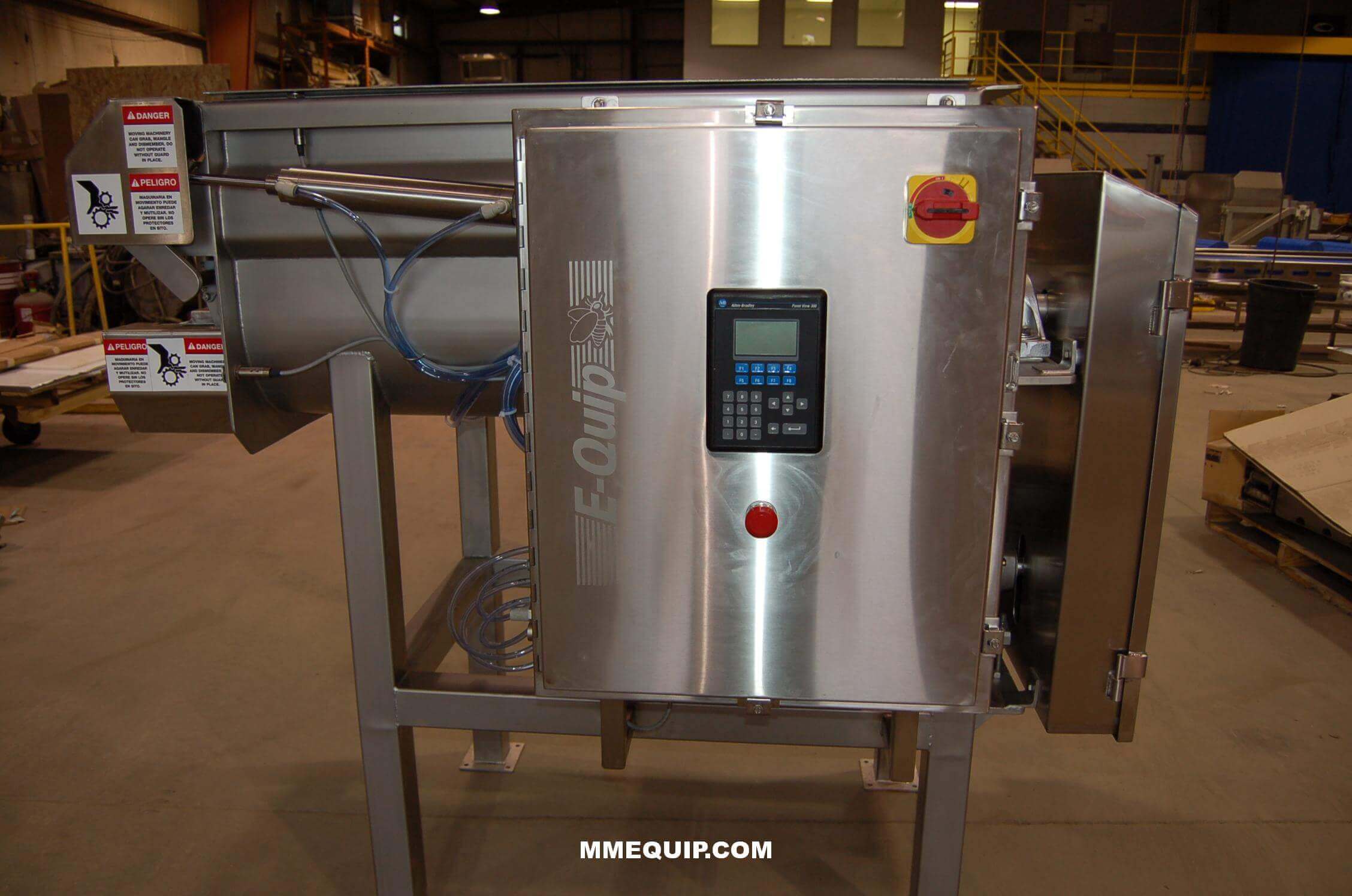 New E-Quip 307 Paddle Blender, all stainless steel construction, 500 Lbs. capacity, dual solid shaft mix paddles. Dual end pneumatic discharge doors, (2) 3HP drive motors. Safety bar grating over mixer and discharge doors with safety interlocks. Discharge height to customers needs. Includes electrical and Pneumatic controls, NEMA 4X enclosure panel. 440/240V/3PH/60HZ.
