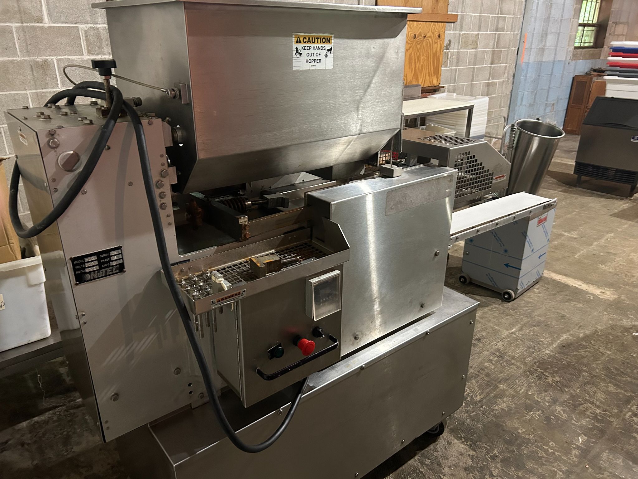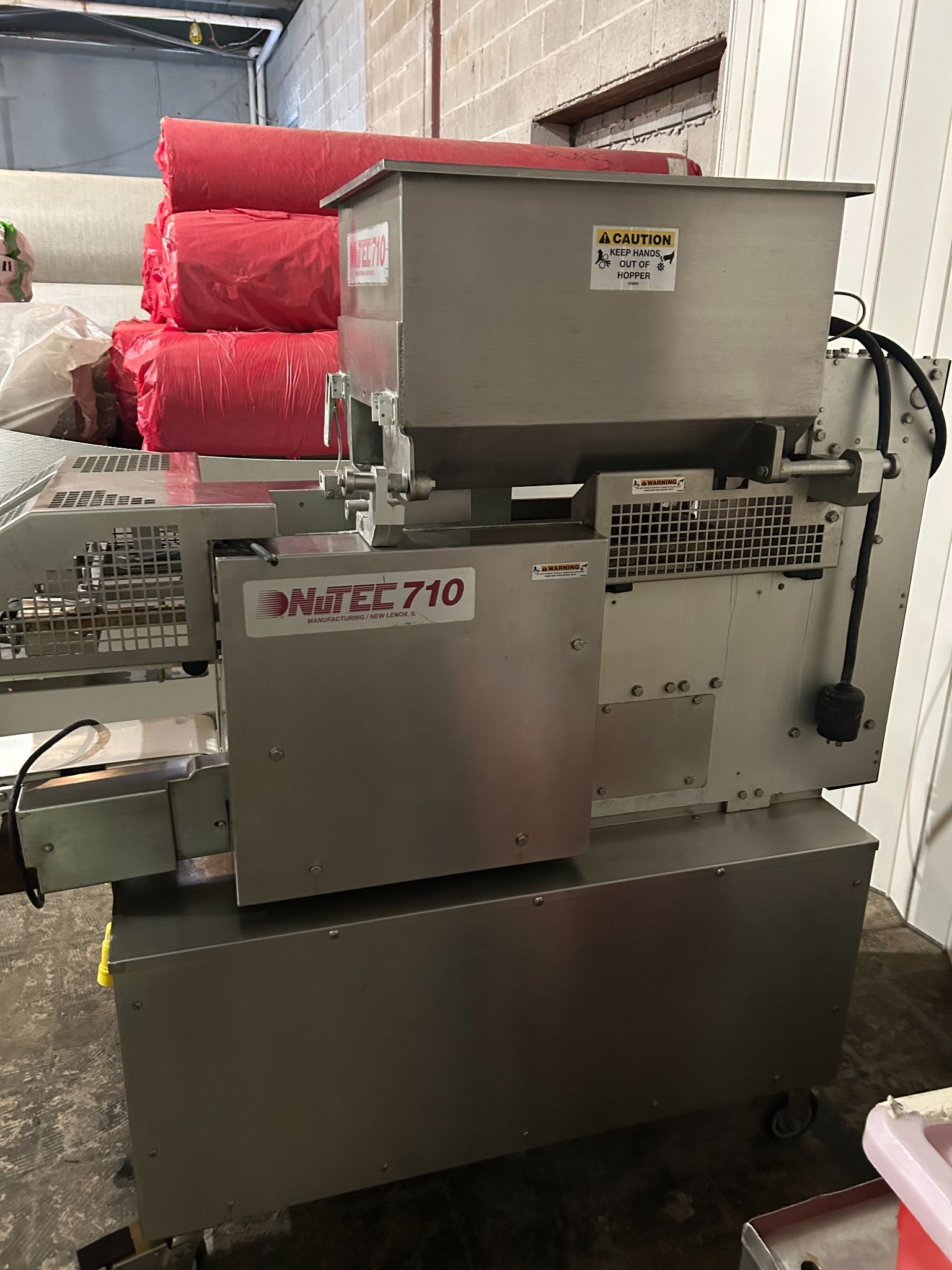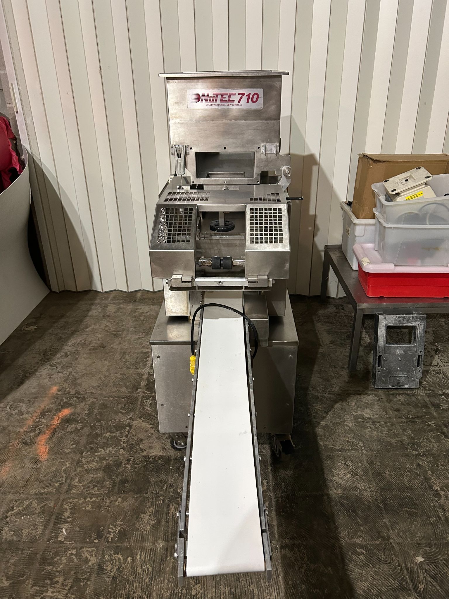 Nutec 710 Patty Former. All stainless steel construction, 175 Lb. capacity hopper, 2HP main drive, 4′ long exit conveyor with electronic counter for stacking, includes square paper feed system, up to 3,600 patties per hour, 230V/3PH/60HZ.