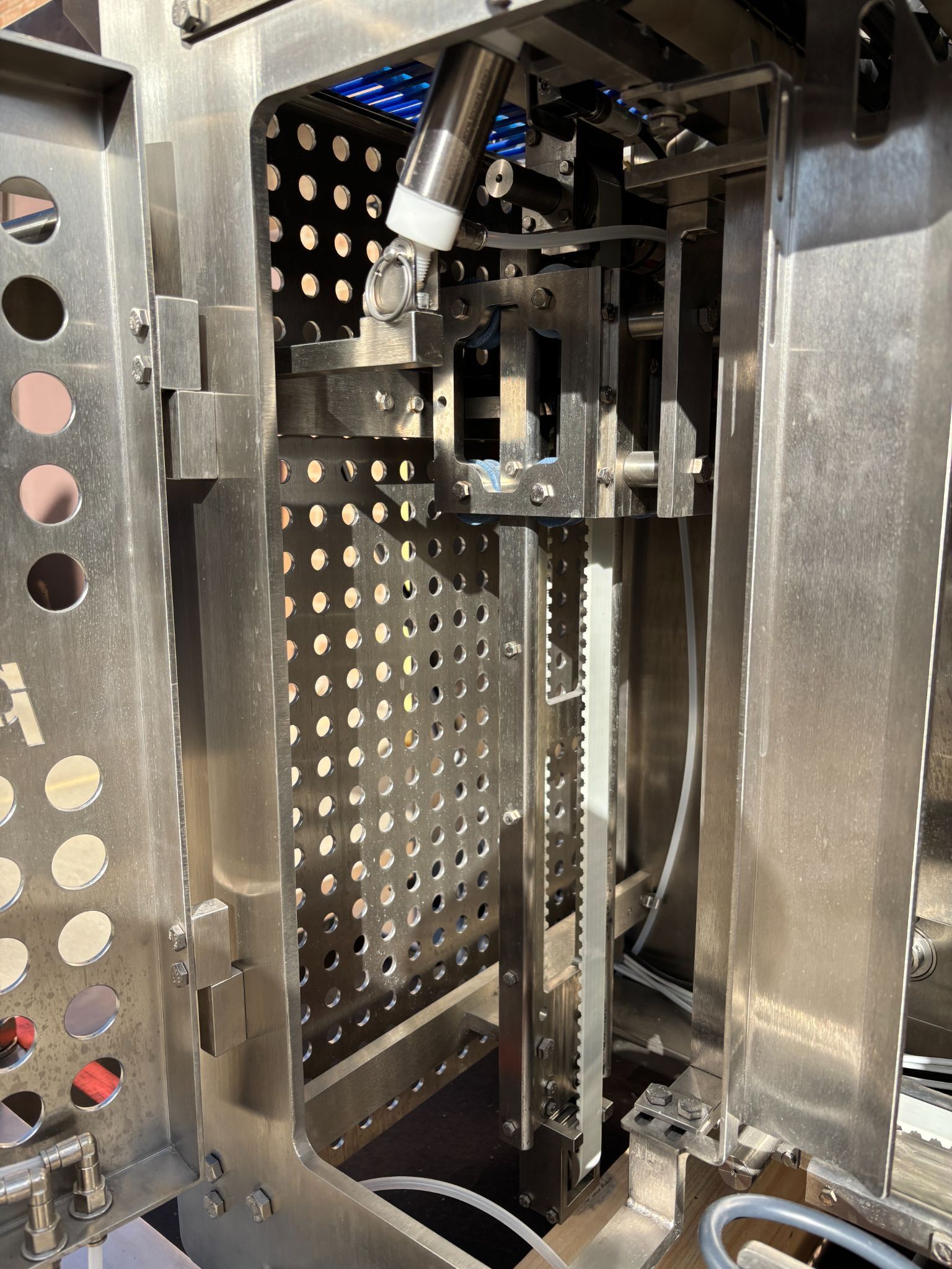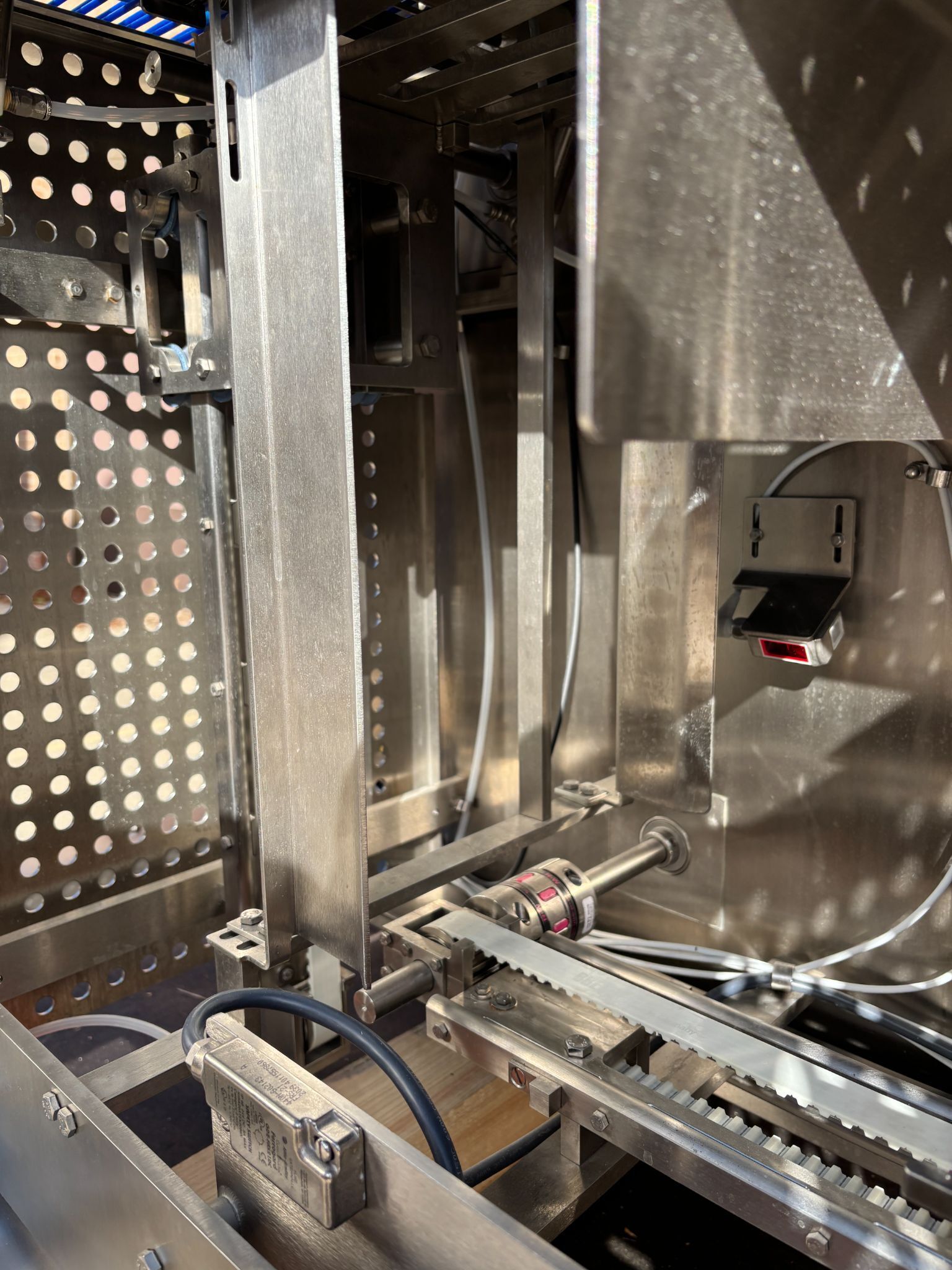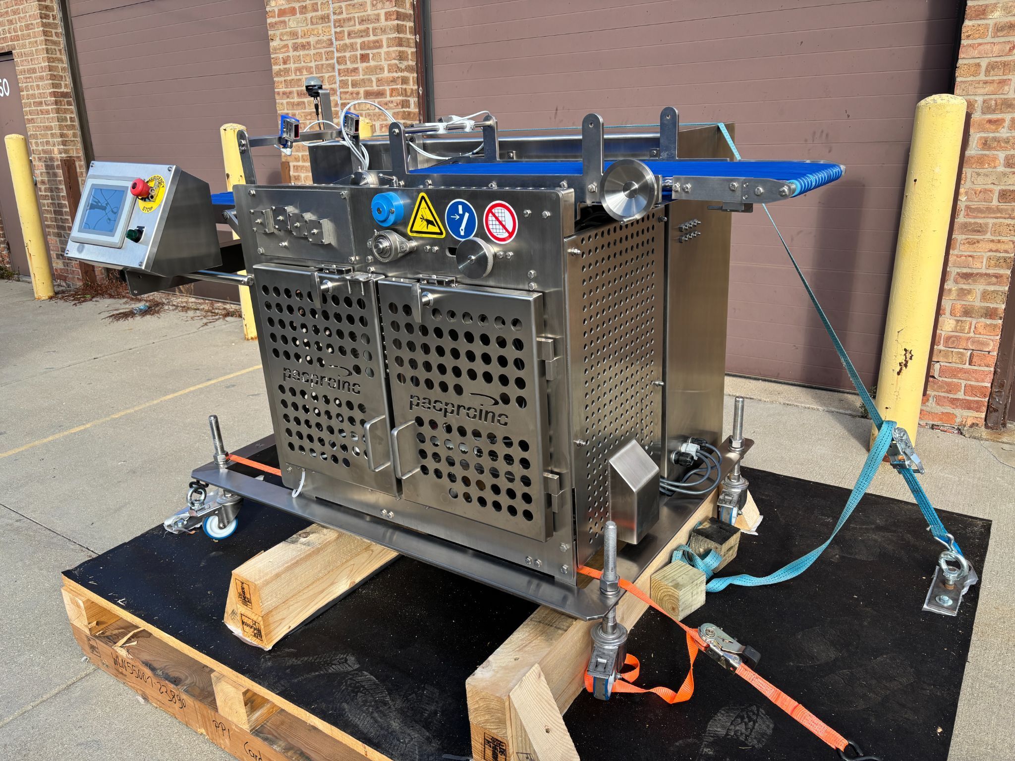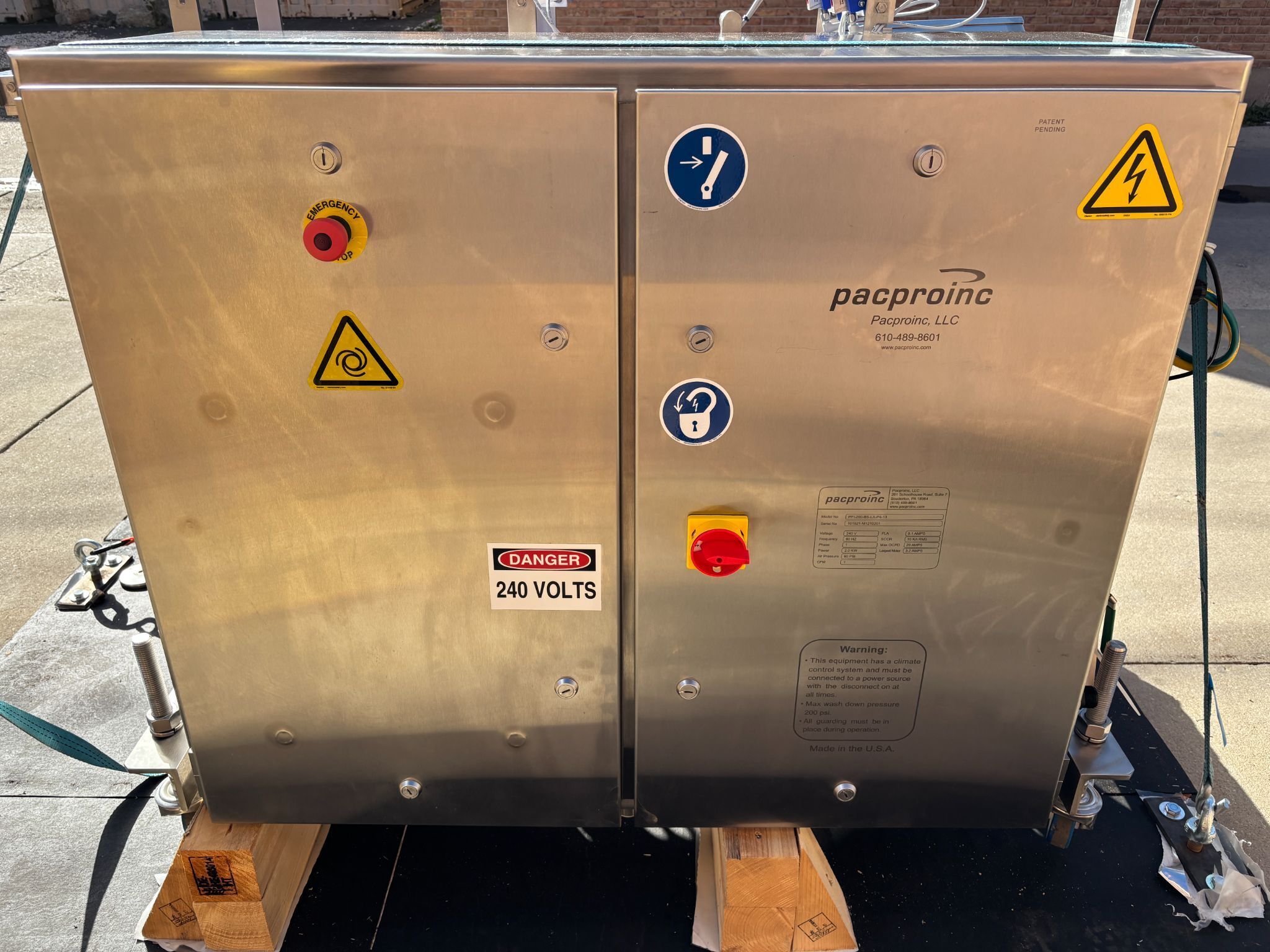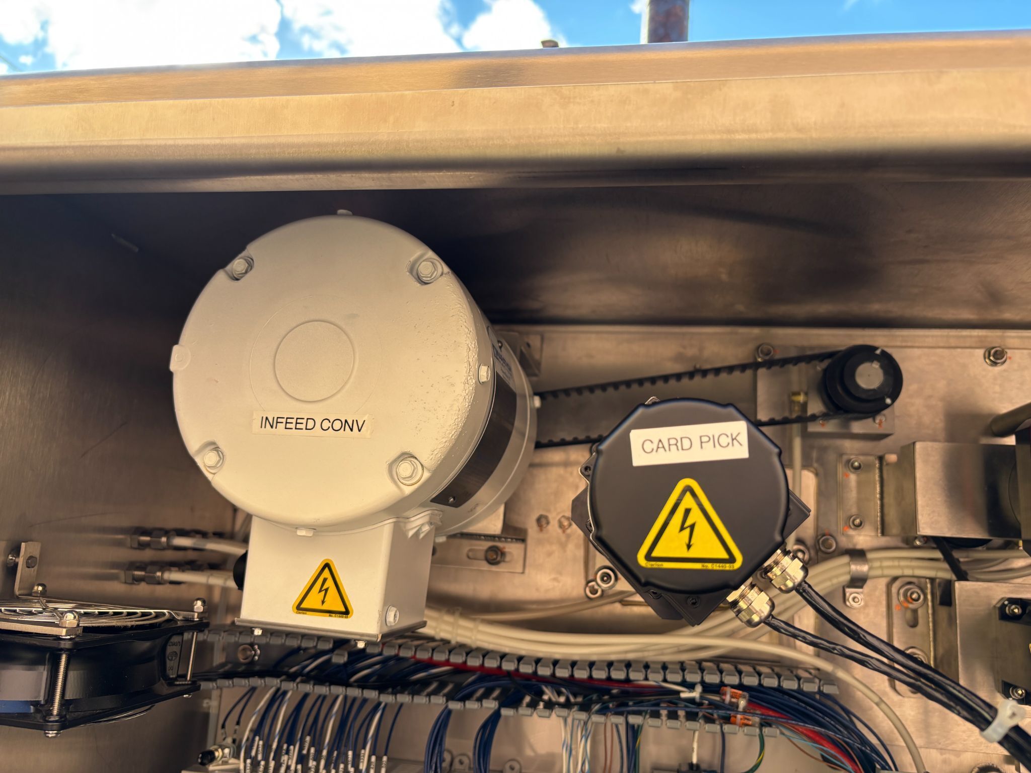 PACPROINC PPI-200 Card Dispenser. Year: 2022, all stainless steel construction, Runtime: Continuous operation with a magazine that reloads while running—no need to pause during use, Throughput: Up to 60 portions/minute, Format: shingled, Spacing: 10″, Product temperature: 24 °F, Stack Count: 15, Stack height: 2.5″, Environmental temperature: 32 to 80° F, Humidity: 5 – 95%, Supported Card Size Range: Maximum: 8.5″ L × 10″ W, Minimum: 5.25″ L × 8″ W, Supported Types: Versatile enough to handle L-boards, clear cards, window leading or flap leading styles, and various board designs, Pneumatic: Requires 85 PSIG at 0.5 SCFM, 440V/3PH/60HZ.