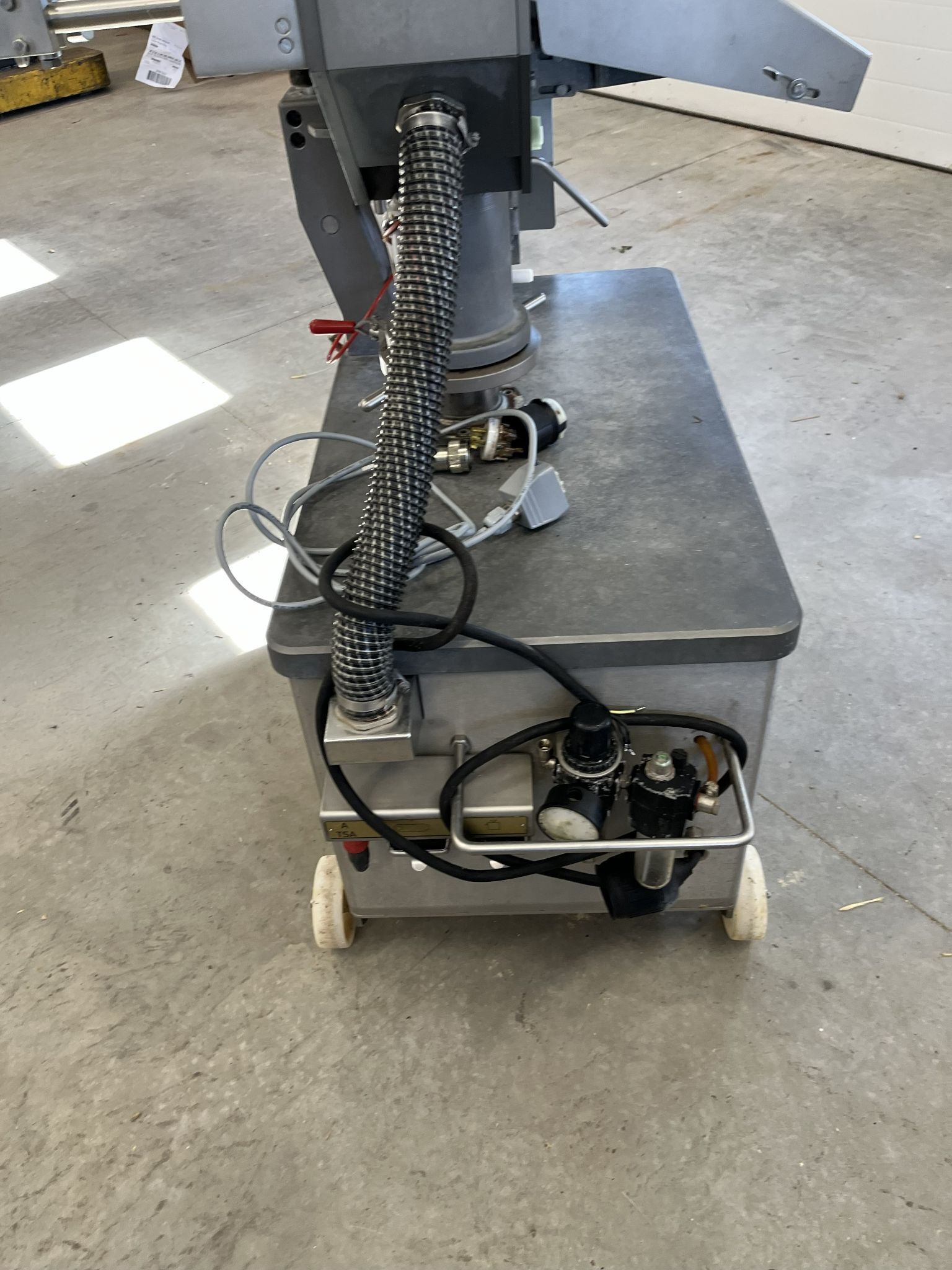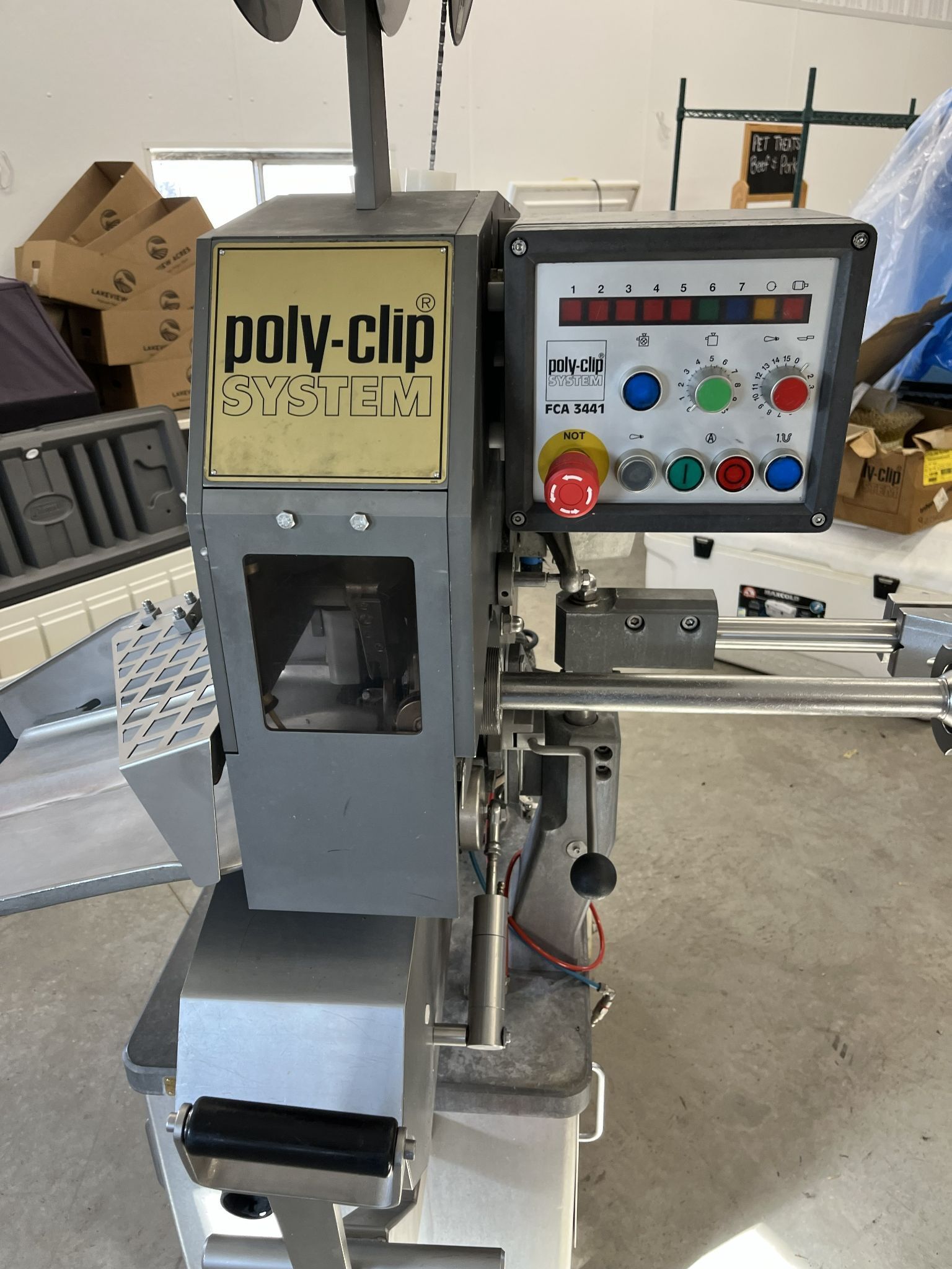 POLY-CLIP FCA 3441 CLIPPER. Stainless steel construction, Production speed: up to 140 chubs per minute, depending on application, For chubs up to 65 mm in diameter, Special voiding system ensures clean sausage tails, Suitable for round casings, Push button controls, Mounted on casters for mobility, Air: 5/7 bar, 220V/3PH/60HZ.