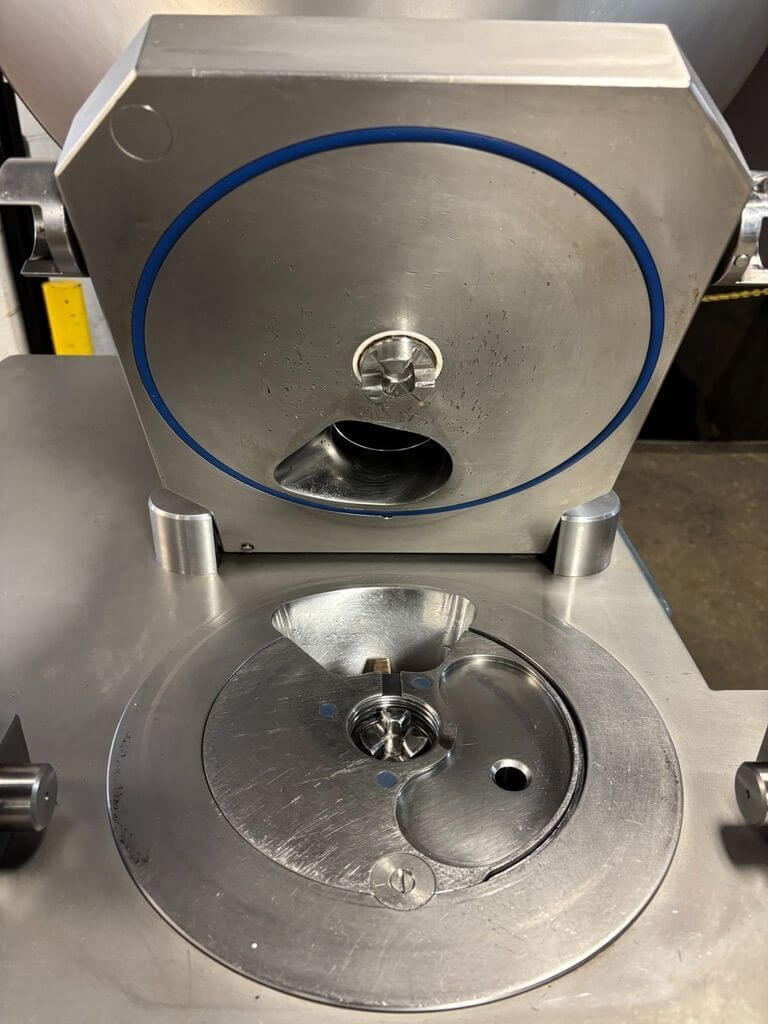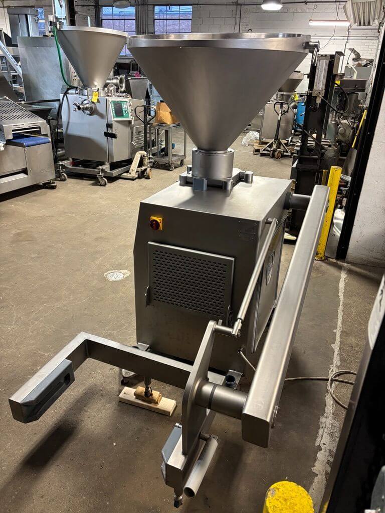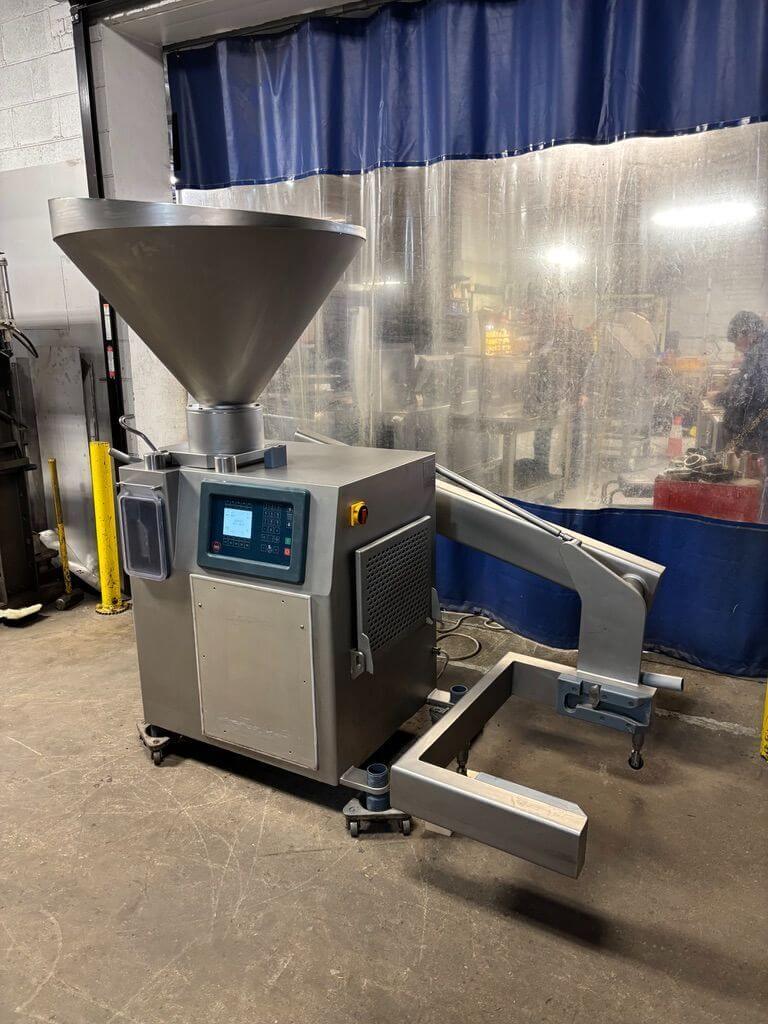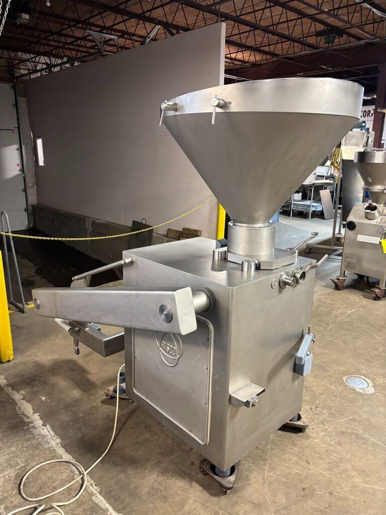 RISCO RS 205 CONTINUOUS VACUUM STUFFER. All stainless steel construction, Capacity: 3,400 kg/hr, Portion Speed: 600 – 620 pieces/min, Max filling pressure: 45 bar, Installed power: 6.3 kW, Hopper Capacity: 260 L, Portion weight range: 5g – 24kg, 440V/3PH/60HZ.