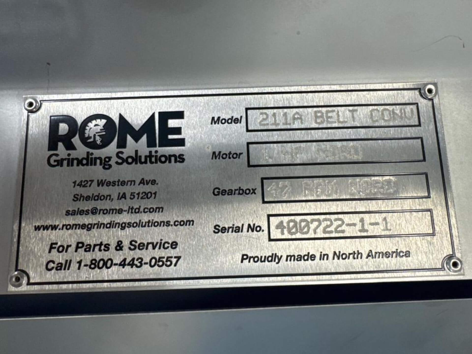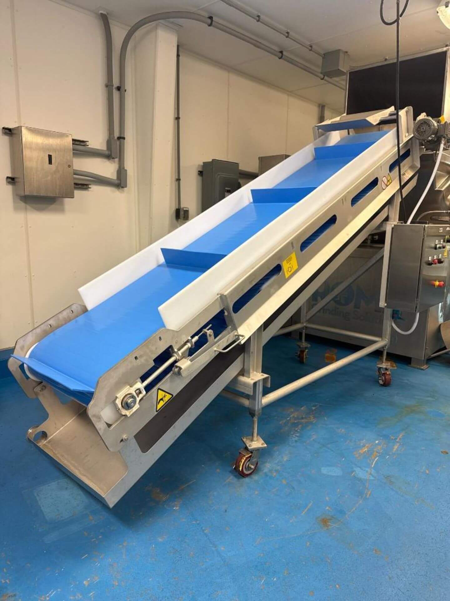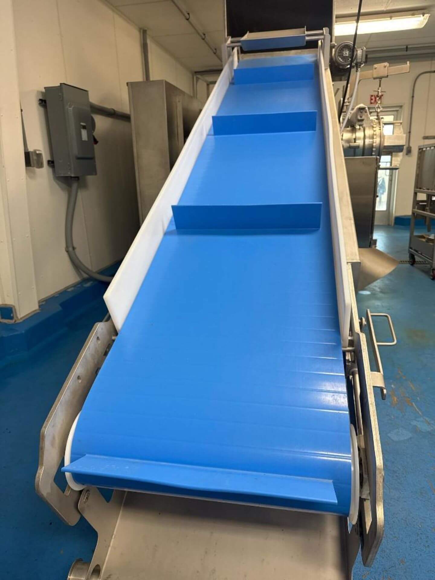 ROME 211A FROZEN BLOCK CONVEYOR. 1HP motor with VFD Controls, 27″ infeed, 80″ discharge, 24″ wide belt with 4″ cleats spaced 35″ apart. OD: 12′ x 46″ x 88″, 480V/3PH/60HZ.