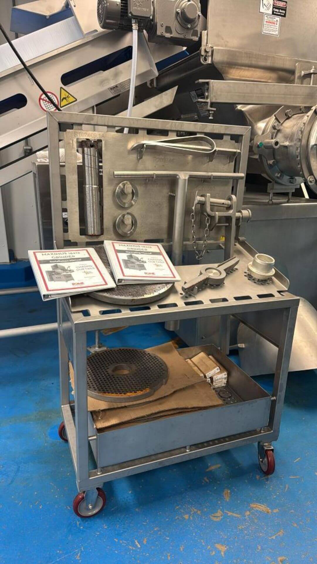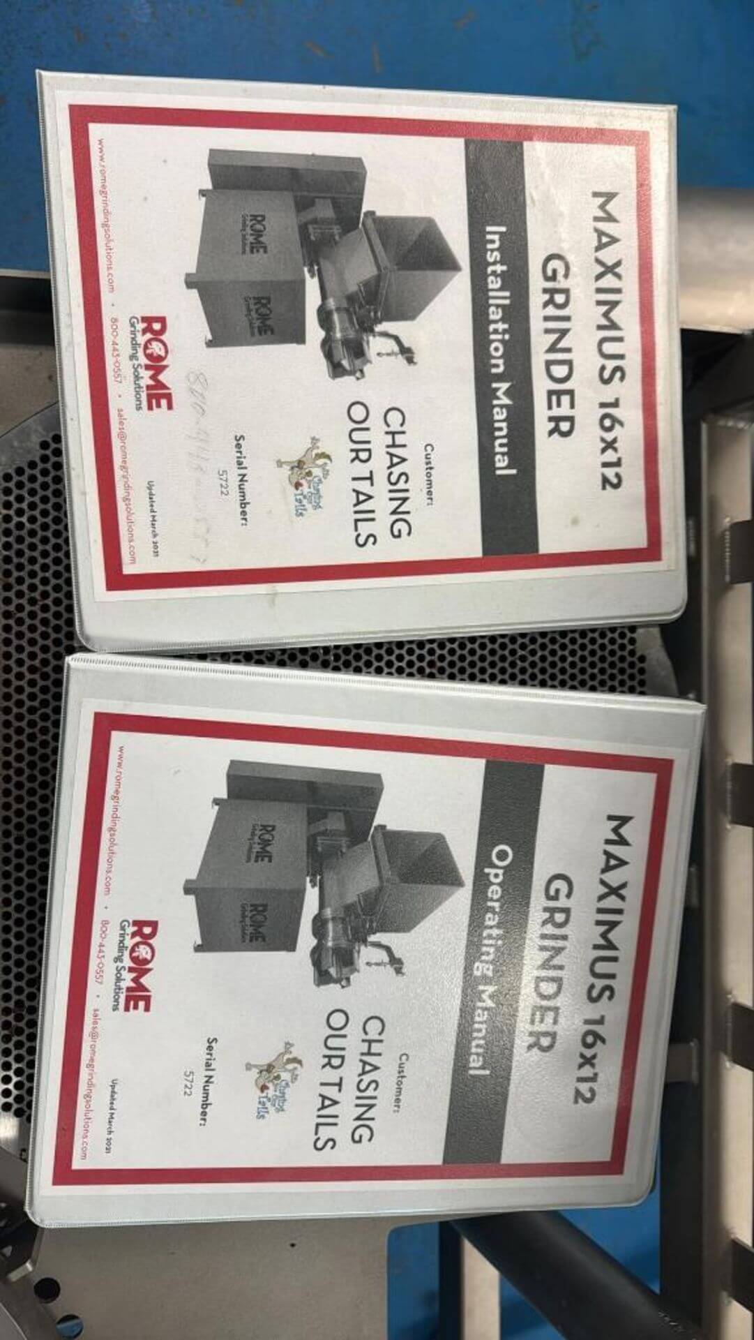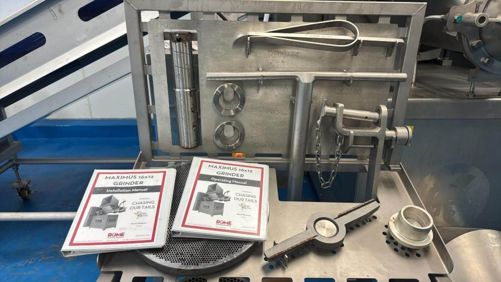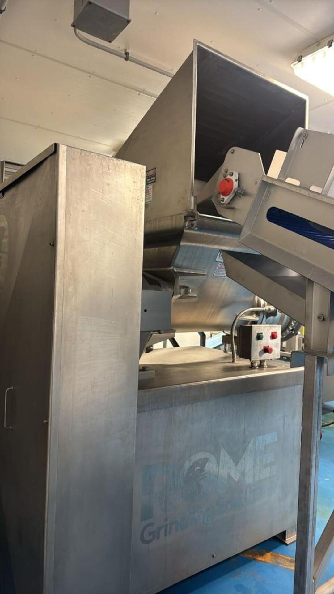 ROME MAXIMUS 16X12 FROZEN BLOCK GRINDER. Stainless steel hopper, tinned barrel, auger, and cross-bridged end ring. Stainless steel block guide and hopper extension, 150HP Motor, 16123-5HC Gearbox, 480V/3PH/60HZ. Includes Rome parts cart, auger puller, and soft start system.