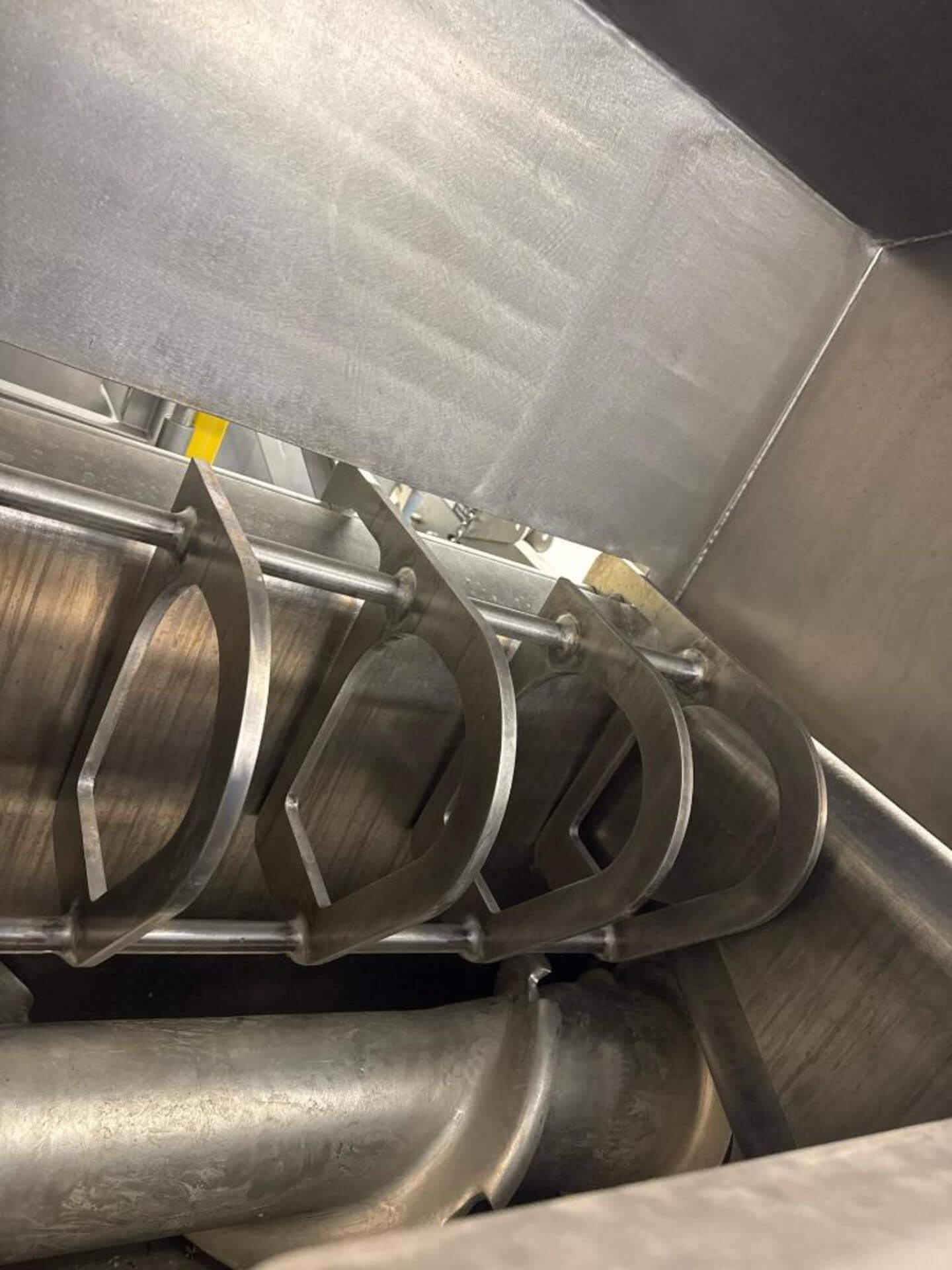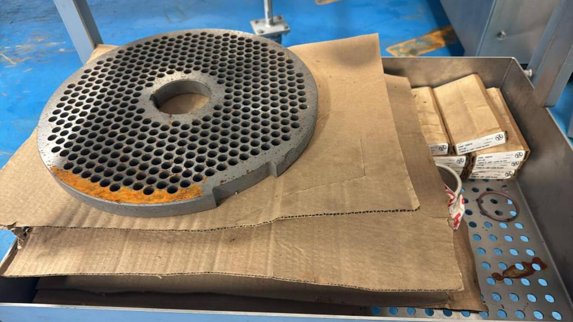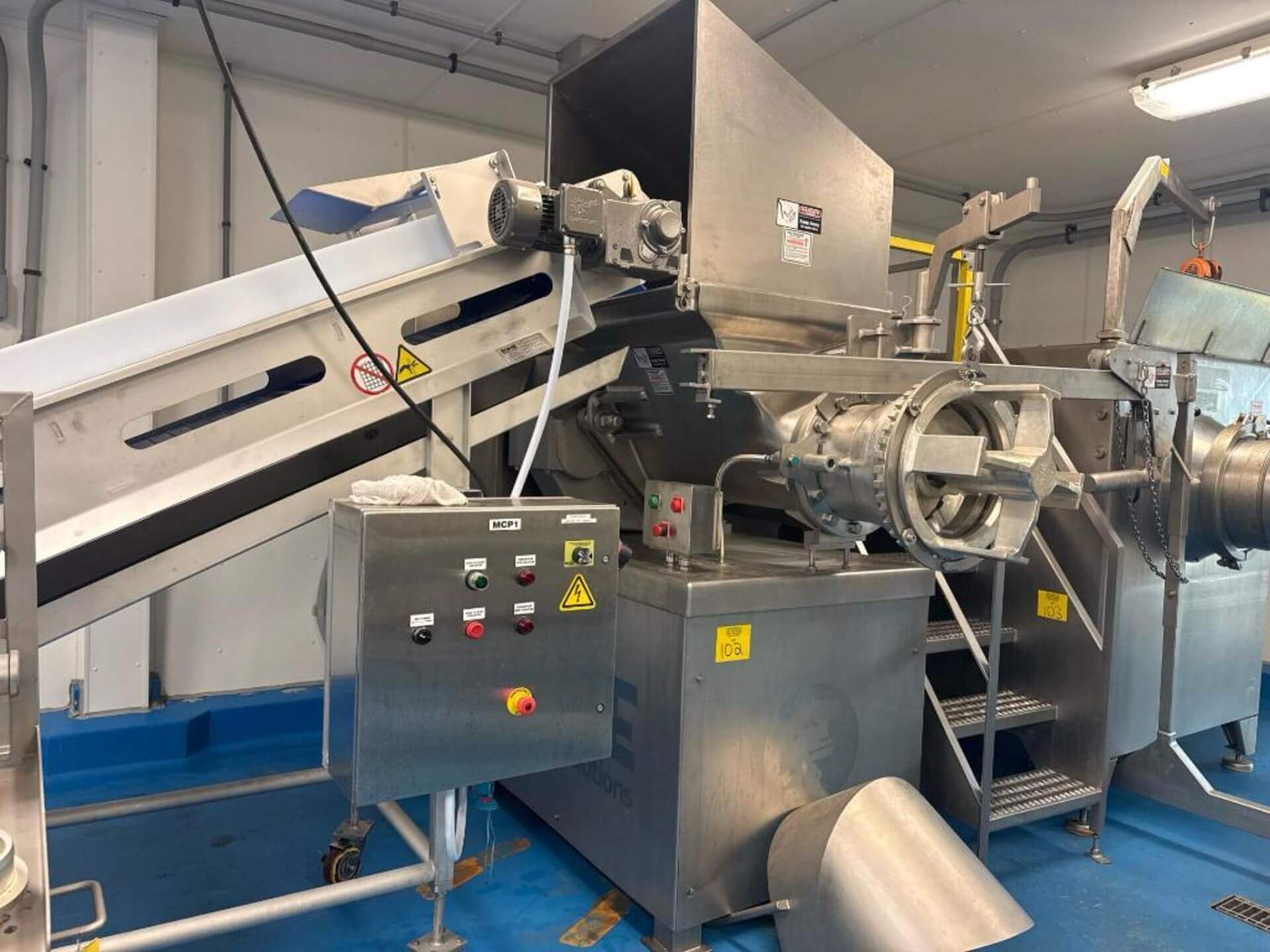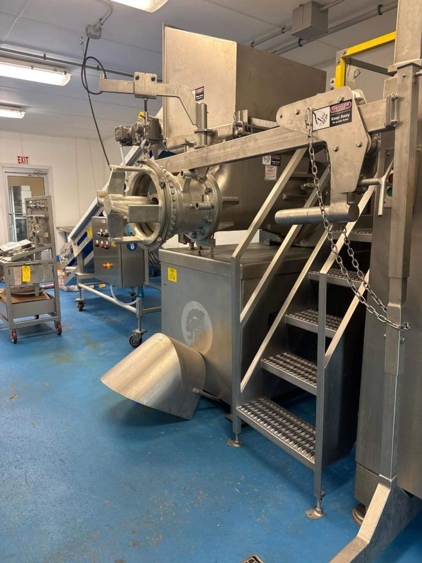 ROME MAXIMUS 16X12 FROZEN BLOCK GRINDER. Stainless steel hopper, tinned barrel, auger, and cross-bridged end ring. Stainless steel block guide and hopper extension, 150HP Motor, 16123-5HC Gearbox, 480V/3PH/60HZ. Includes Rome parts cart, auger puller, and soft start system.