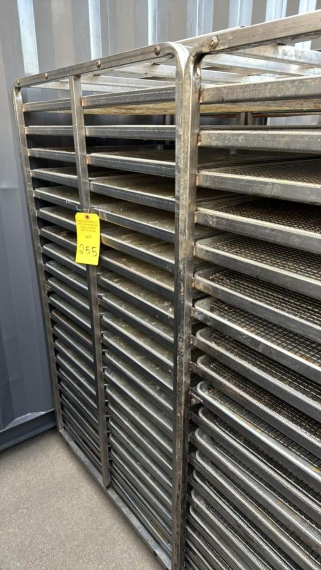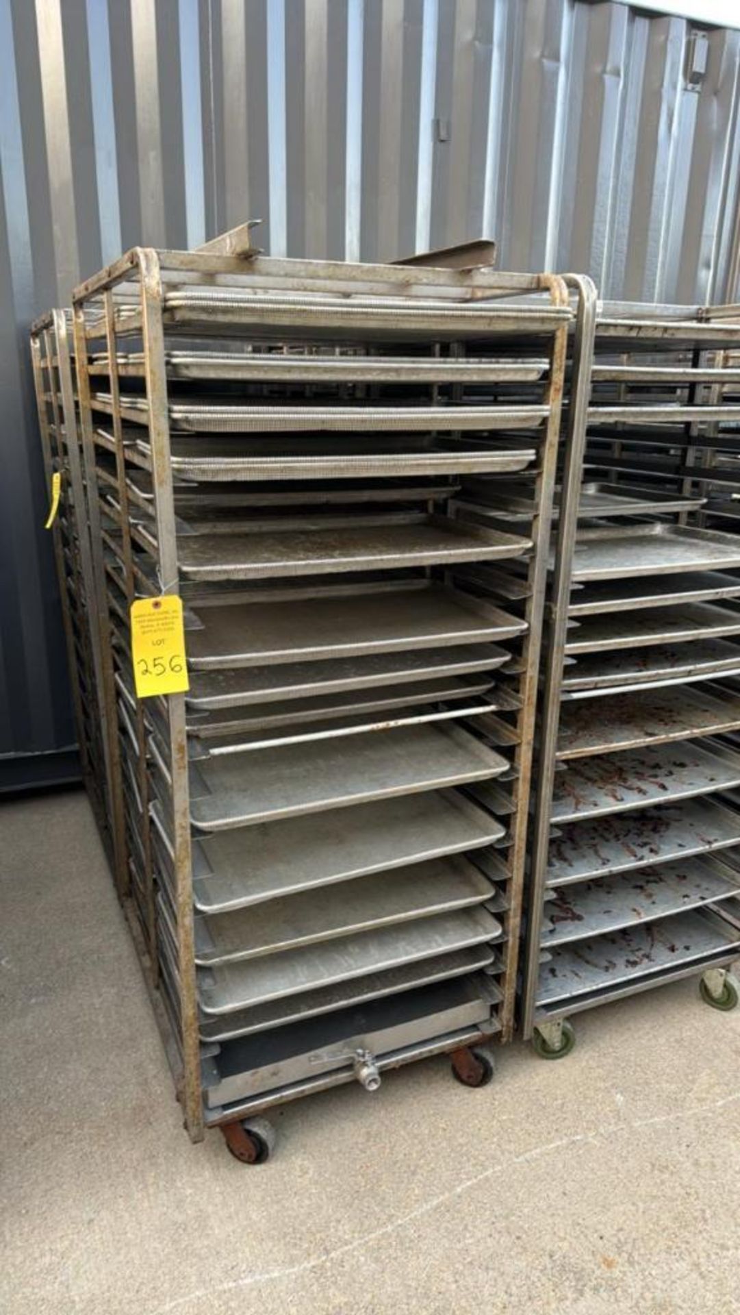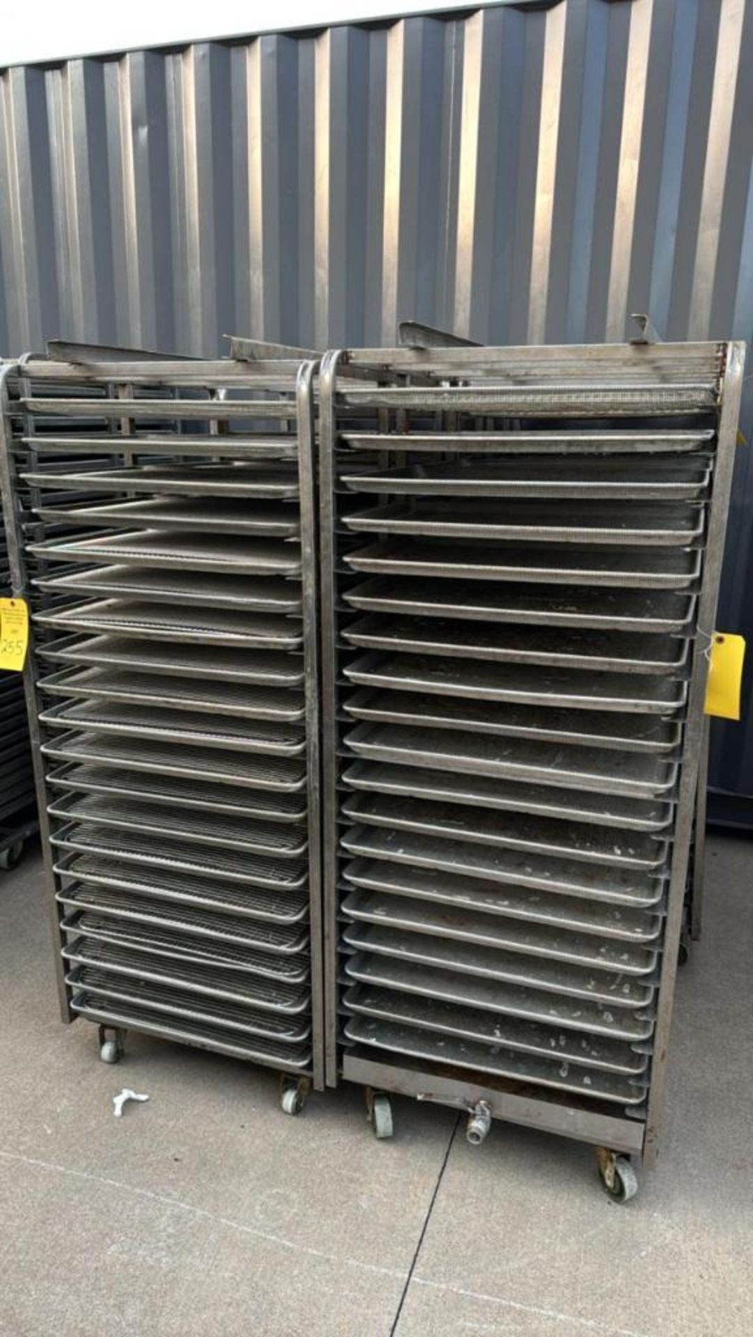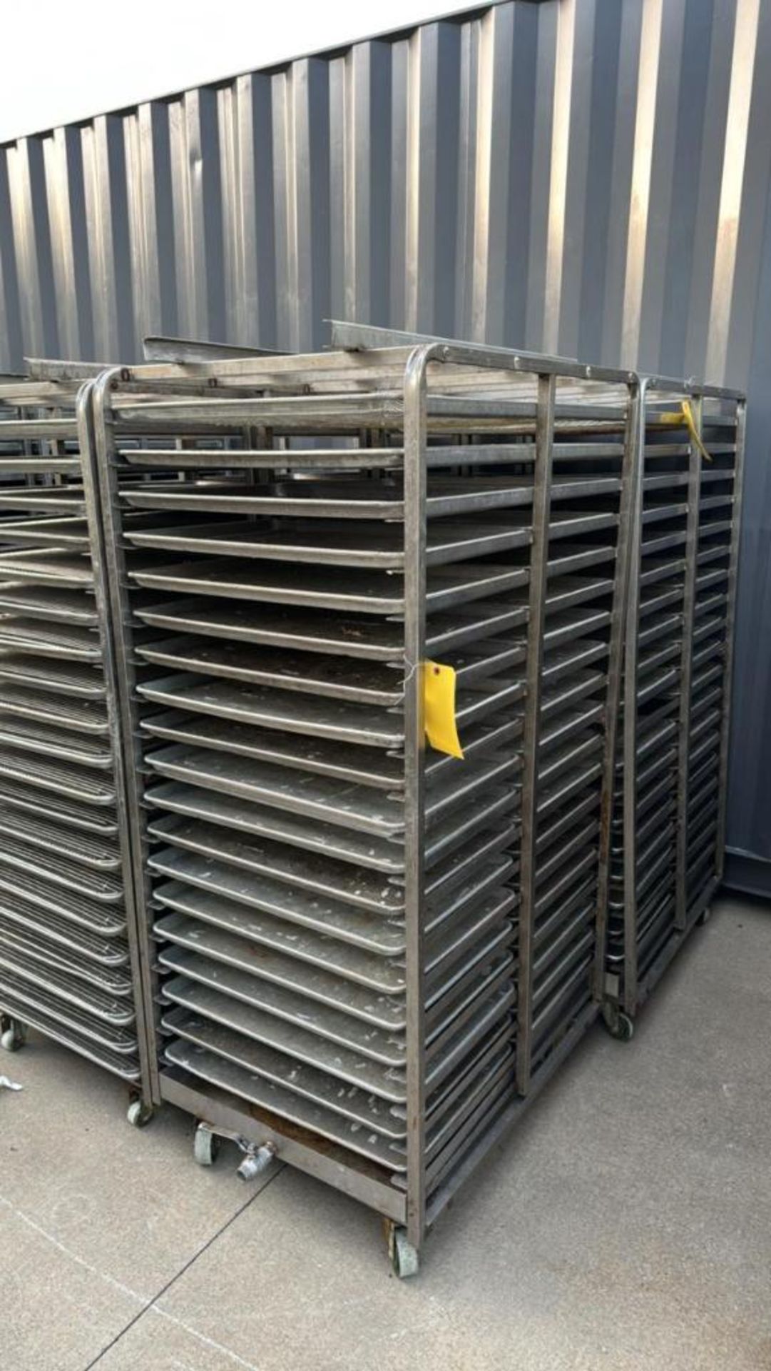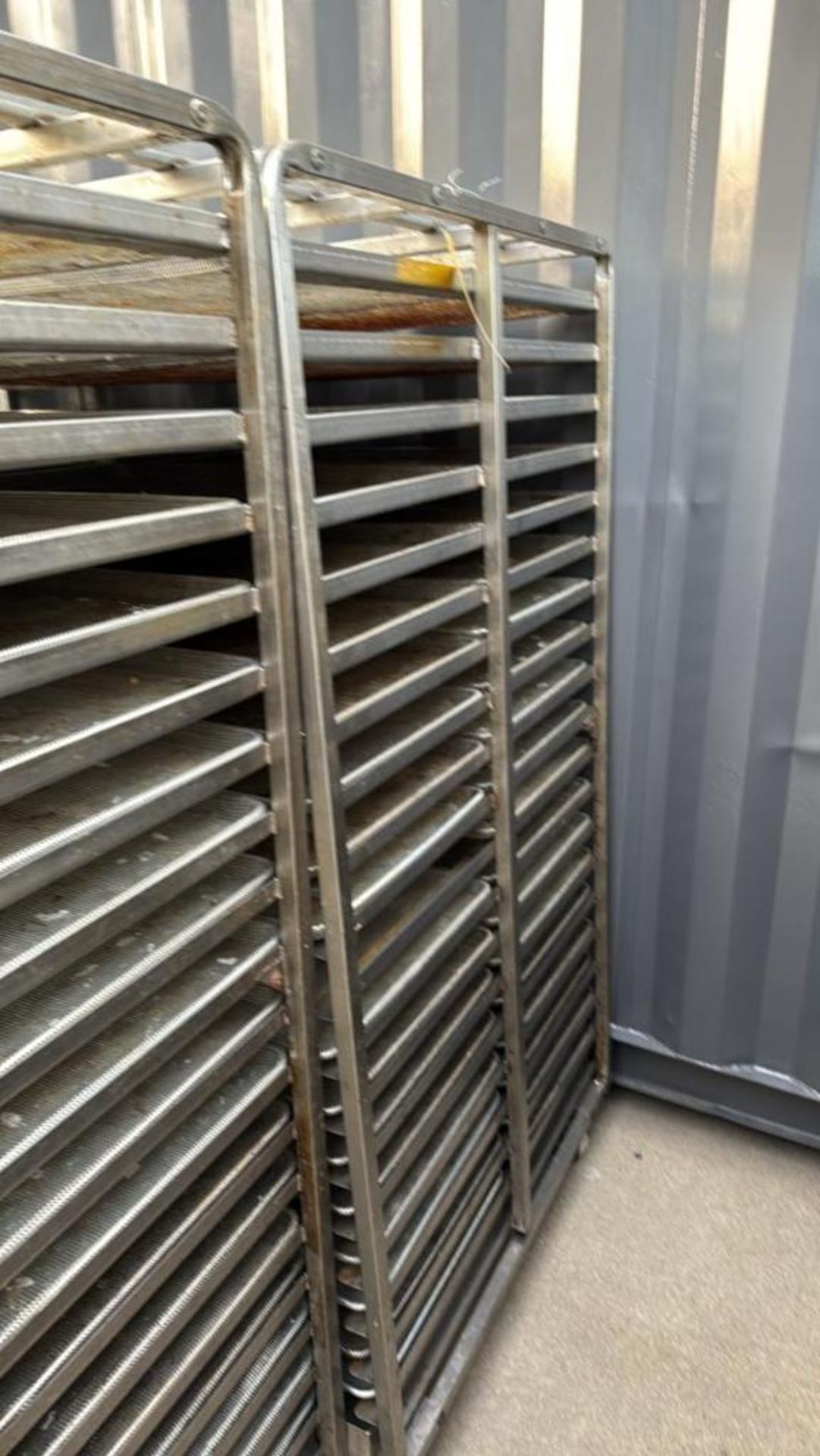 STAINLESS STEEL BAKERY RACKS. 36″ x 28.5″ x 69″ with 20 shelves spaced 3″ apart. Set up for (2) 26″ x 18″ sheet pans per shelf. Includes sheet pans.