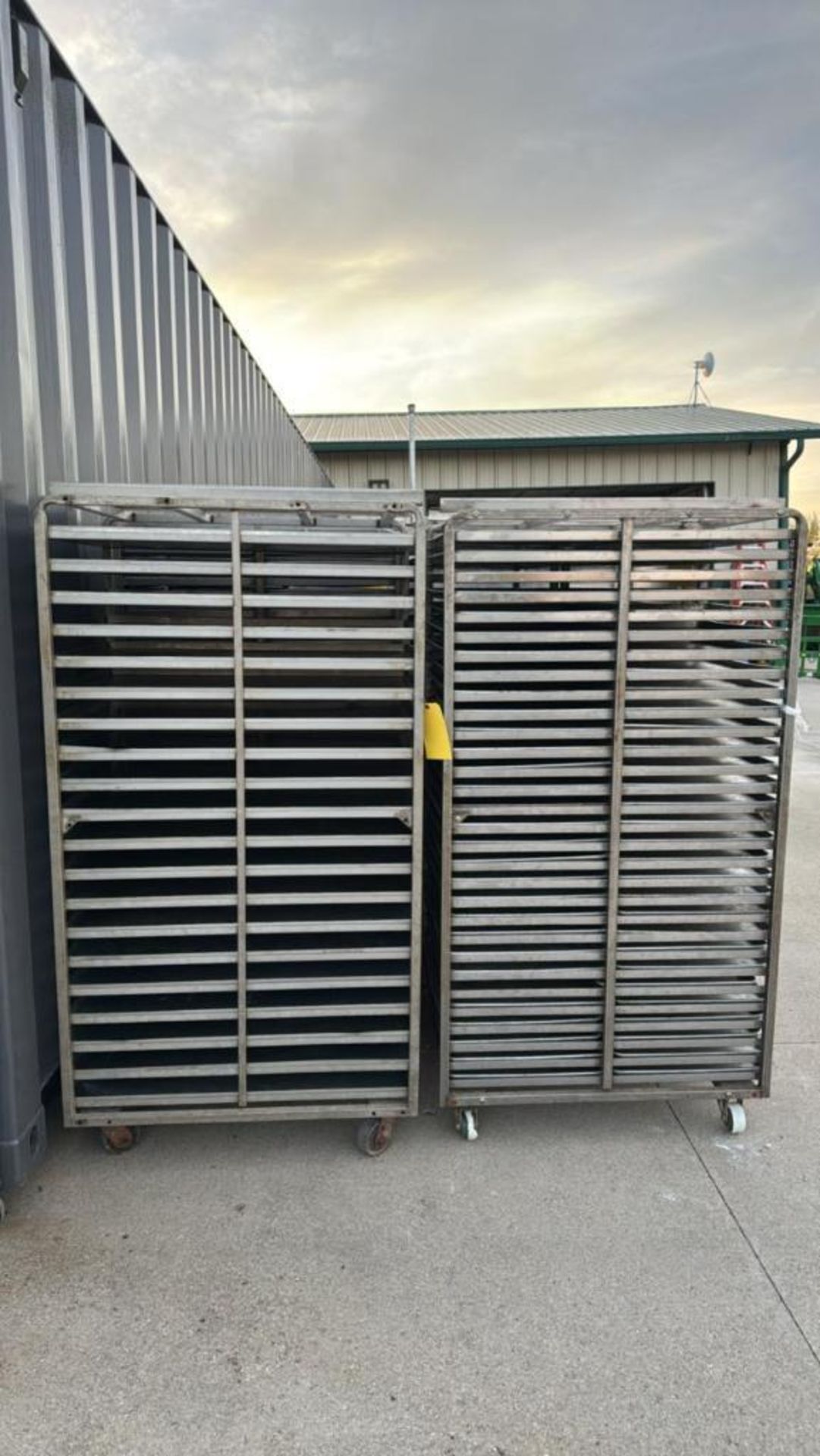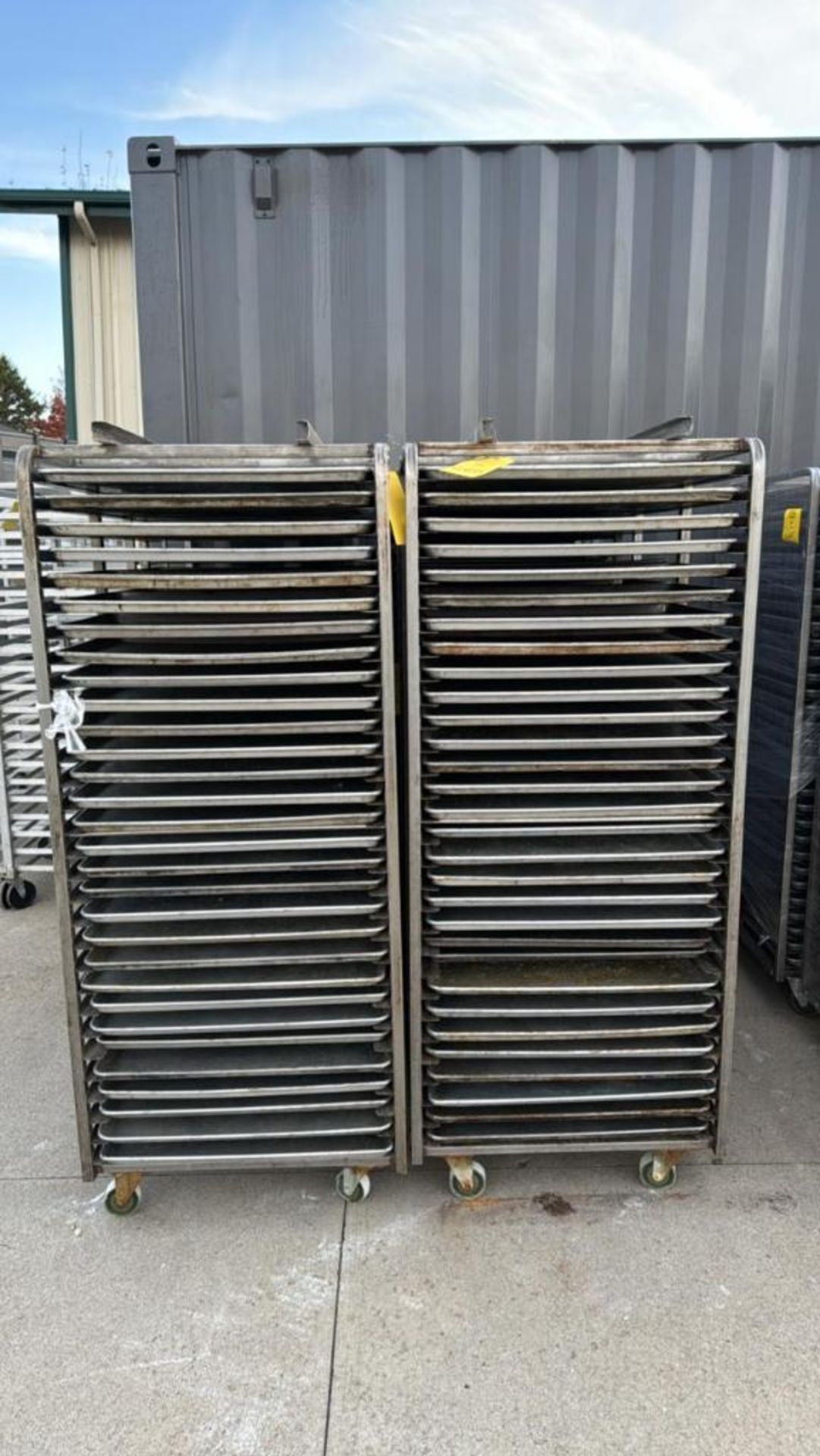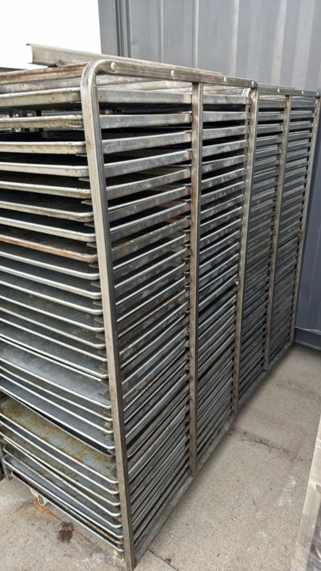 STAINLESS STEEL BAKERY RACKS. 36″ x 28.5″ x 69″ with 30 shelves spaced 2″ apart. Set up for (2) 26″ x 18″ sheet pans per shelf. Includes a mixture of standard and perforated sheet pans.