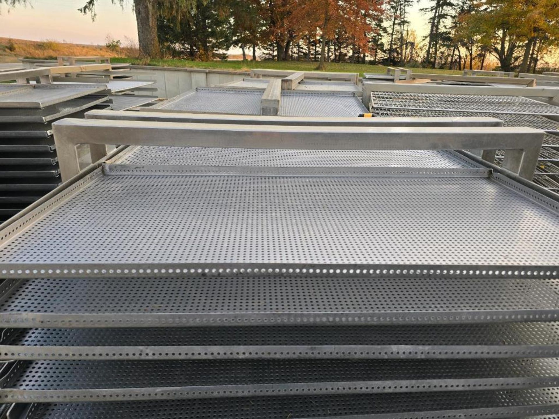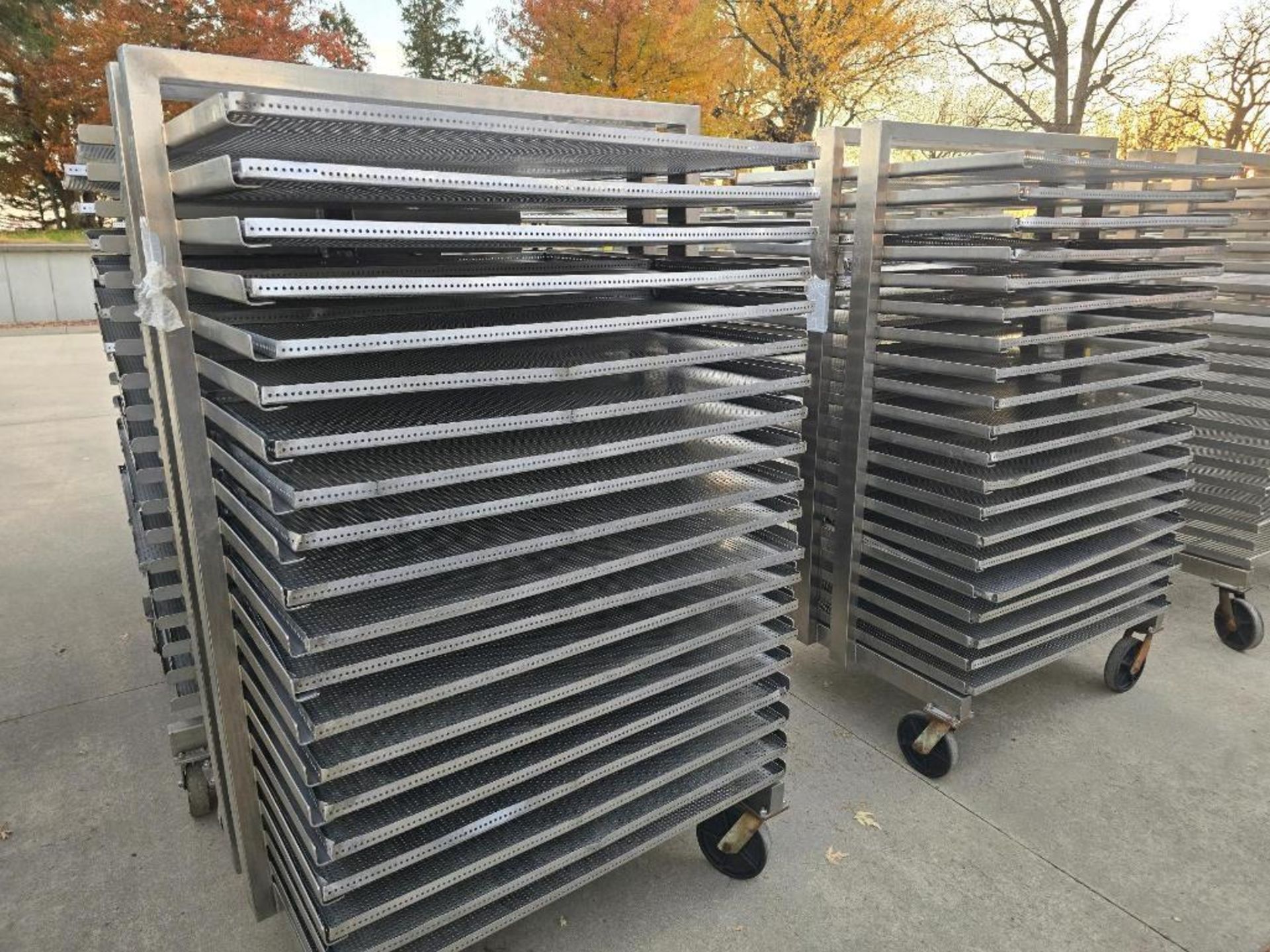 STAINLESS STEEL SMOKEHOUSE TRUCKS. OD: 42.25″ x 46.25″ x 75″ with 20 shelves spaced 3″ apart. Includes (80) perforated screens (42″ x 20.75″). Can accommodate standard 42″ x 42″ smokehouse screen.