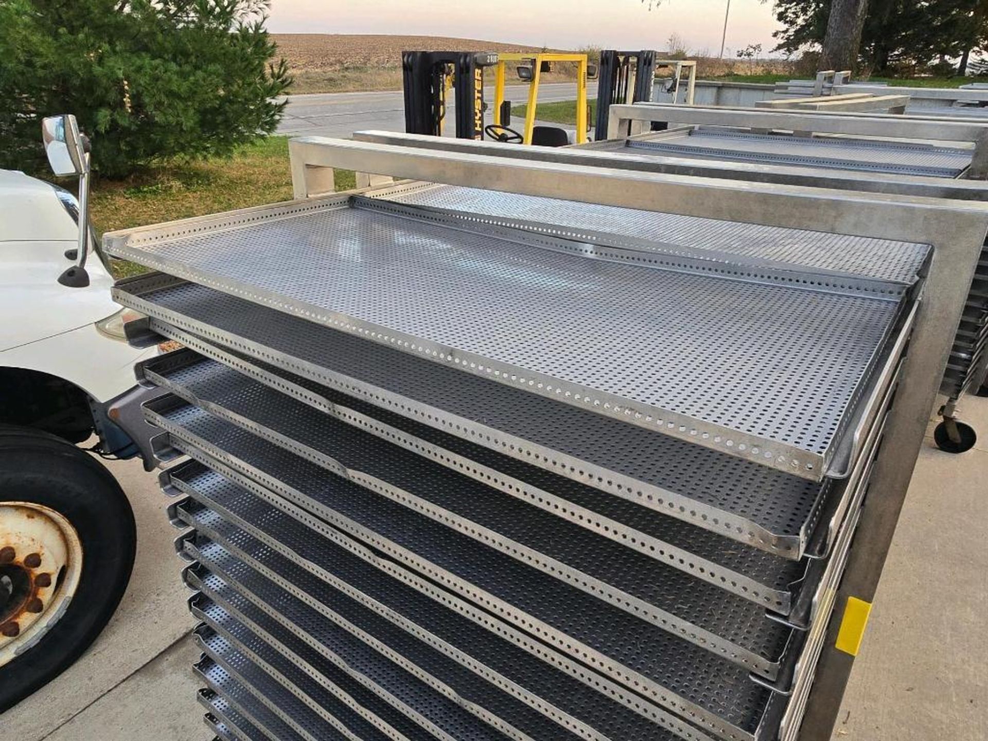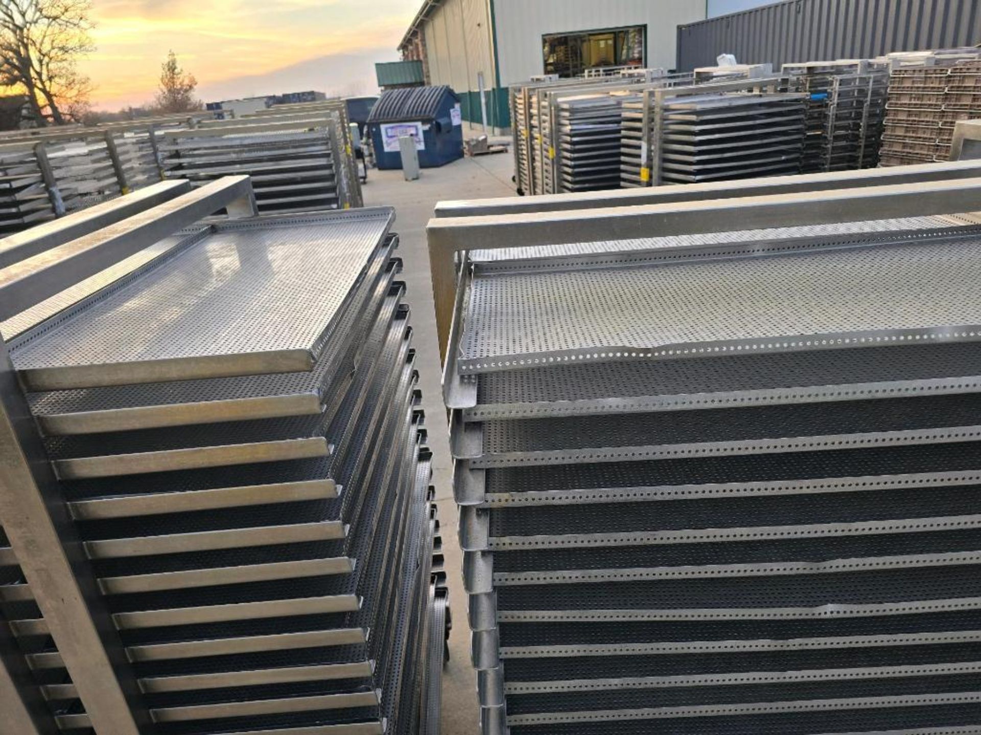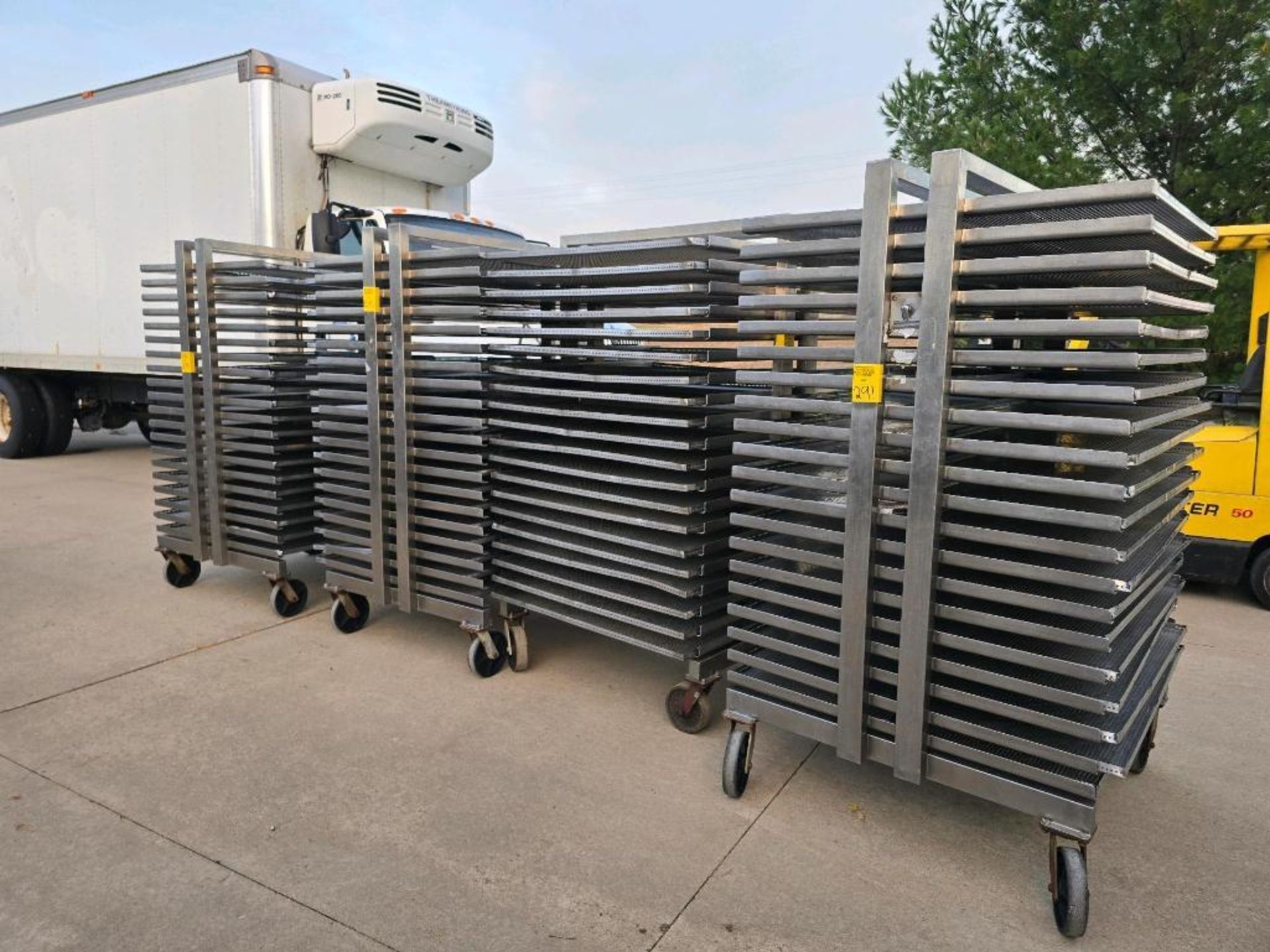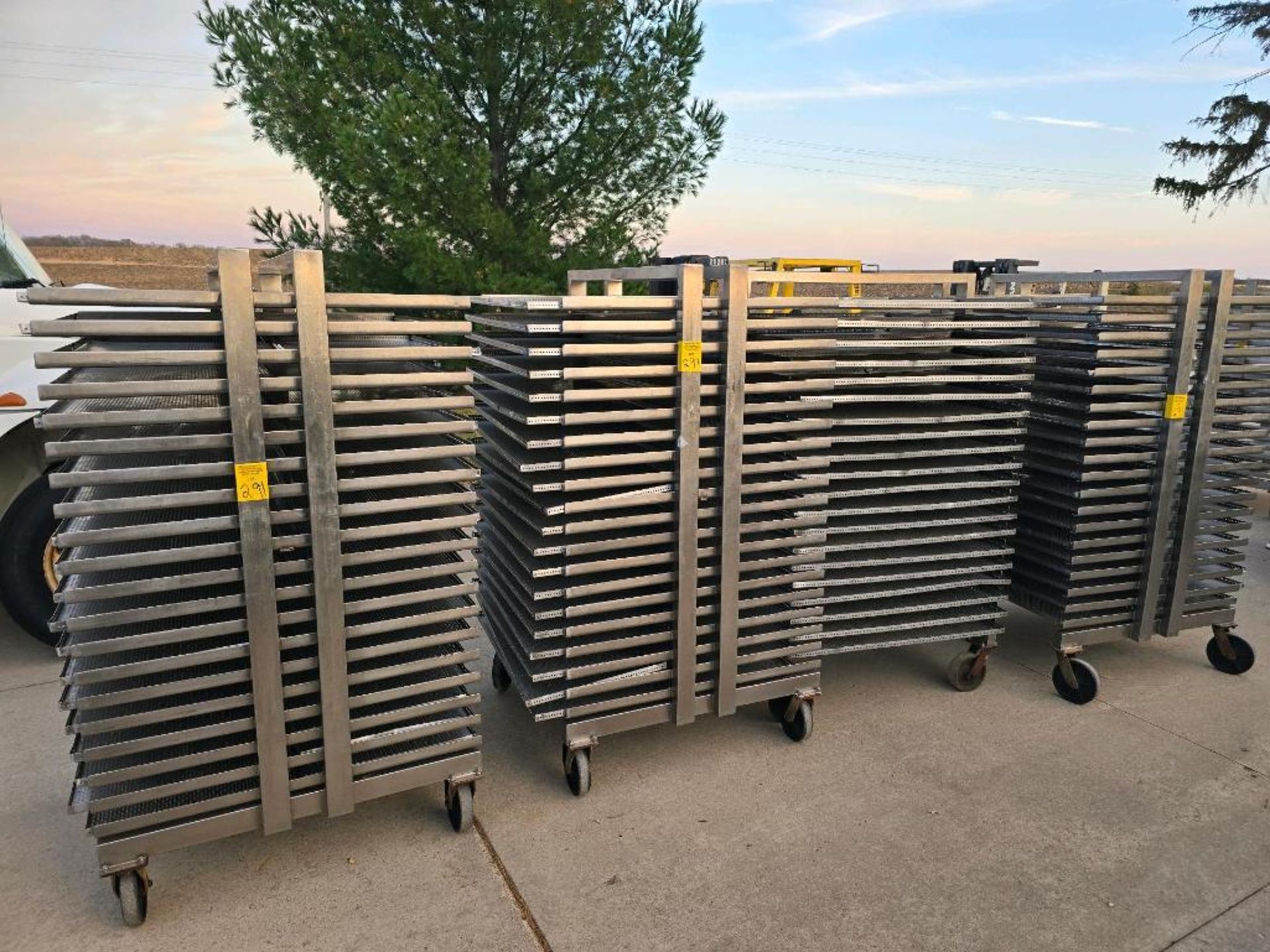 STAINLESS STEEL SMOKEHOUSE TRUCKS. OD: 42.25″ x 46.25″ x 75″ with 20 shelves spaced 3″ apart. Includes (160) perforated screens (42″ x 20.75″). Can accommodate standard 42″ x 42″ smokehouse screen.