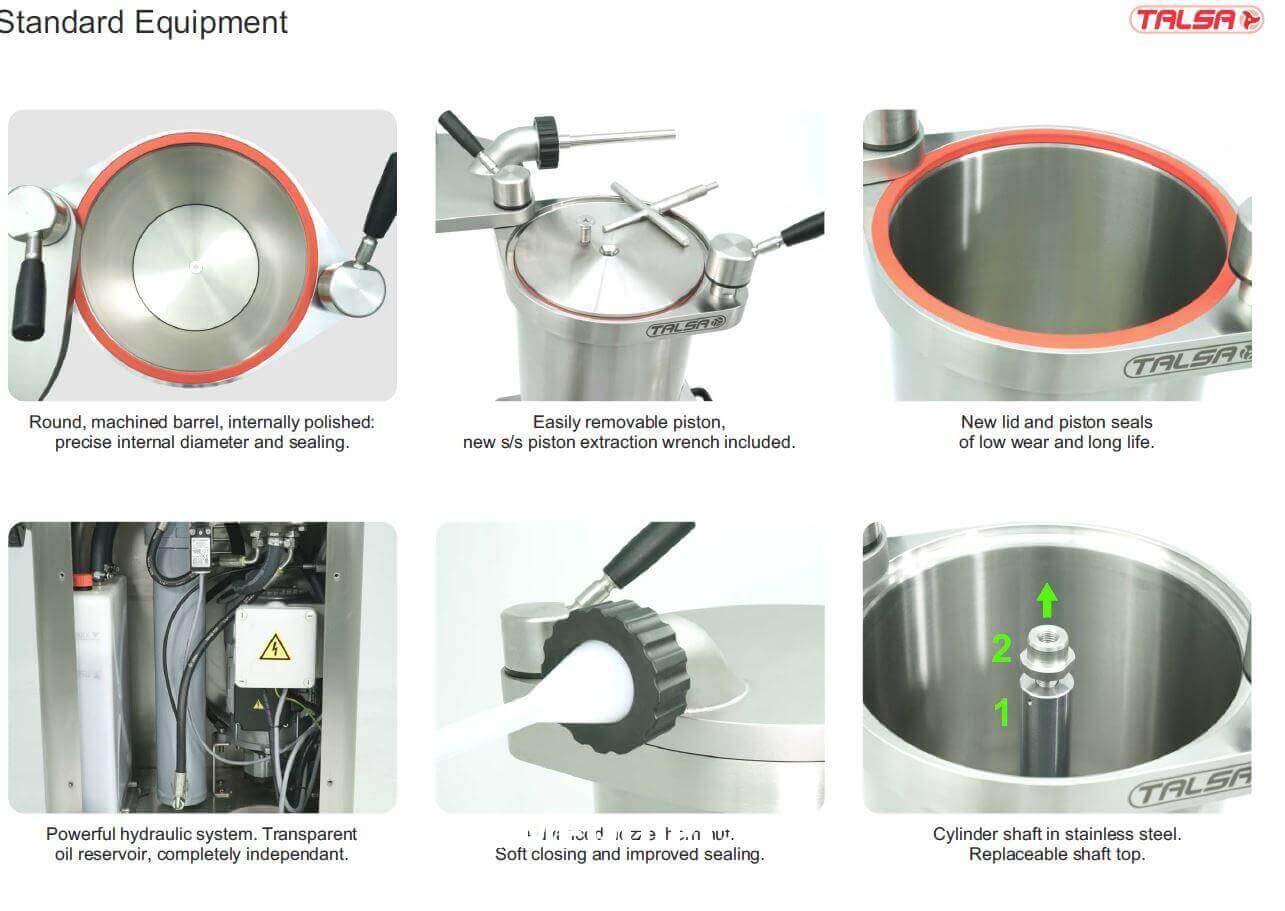 Talsa Piston Stuffer, 100# hopper capacity, built in Hydraulic pump, variable fill pressure, two Stuffing horns, 2.5 HP motor, 208V/3PH/60HZ, automatic start/stop by knee lever and pressure gauge. OPTIONS: Single phase $ 350.00; Swivel casters with brakes $298.00; Additional Stuffing Horns $69.00 each.