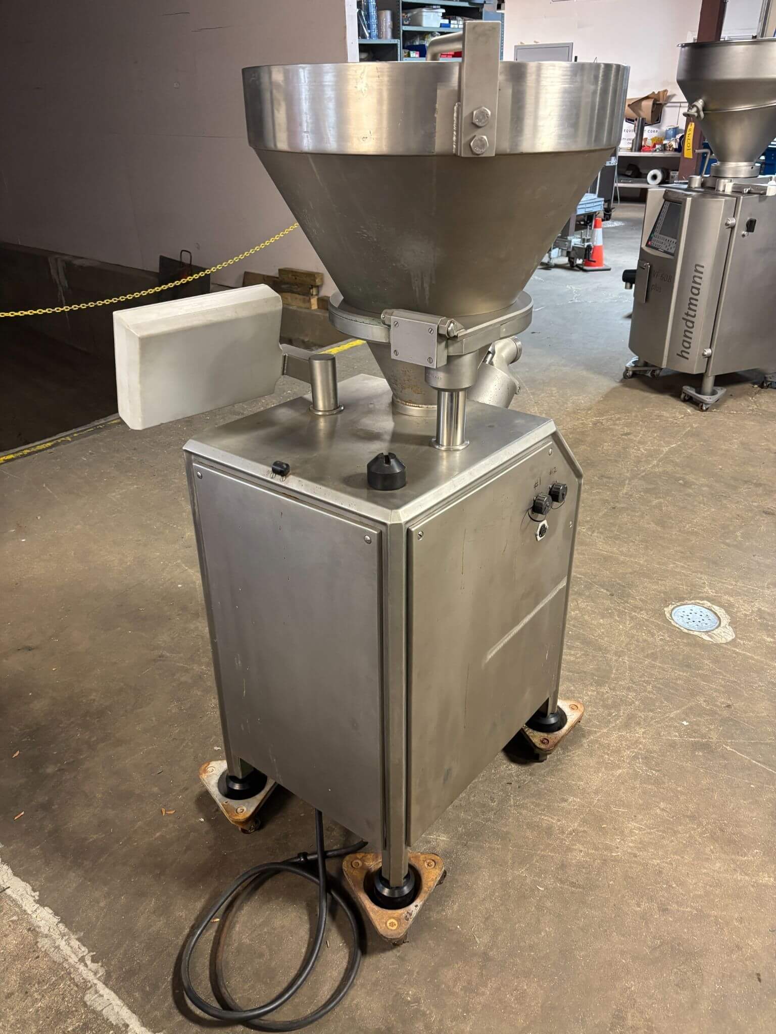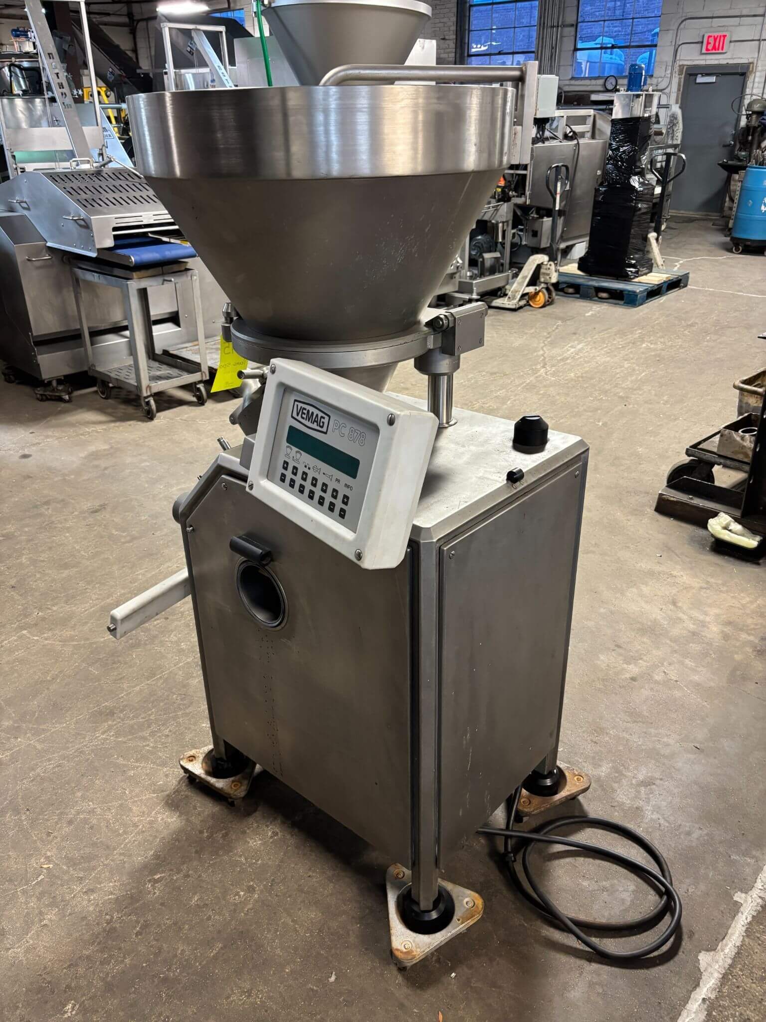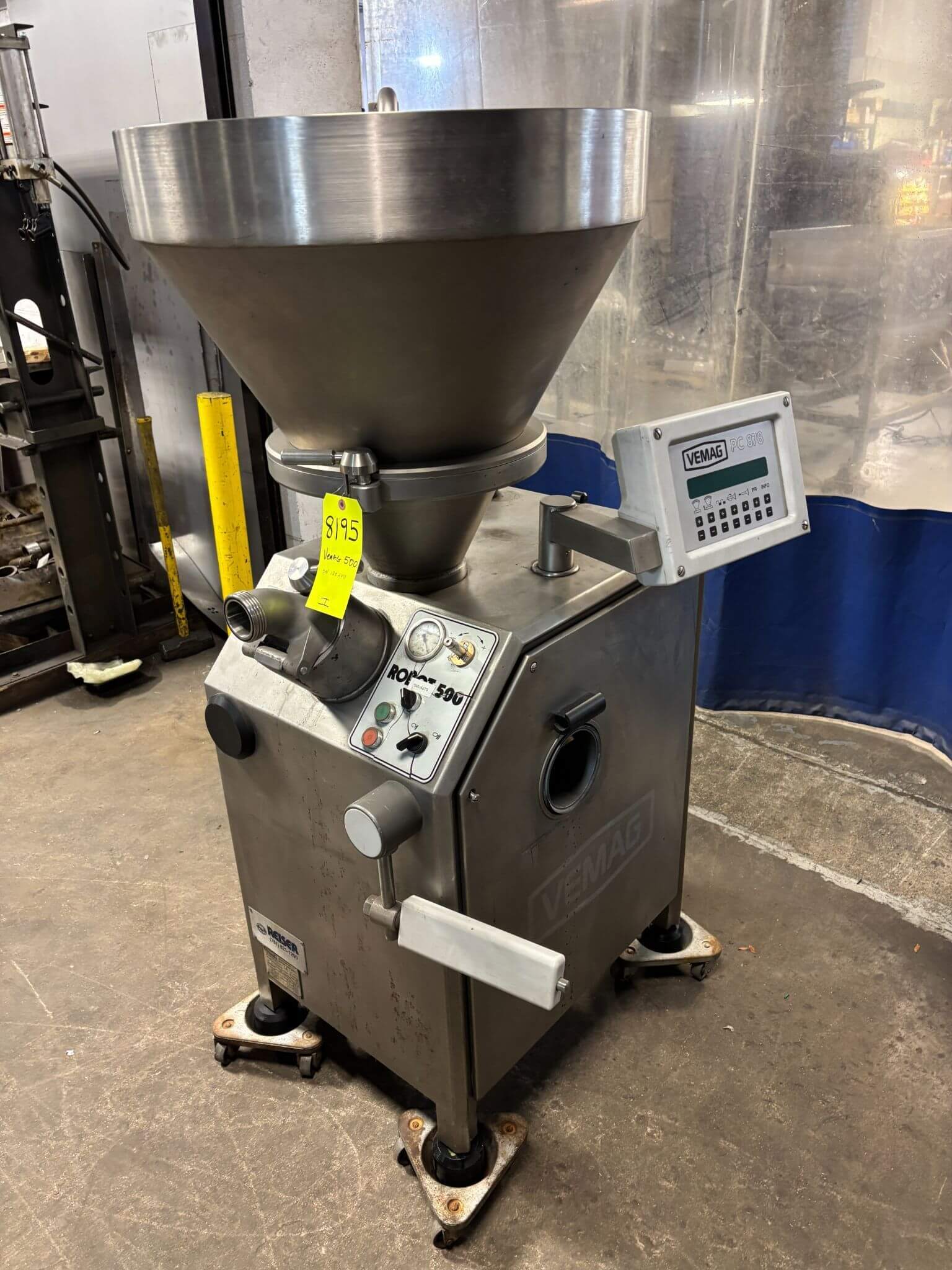 Vemag 500 Vacuum Stuffer. All stainless steel construction, PC 878 Digital control panel, Fill rate up to 2,700 kg/h, portion speed up to 650 portions/minute, 90-liter hopper, 48mm double screw, self-contained Busch vacuum pump, standard horn holder, mounted on casters, 220/440V/3PH/60HZ.