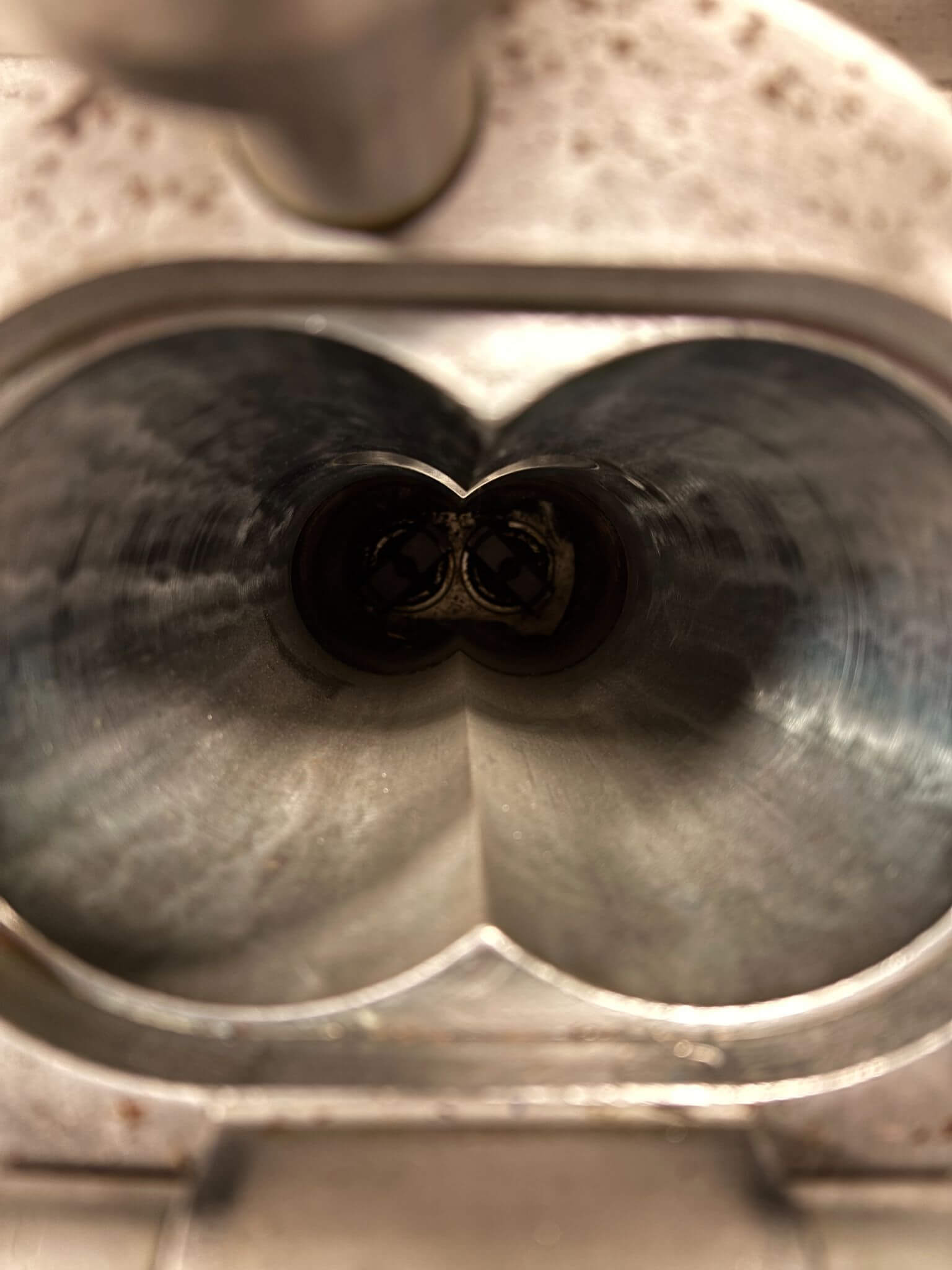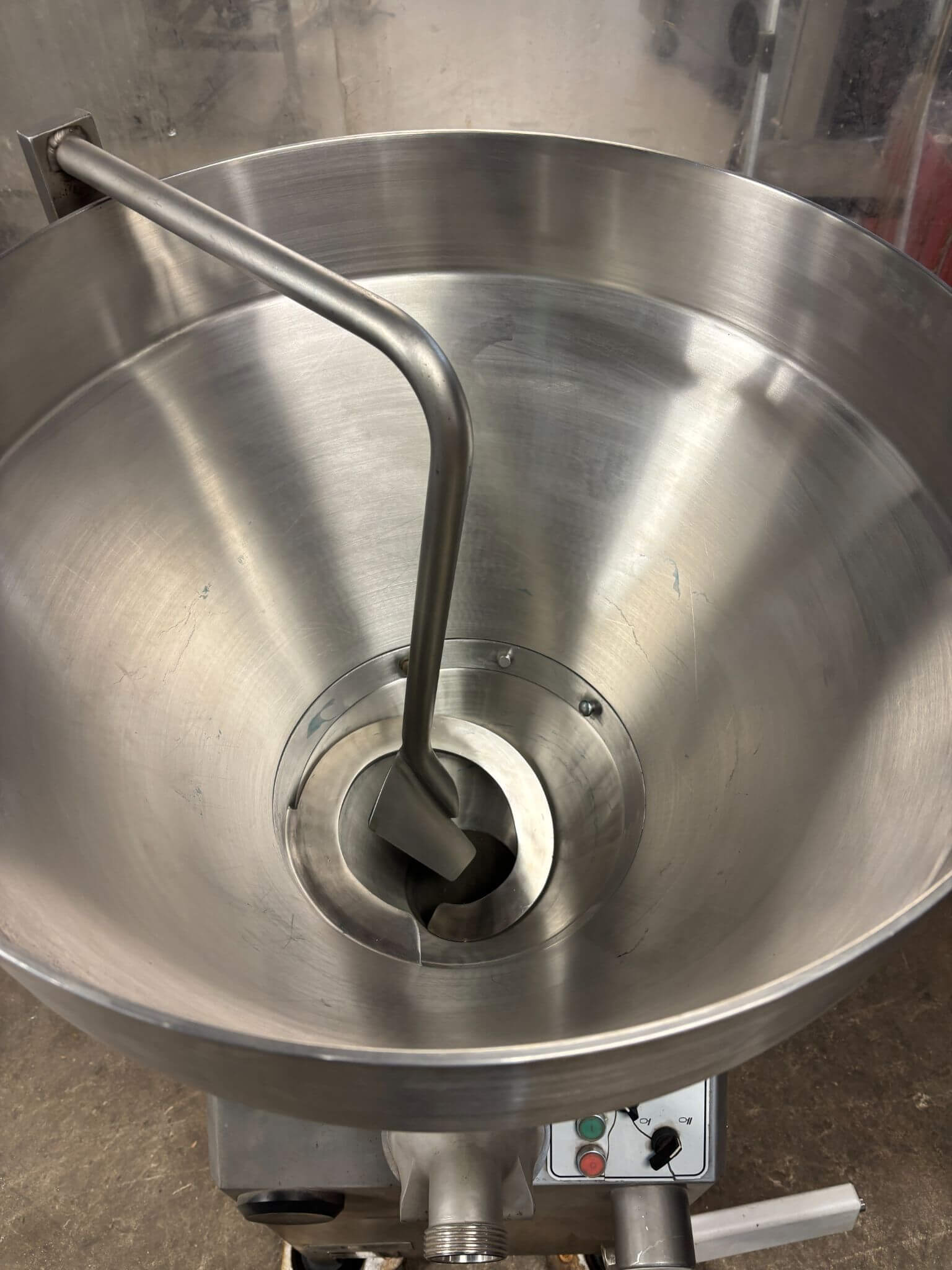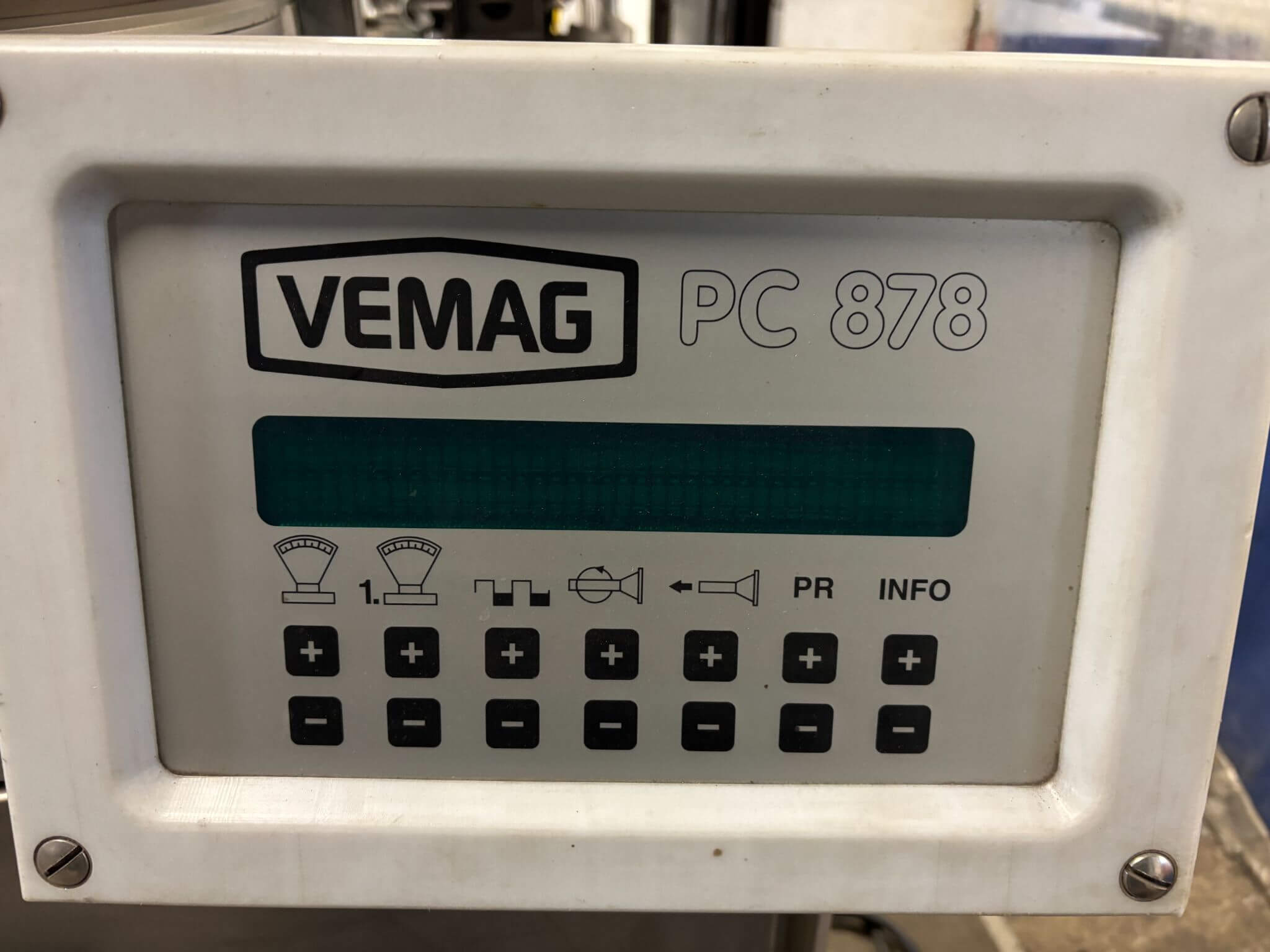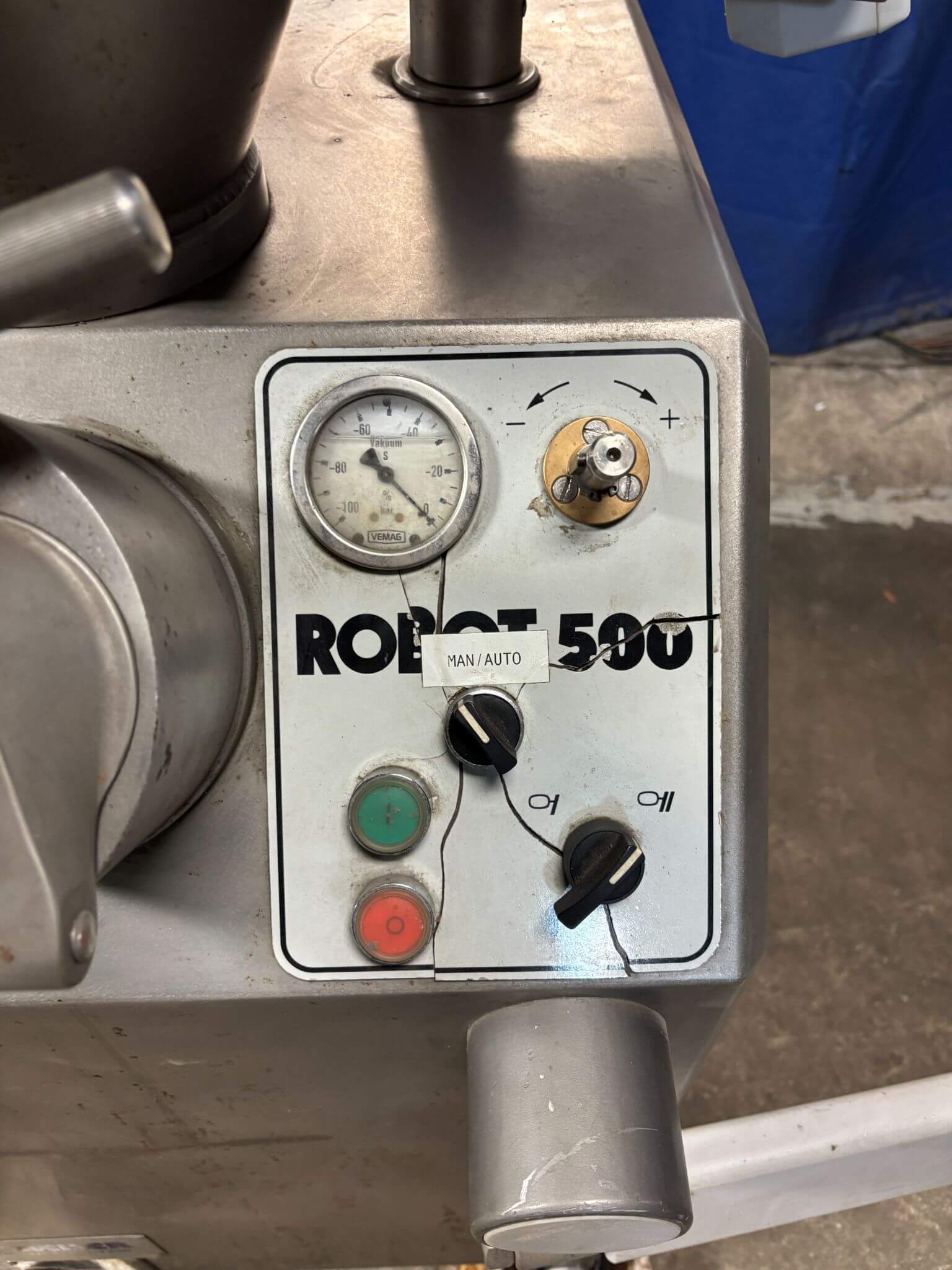 Vemag 500 Vacuum Stuffer. All stainless steel construction, PC 878 Digital control panel, Fill rate up to 2,700 kg/h, portion speed up to 650 portions/minute, 90-liter hopper, 48mm double screw, self-contained Busch vacuum pump, standard horn holder, mounted on casters, 220/440V/3PH/60HZ.