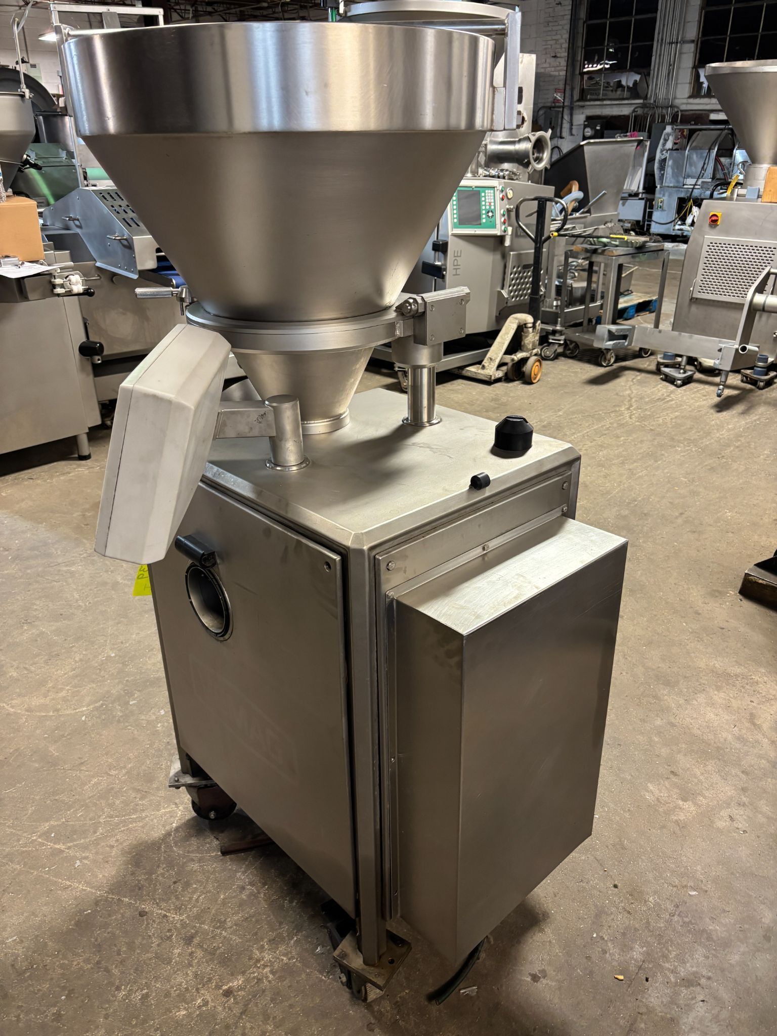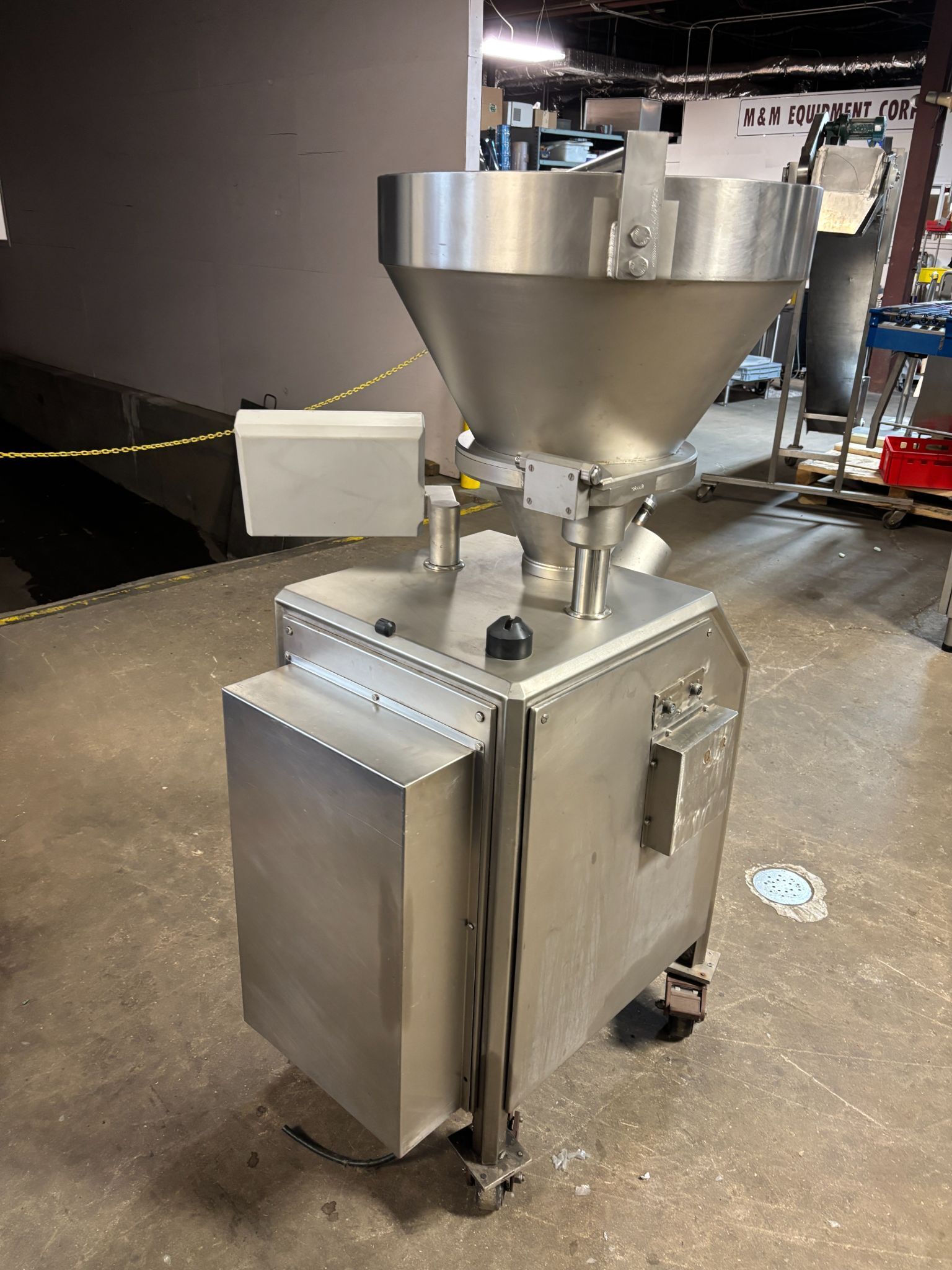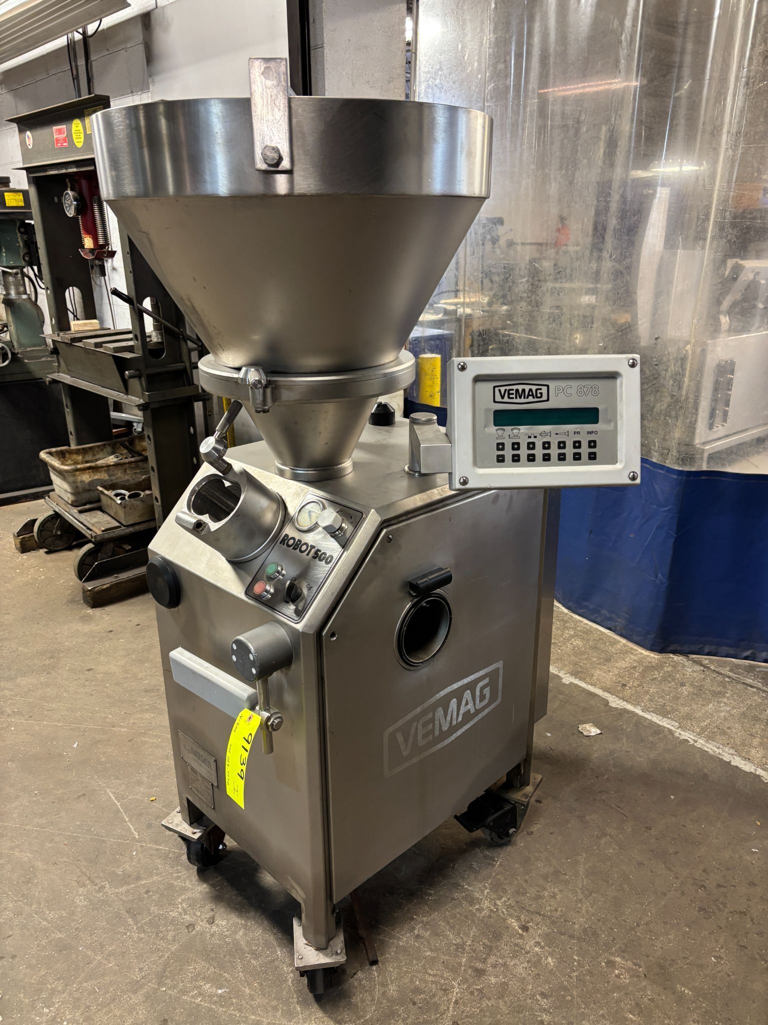 Refurbished Vemag 500 Vacuum Stuffer. Stainless steel construction, PC 878 Digital control panel, Fill rate up to 2,700 kg/h, portion speed up to 650 portions/minute, 90-liter hopper, 48mm double screw, self-contained Busch vacuum pump, standard horn holder, mounted on casters, 220/440V/3PH/60HZ.