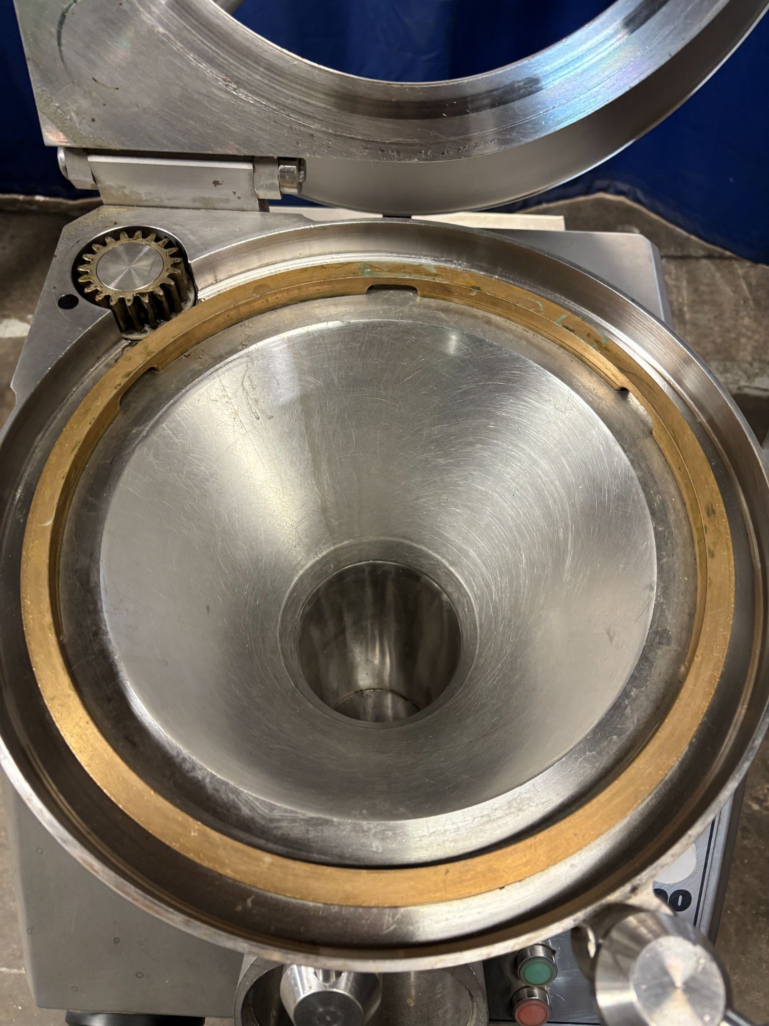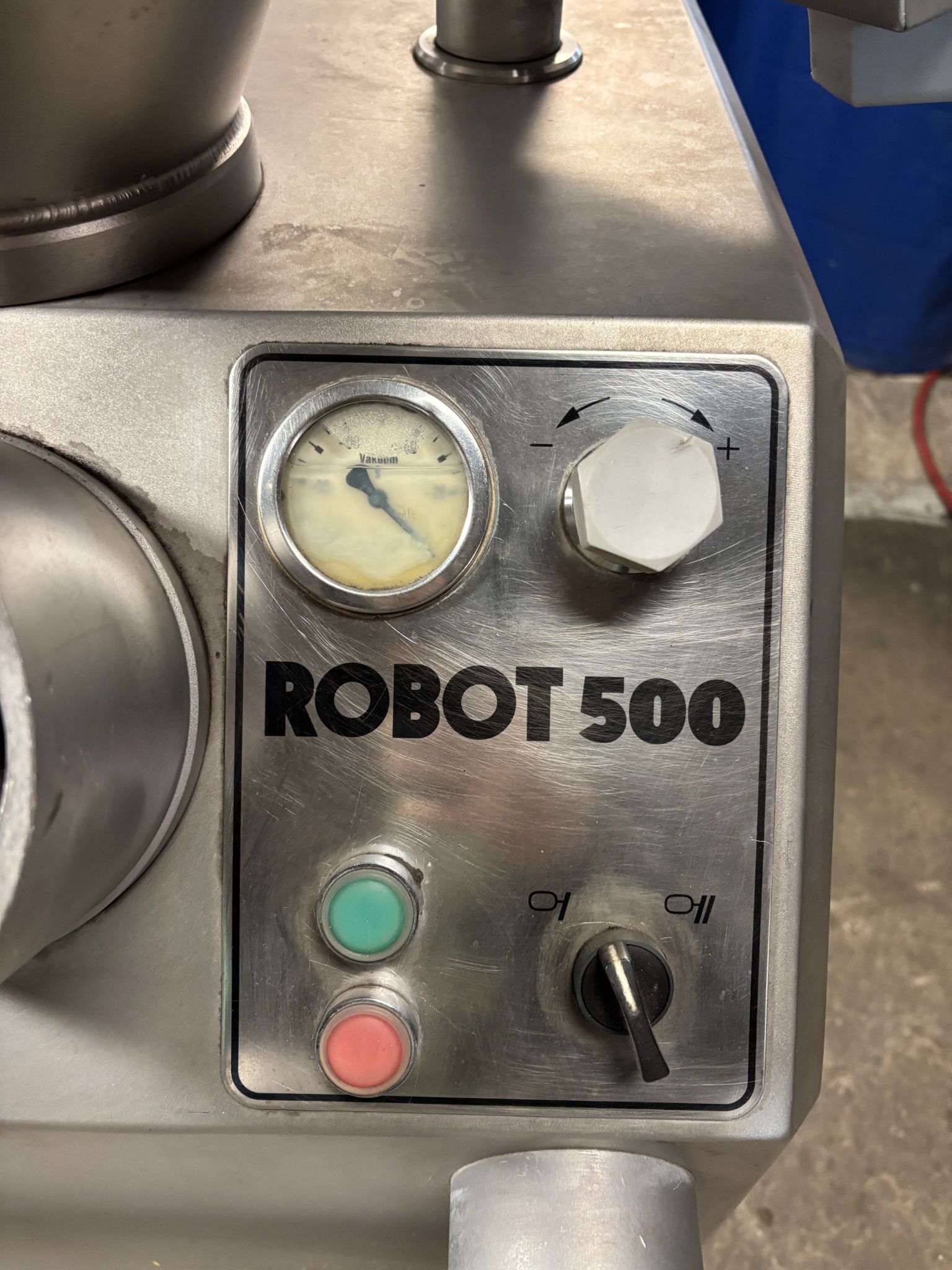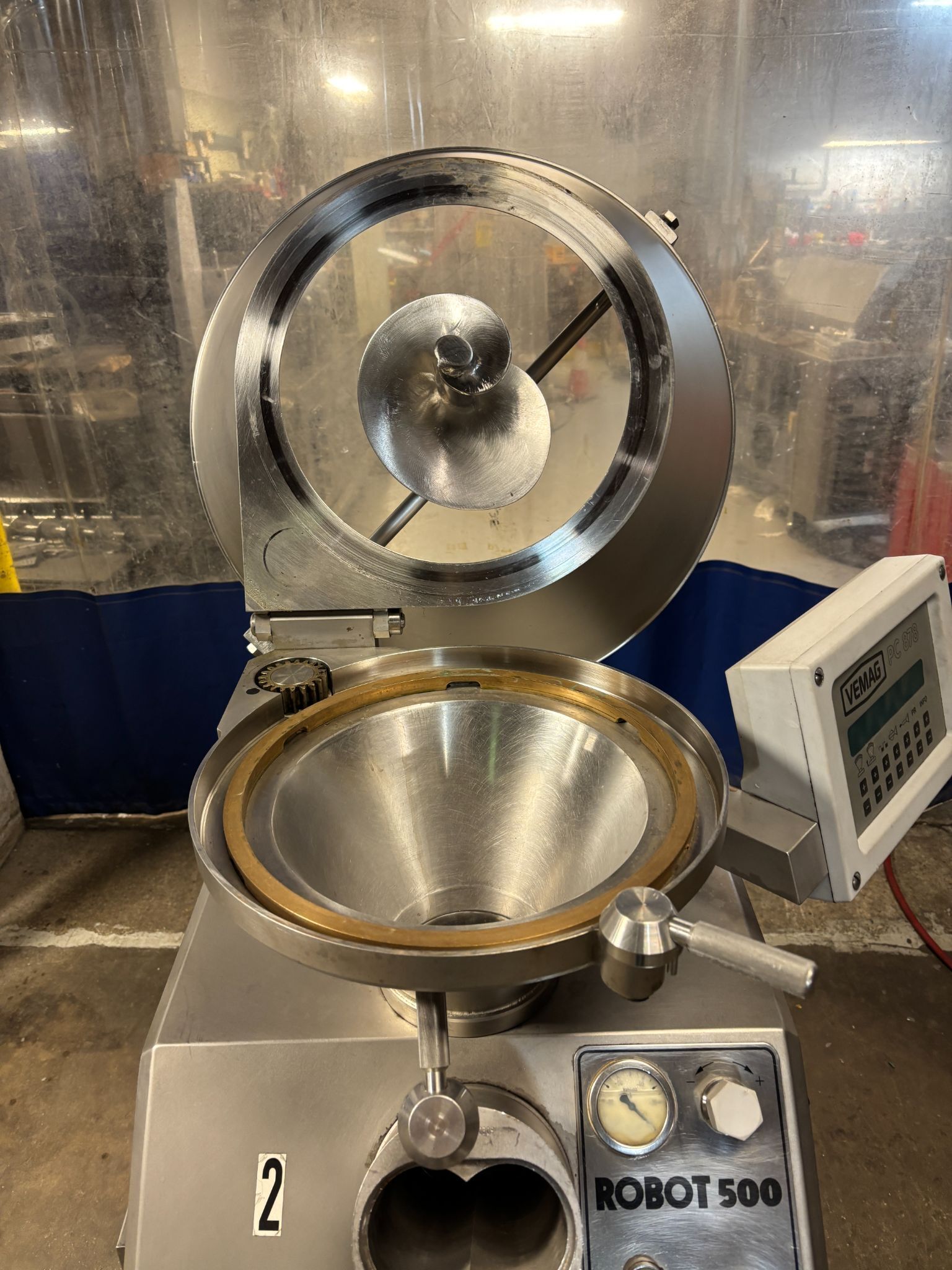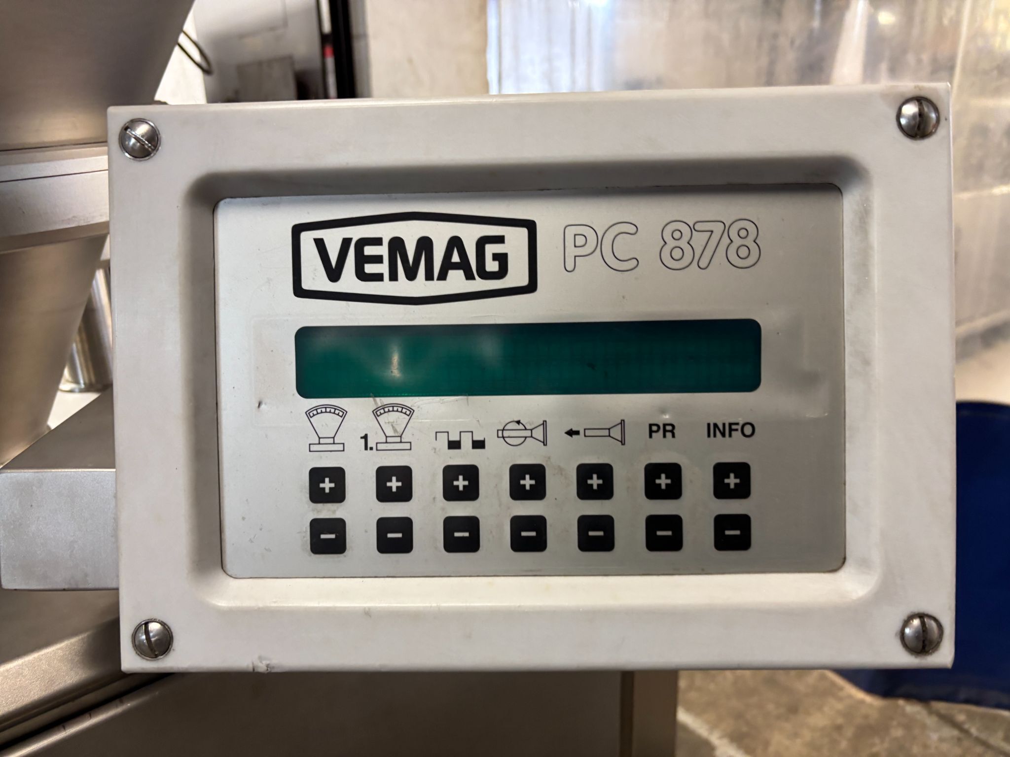 Refurbished Vemag 500 Vacuum Stuffer. Stainless steel construction, PC 878 Digital control panel, Fill rate up to 2,700 kg/h, portion speed up to 650 portions/minute, 90-liter hopper, 48mm double screw, self-contained Busch vacuum pump, standard horn holder, mounted on casters, 220/440V/3PH/60HZ.