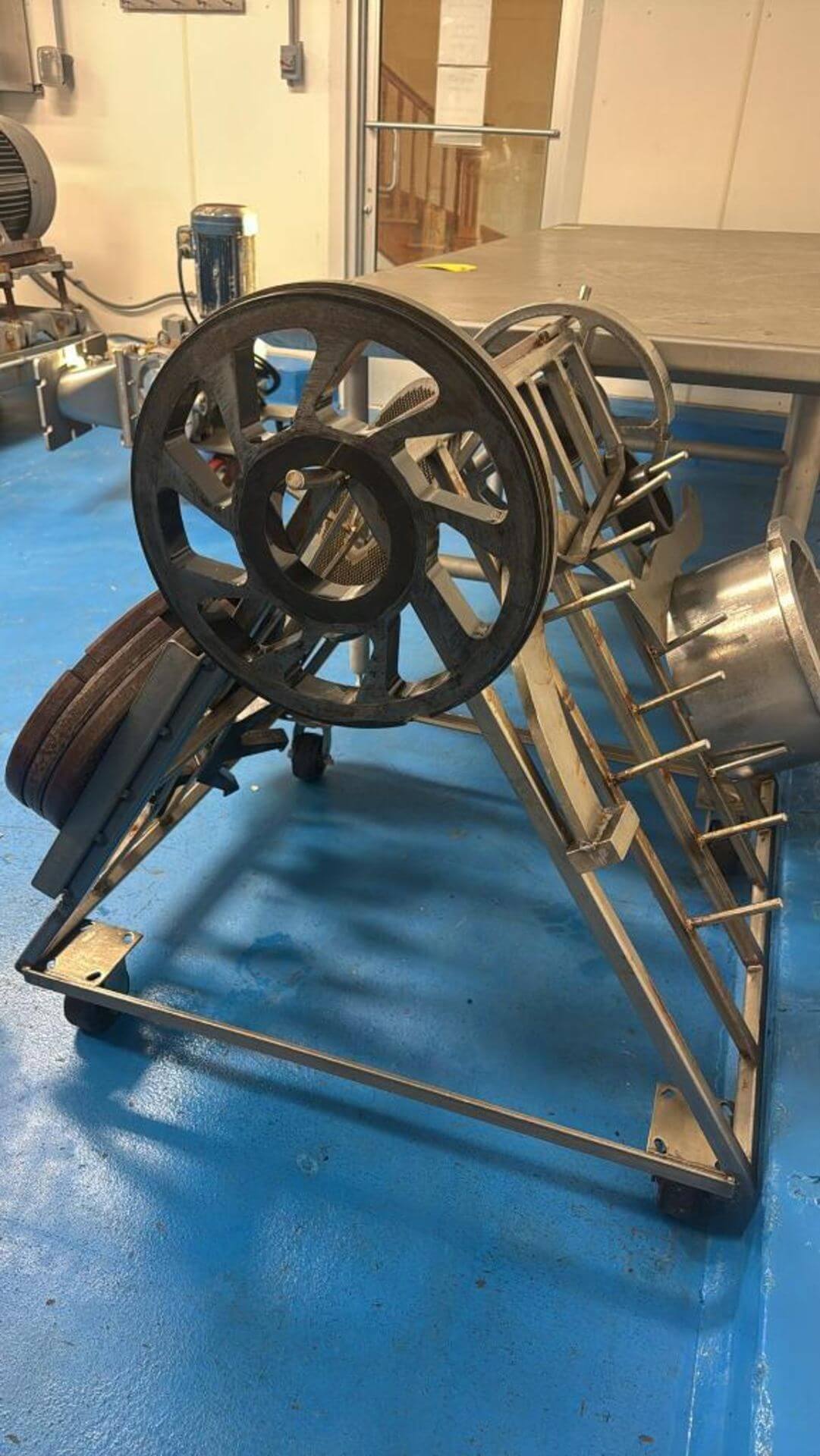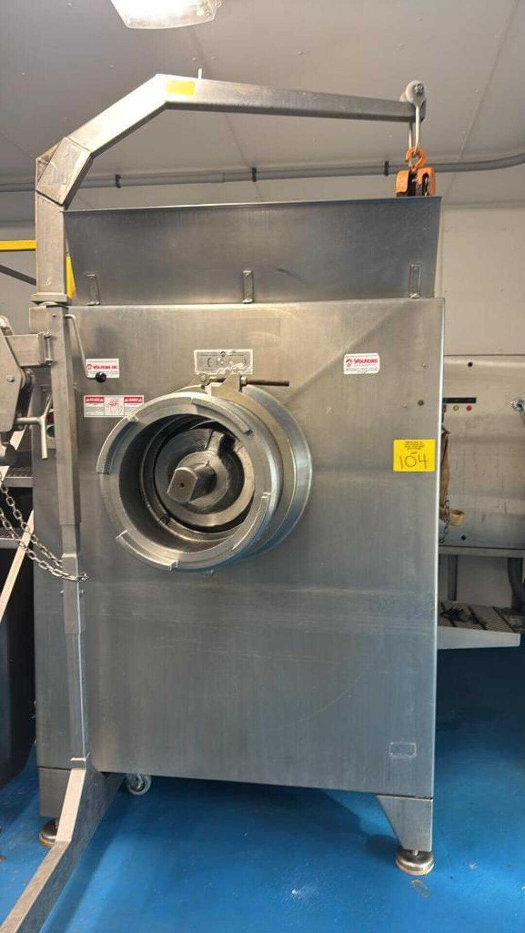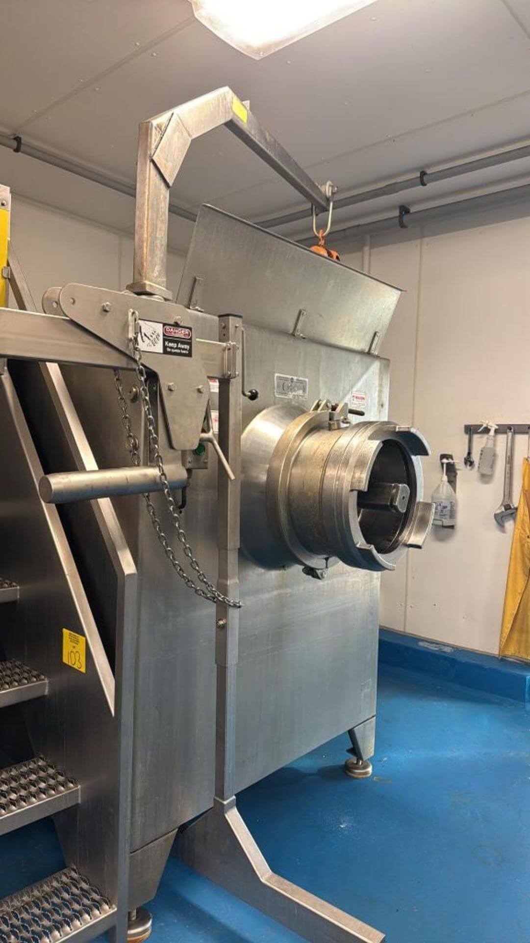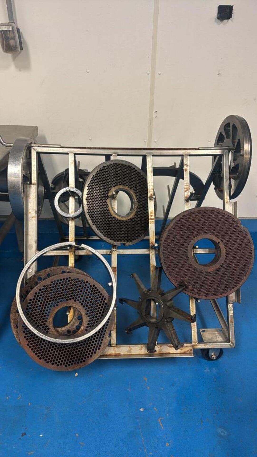 WOLFKING C400 FROZEN BLOCK GRINDER. All stainless steel construction, including auger, barrel and end ring, Includes parts cart with additional plates and knives.