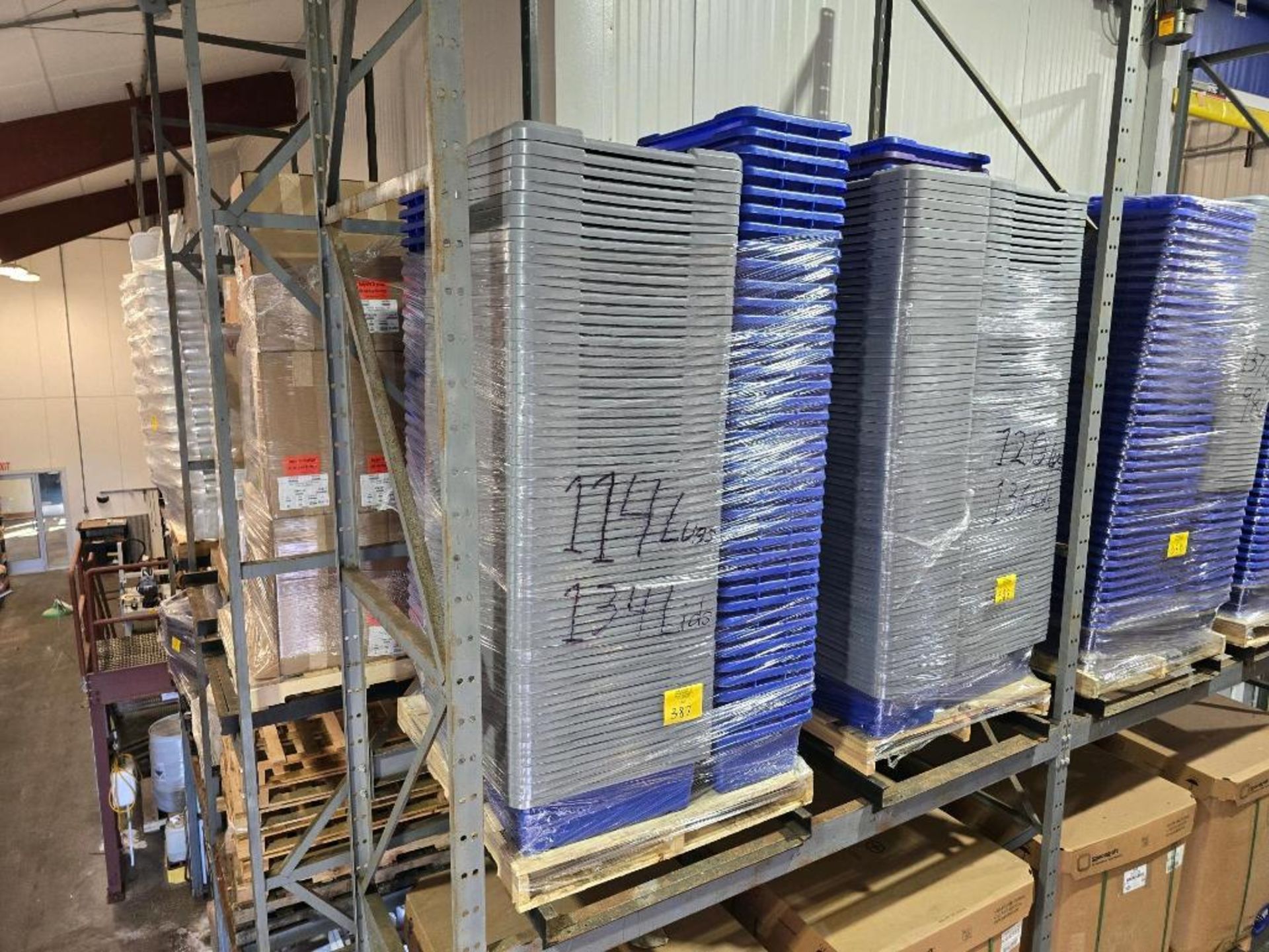(114) BLUE MEAT LUGS WITH (134) GRAY LIDS. The item will be available for sale in ou...